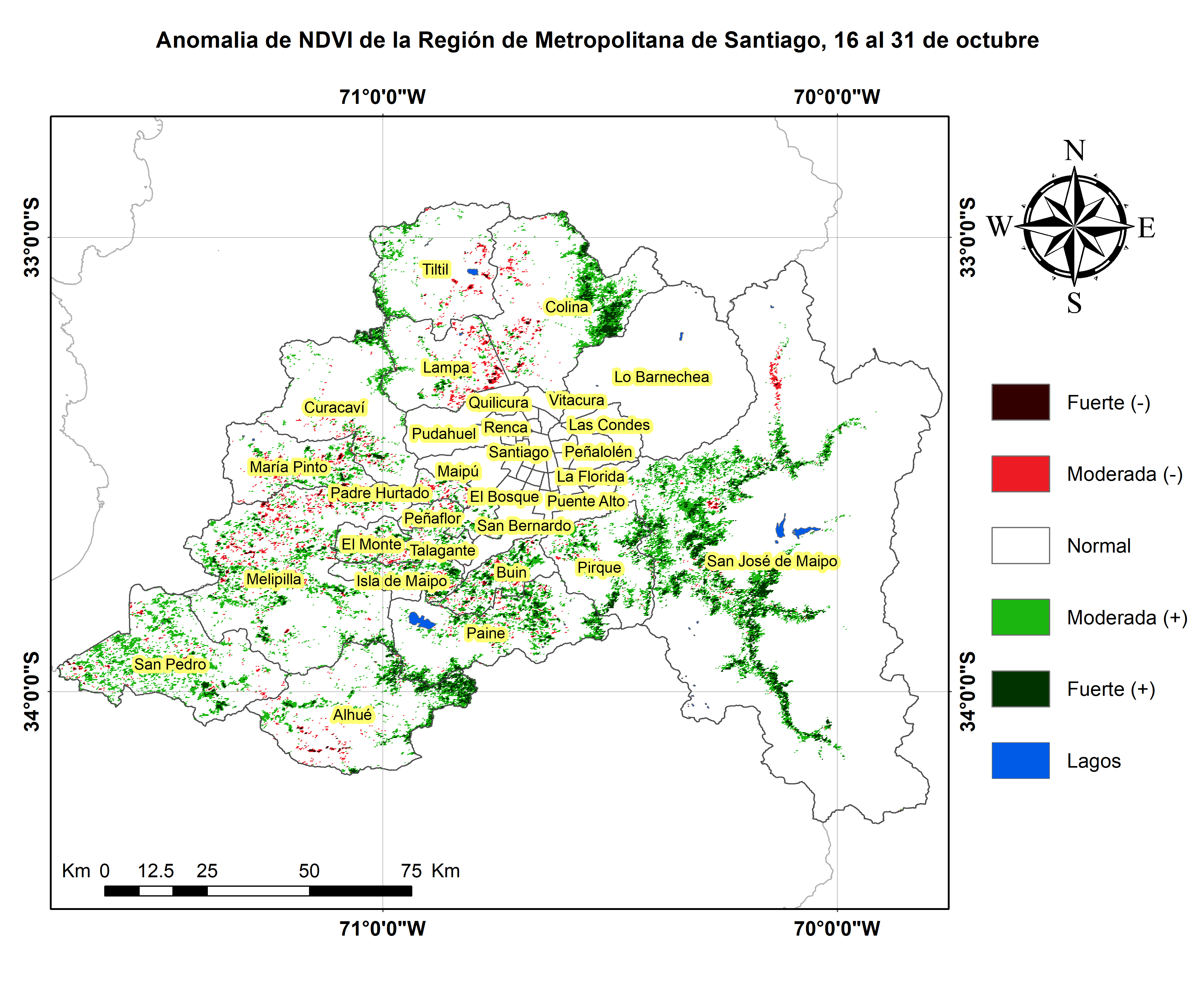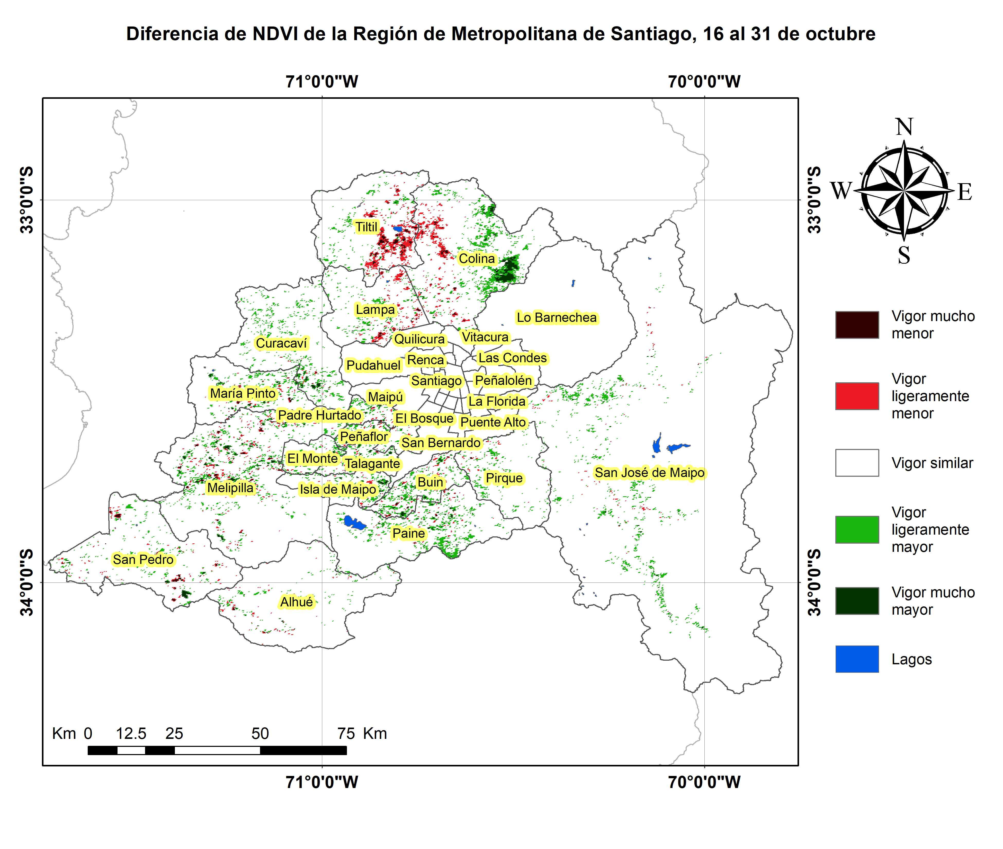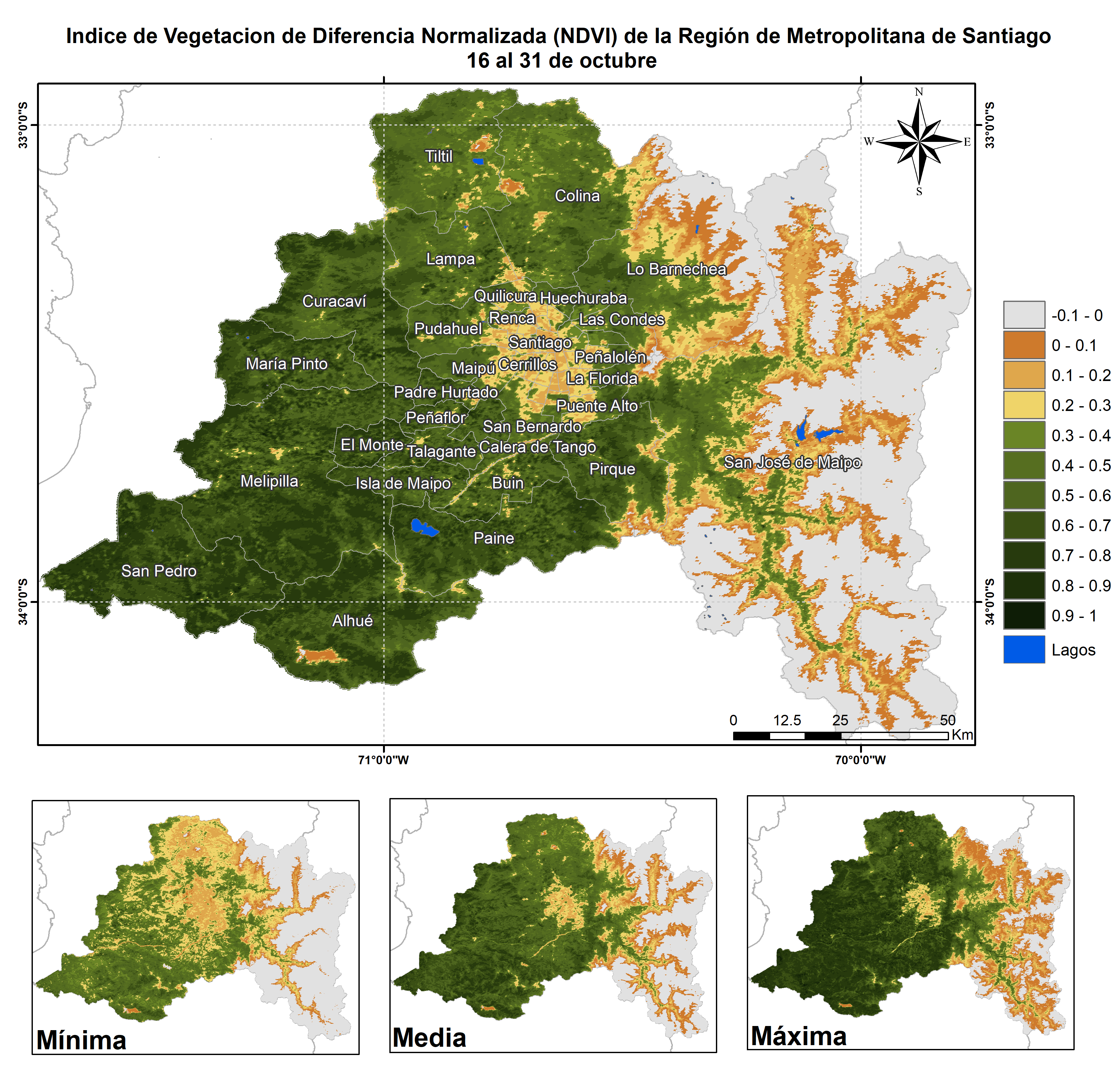 Respecto de la respuesta fisiológica de las plantas al efecto del clima, las imágenes satelitales reflejan la magnitud del crecimiento o disminución de la cobertura vegetal en esta época del año mediante el índice de vegetación NDVI (Desviación Normalizada del Índice de Vegetación).