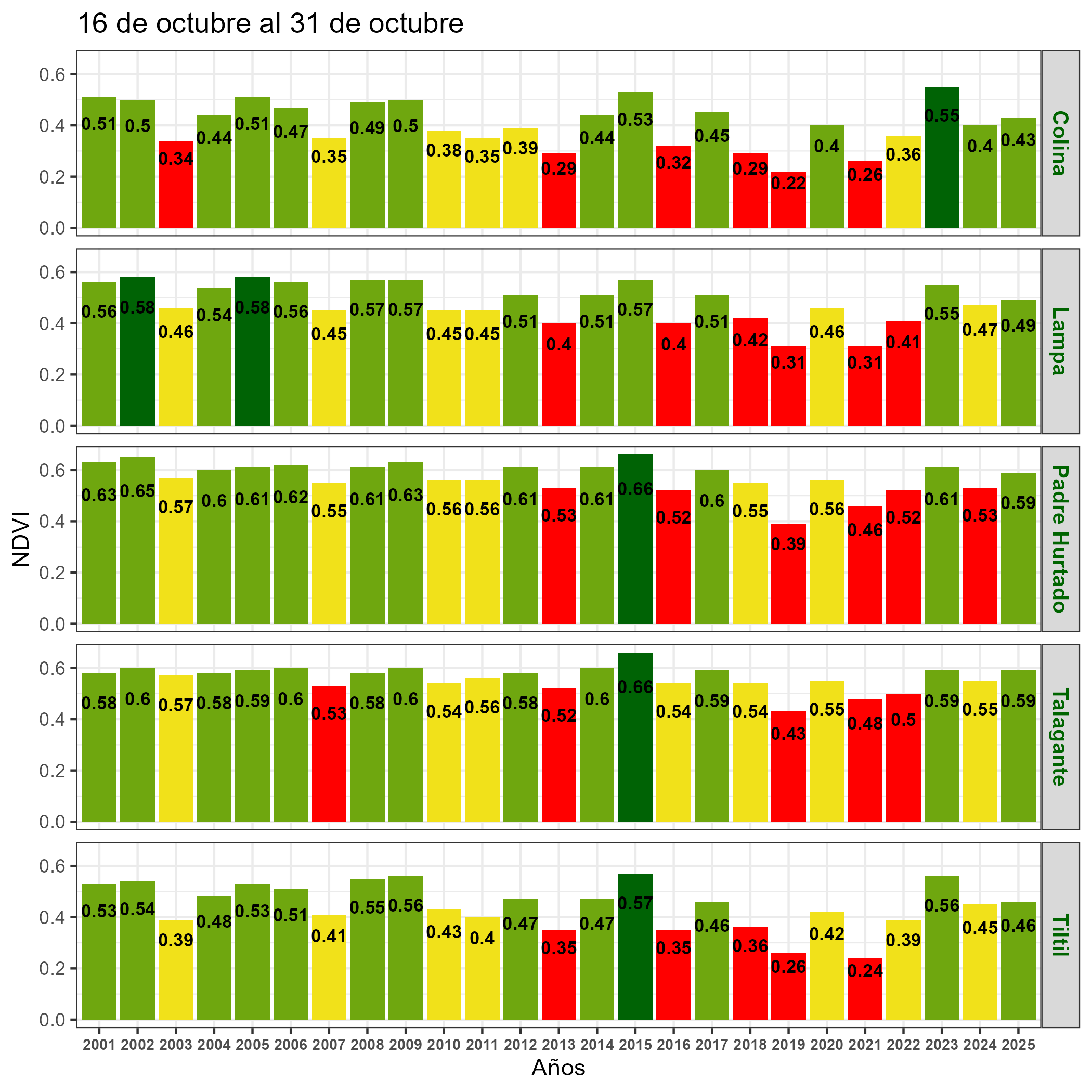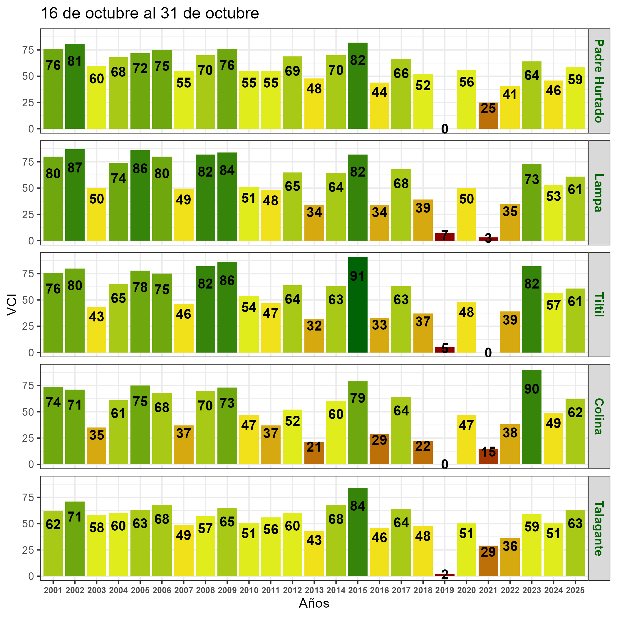 Se aprecia en el indicador de Indice de Condición de la Vegetación (VCI) el cual indica un valor mediano de VCI de 70% para el período comprendido desde el 16 al 31 de Octubre 2025 para la Región Metropolitana ; lo cual indica una condición favorable .