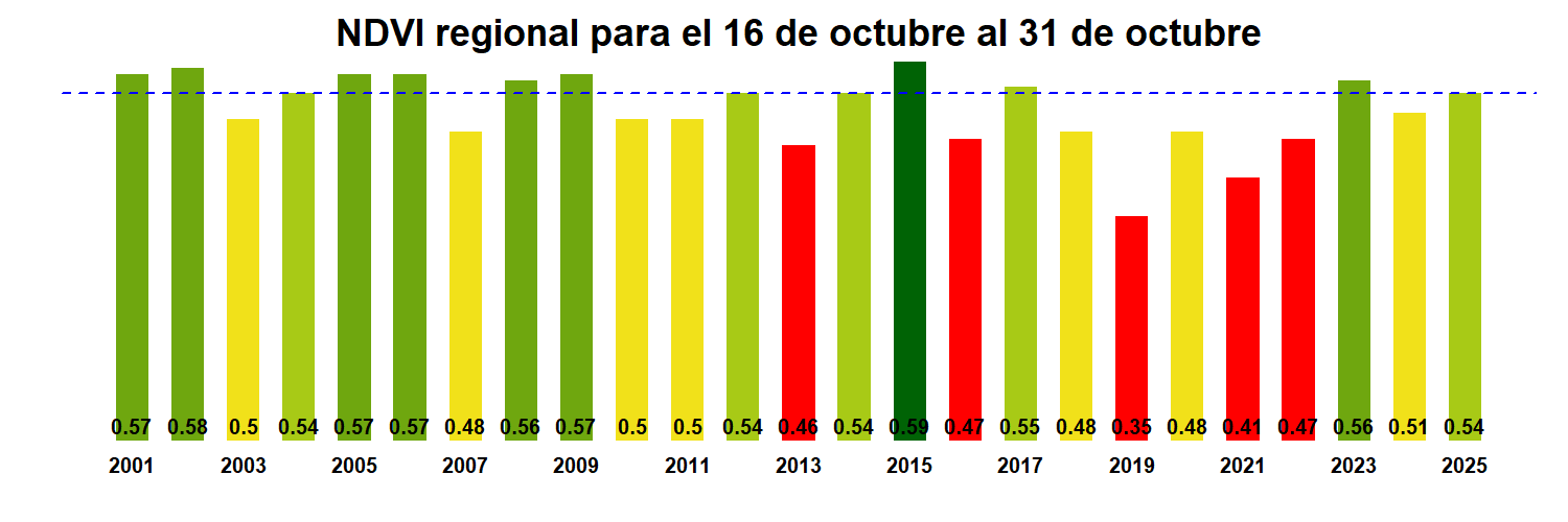 Para esta quincena se observa un NDVI promedio regional de 0.54 mientras el año pasado había sido de 0.51. El valor promedio histórico para esta región, en este período del año es de 0.52.