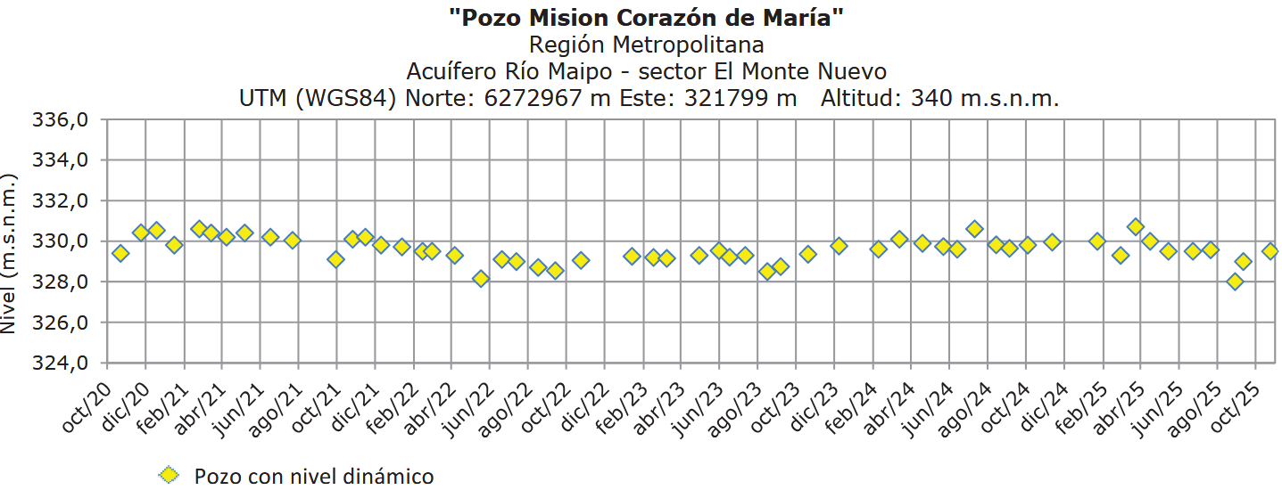 En el acuífero Río Maipo, sector El Monte Nuevo, el pozo Corazón de María se mantiene estable, con niveles dinámicos en torno a 329,5 m.s.n.m., presentando valores similares a los meses previos, lo que equivale a aproximadamente 10,5 m desde la superficie.