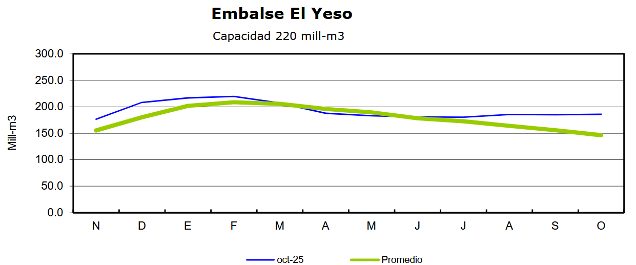 Finalmente, el Embalse El Yeso alcanzó al 31 de octubre un volumen de 185,9 millones de m³, lo que corresponde al 85% de su capacidad total. Este nivel representa un 10,6% más que en octubre de 2024 (168,0 millones m³) y un 27,3% superior al promedio histórico mensual (146 millones m³).