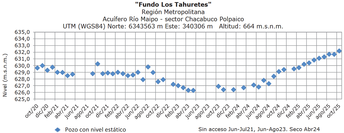 En el sector Chacabuco/Polpaico, el pozo Fundo Los Tahuretes continúa con un claro proceso de recuperación, alcanzando en octubre 2025 un nivel estático cercano a los 632 m.s.n.m., reafirmando la tendencia al alza registrada durante este año, manteniéndose en valores similares a los meses previos.