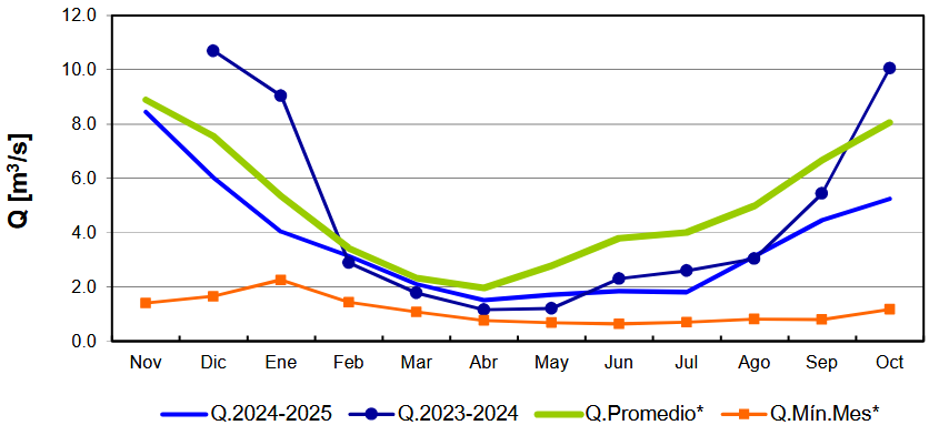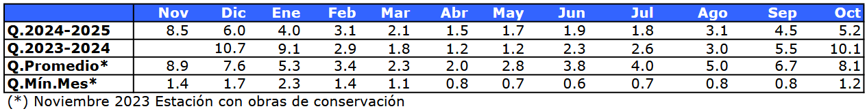 En la estación Almendros Rio Mapocho registra el mes de Octubre 2025 un caudal de 5,2 m3/seg, representa un 35% bajo del caudal promedio histórico. (DGA)