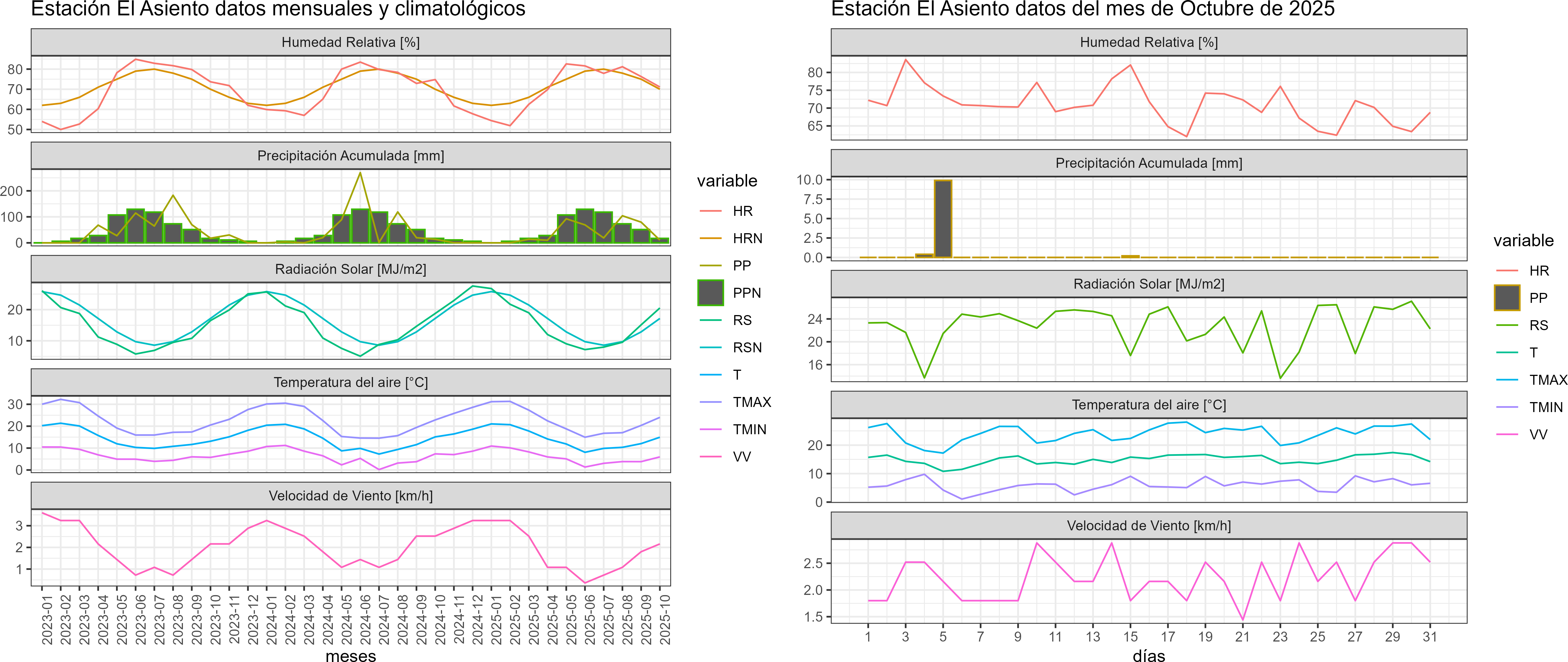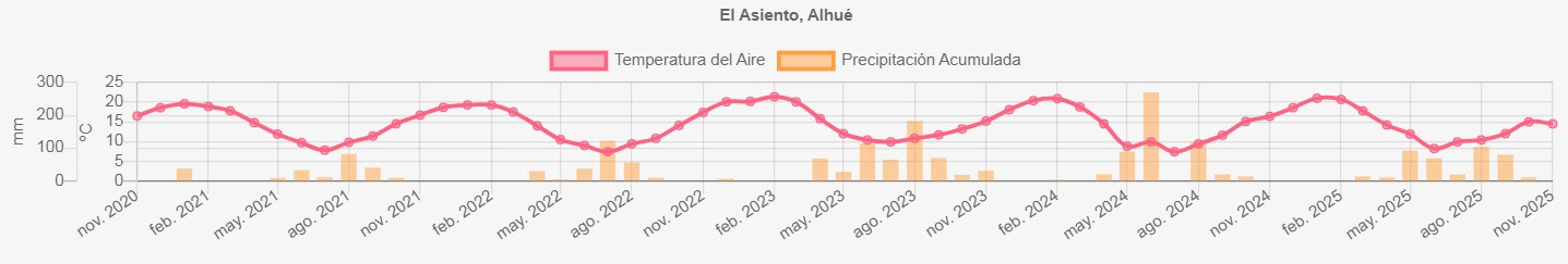 La estación El Asiento corresponde al distrito agroclimático 13-6-1. Para este distrito climático la temperatura mínima, media y máxima climatológicas alcanzan los 6.5°C, 13.8°C y 21.1°C respectivamente. Por su parte, respecto a las temperaturas medidas durante el mes de octubre en la estación: la temperatura mínima alcanzo los 6°C (-0.5°C bajo la climatológica), la temperatura media 14.9°C (1.1°C sobre la climatológica) y la temperatura máxima llegó a los 24°C (2.9°C sobre la climatológica). En el mes de octubre se registró una pluviometría de 10.5 mm, lo cual representa un 36.2% con respecto al mismo mes de un año normal. De enero a octubre se ha registrado un total acumulado de 398.5 mm, en circunstancias que un año normal registraría a la fecha 547 mm, lo que representa un déficit de 27.1%. A la misma fecha, durante el año 2024 la precipitación alcanzaba los 13.6 mm.