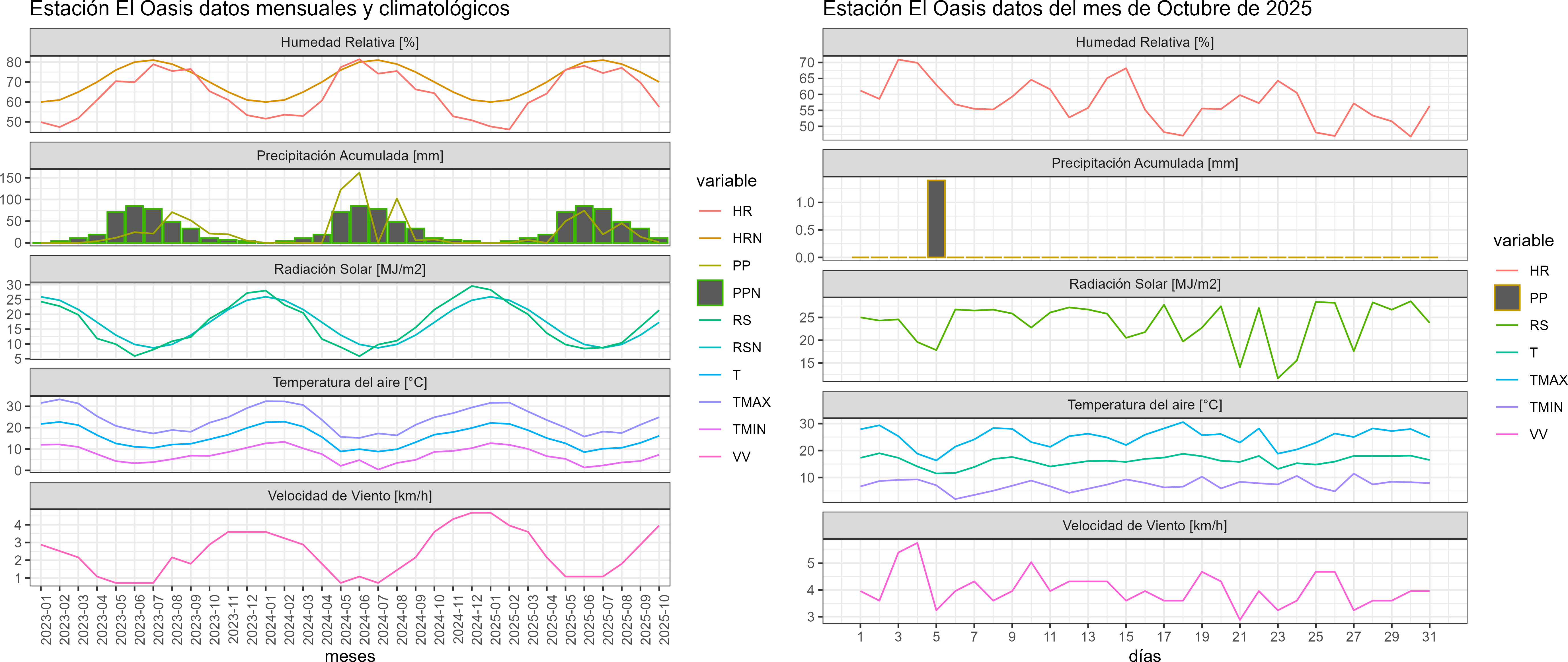 La estación El Oasis corresponde al distrito agroclimático 13-2. Para este distrito climático la temperatura mínima, media y máxima climatológicas alcanzan los 7°C, 15.5°C y 24.1°C respectivamente. Por su parte, respecto a las temperaturas medidas durante el mes de octubre en la estación: la temperatura mínima alcanzo los 7.3°C (0.3°C sobre la climatológica), la temperatura media 16.2°C (0.7°C sobre la climatológica) y la temperatura máxima llegó a los 24.9°C (0.8°C sobre la climatológica). En el mes de octubre se registró una pluviometría de 1.4 mm, lo cual representa un 6.7% con respecto al mismo mes de un año normal. De enero a octubre se ha registrado un total acumulado de 210.7 mm, en circunstancias que un año normal registraría a la fecha 322 mm, lo que representa un déficit de 34.6%. A la misma fecha, durante el año 2024 la precipitación alcanzaba los 7.9 mm.