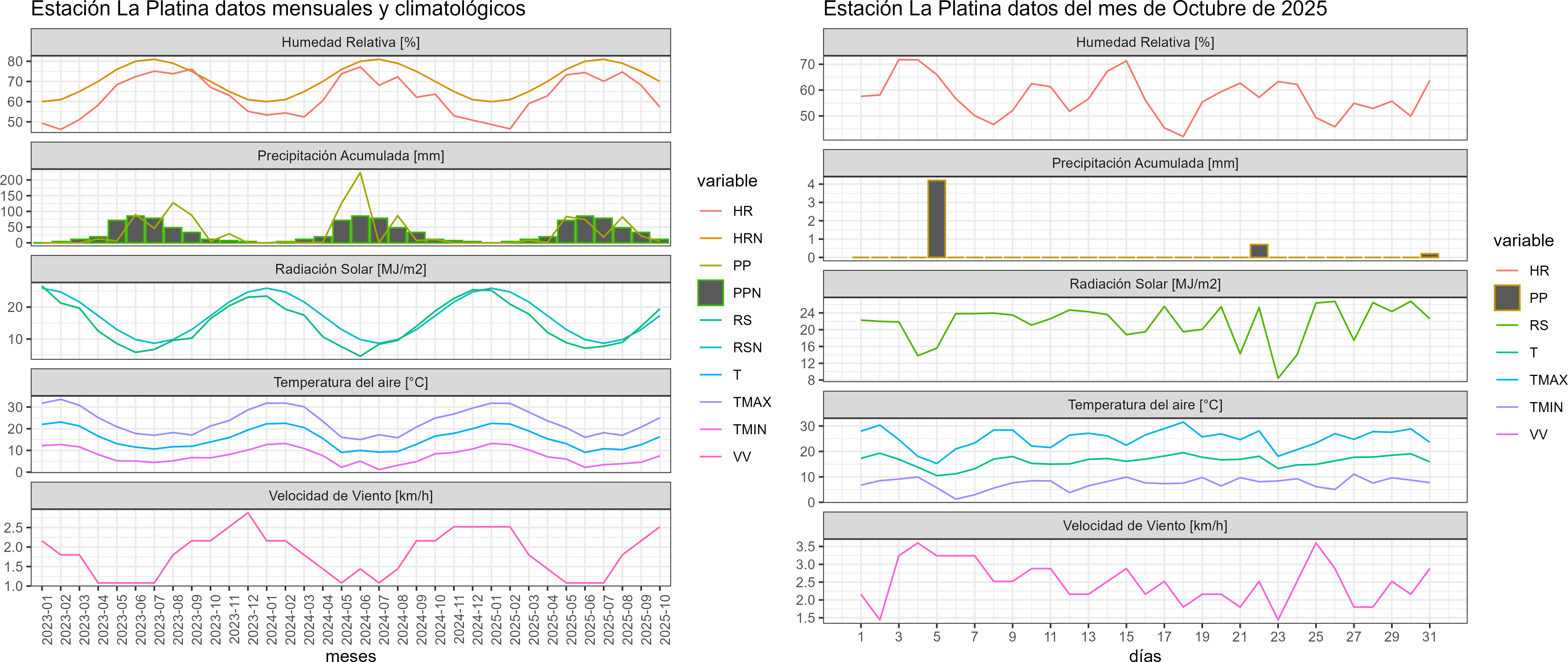 La estación La Platina corresponde al distrito agroclimático 13-2. Para este distrito climático la temperatura mínima, media y máxima climatológicas alcanzan los 7.2°C, 14.8°C y 22.3°C respectivamente. Por su parte, respecto a las temperaturas medidas durante el mes de octubre en la estación: la temperatura mínima alcanzo los 7.5°C (0.3°C sobre la climatológica), la temperatura media 16.3°C (1.5°C sobre la climatológica) y la temperatura máxima llegó a los 25.1°C (2.8°C sobre la climatológica). En el mes de octubre se registró una pluviometría de 5.1 mm, lo cual representa un 19.6% con respecto al mismo mes de un año normal. De enero a octubre se ha registrado un total acumulado de 294.6 mm, en circunstancias que un año normal registraría a la fecha 425 mm, lo que representa un déficit de 30.7%. A la misma fecha, durante el año 2024 la precipitación alcanzaba los 10.7 mm.