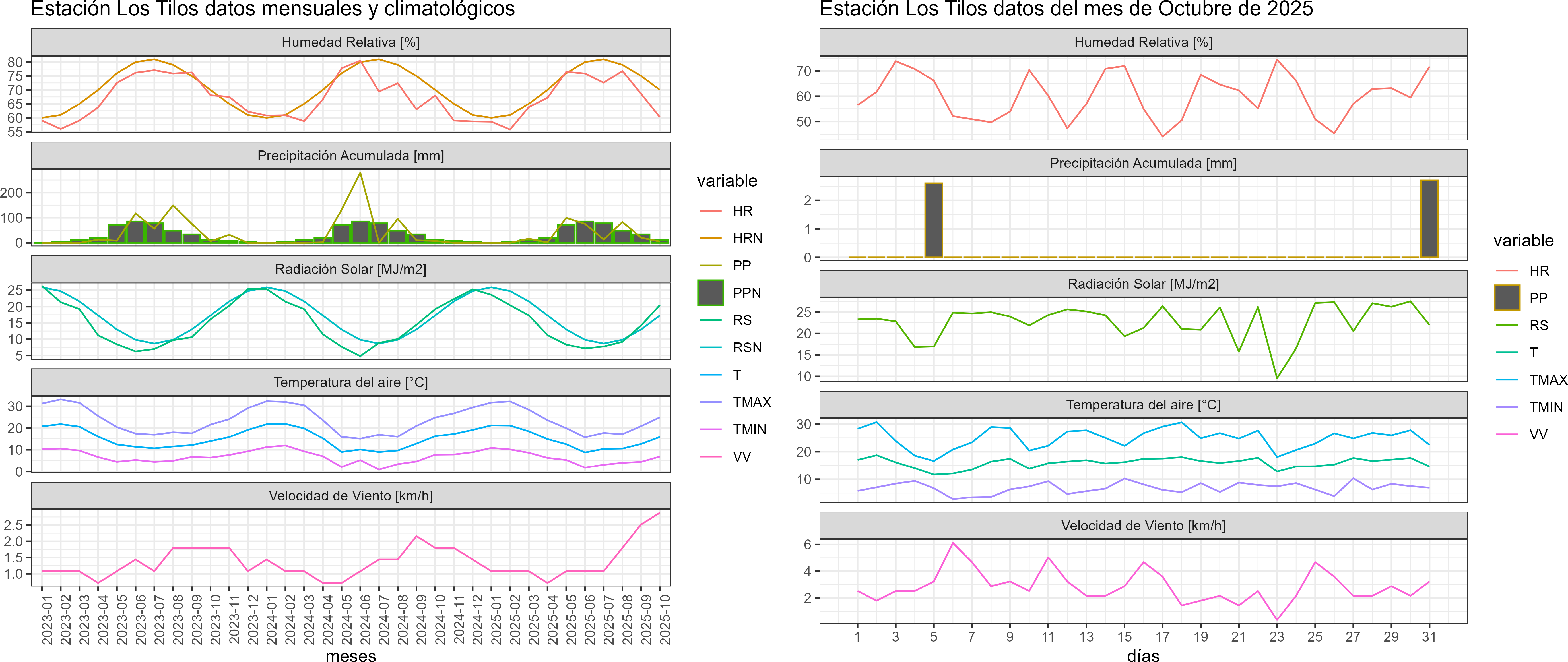 La estación Los Tilos corresponde al distrito agroclimático 13-2. Para este distrito climático la temperatura mínima, media y máxima climatológicas alcanzan los 7.1°C, 15.5°C y 23.8°C respectivamente. Por su parte, respecto a las temperaturas medidas durante el mes de octubre en la estación: la temperatura mínima alcanzo los 6.9°C (-0.2°C bajo la climatológica), la temperatura media 15.9°C (0.4°C sobre la climatológica) y la temperatura máxima llegó a los 24.9°C (1.1°C sobre la climatológica). En el mes de octubre se registró una pluviometría de 5.3 mm, lo cual representa un 21.2% con respecto al mismo mes de un año normal. De enero a octubre se ha registrado un total acumulado de 315.4 mm, en circunstancias que un año normal registraría a la fecha 448 mm, lo que representa un déficit de 29.6%. A la misma fecha, durante el año 2024 la precipitación alcanzaba los 7.6 mm.