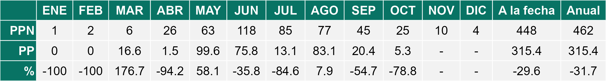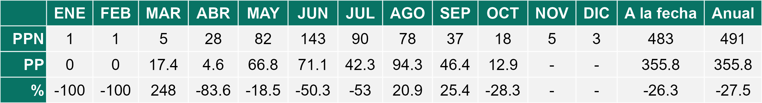 Durante el mes de Octubre 2025 se registraron precipitaciones leves; con un promedio regional acumulado de 311 mm. Registro 7 mm superior sobre el mes anterior.