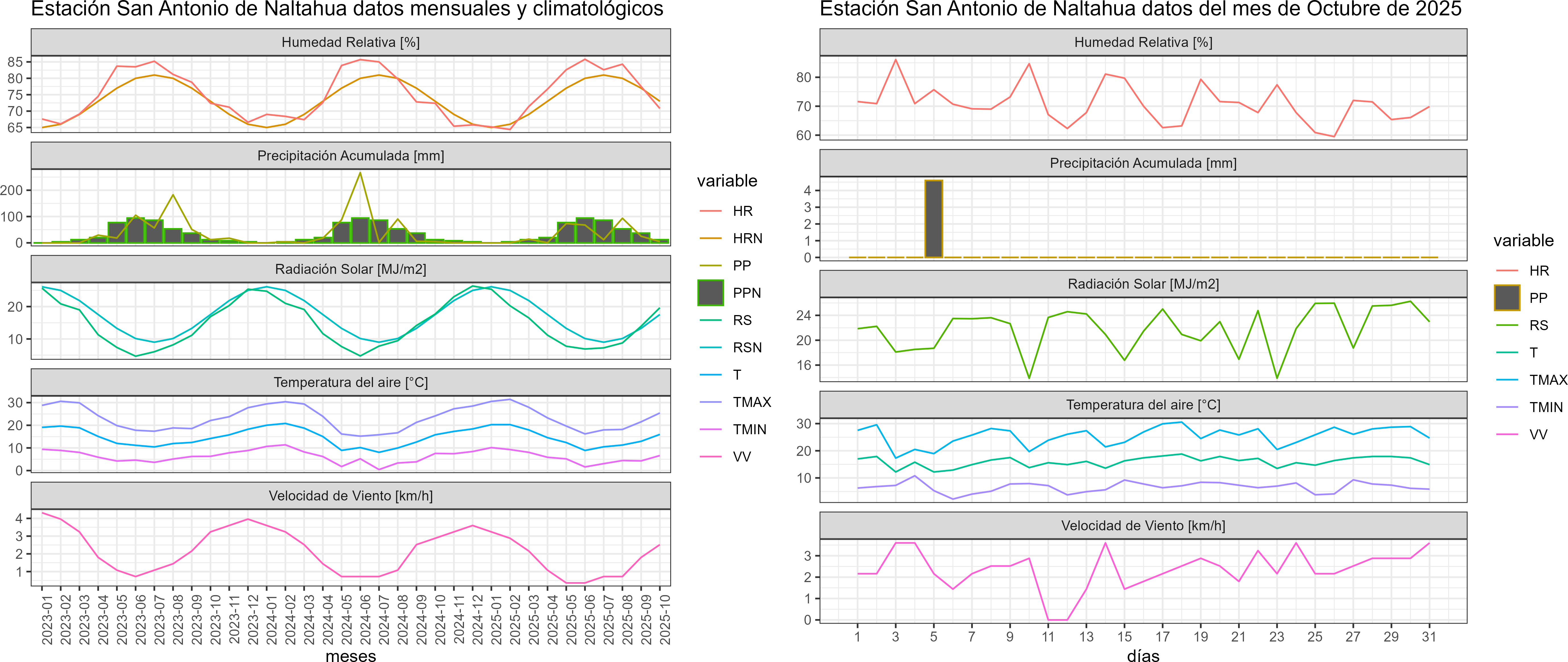 La estación San Antonio de Naltahua corresponde al distrito agroclimático 13-1. Para este distrito climático la temperatura mínima, media y máxima climatológicas alcanzan los 6.8°C, 15.3°C y 23.8°C respectivamente. Por su parte, respecto a las temperaturas medidas durante el mes de octubre en la estación: la temperatura mínima alcanzo los 6.6°C (-0.2°C bajo la climatológica), la temperatura media 16°C (0.7°C sobre la climatológica) y la temperatura máxima llegó a los 25.4°C (1.6°C sobre la climatológica). En el mes de octubre se registró una pluviometría de 4.6 mm, lo cual representa un 27.1% con respecto al mismo mes de un año normal. De enero a octubre se ha registrado un total acumulado de 290.7 mm, en circunstancias que un año normal registraría a la fecha 457 mm, lo que representa un déficit de 36.4%. A la misma fecha, durante el año 2024 la precipitación alcanzaba los 4.7 mm.