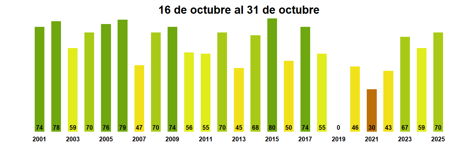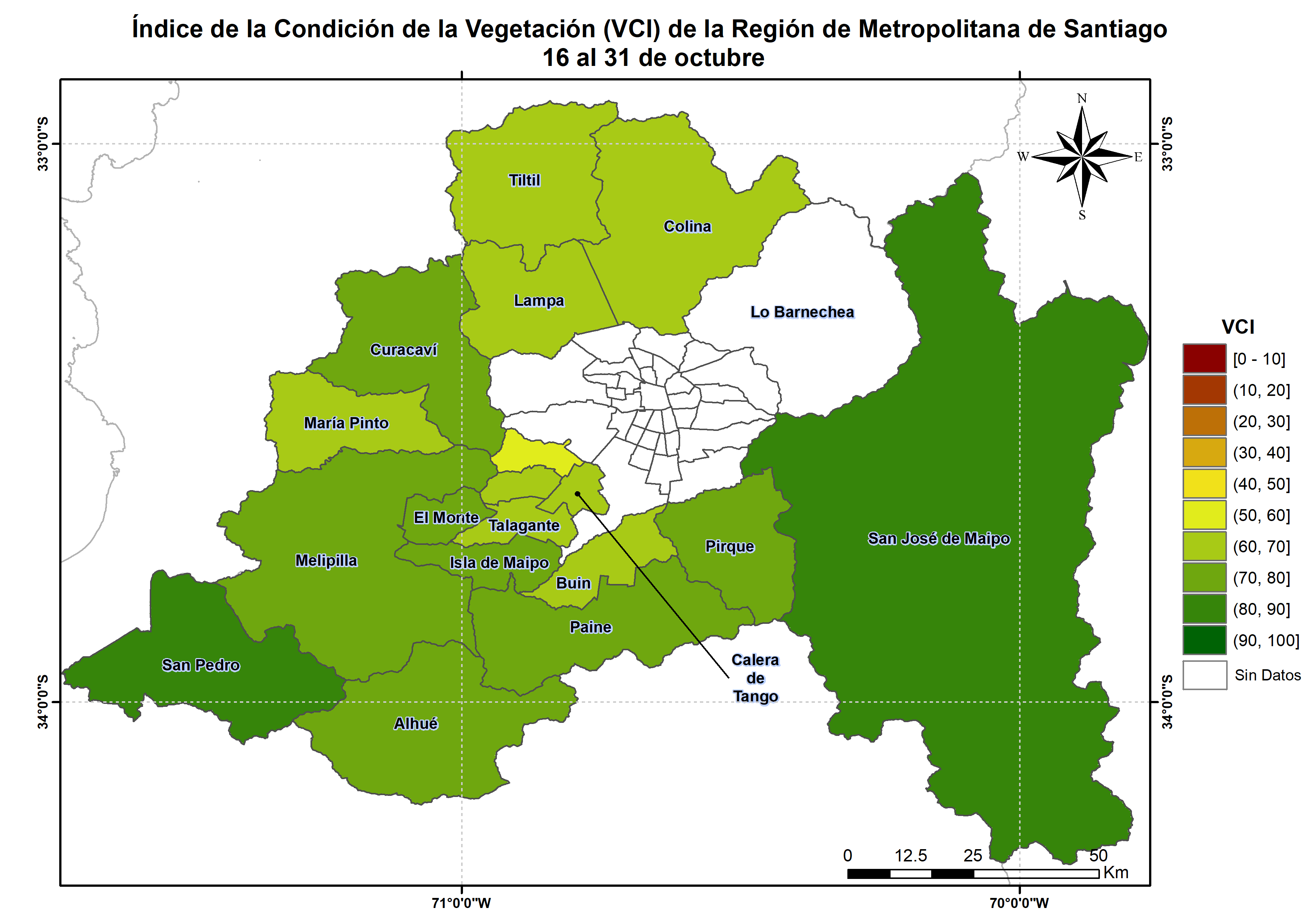 En términos globales la Región presentó un valor mediano de VCI de 70% para el período comprendido desde el 16 al 31 de octubre. A igual período del año pasado presentaba un VCI de 59% (Fig. 1). De acuerdo a la Tabla 1 la Región Metropolitana, en términos globales presenta una condición Favorable.