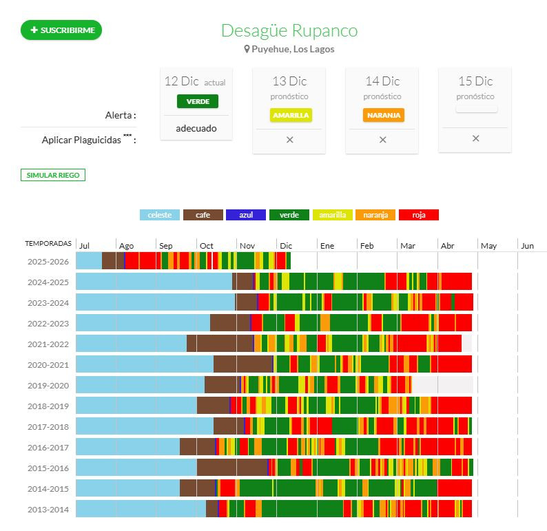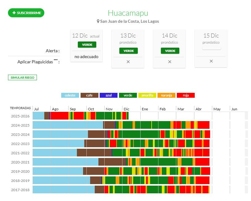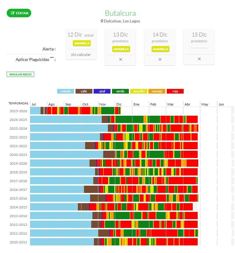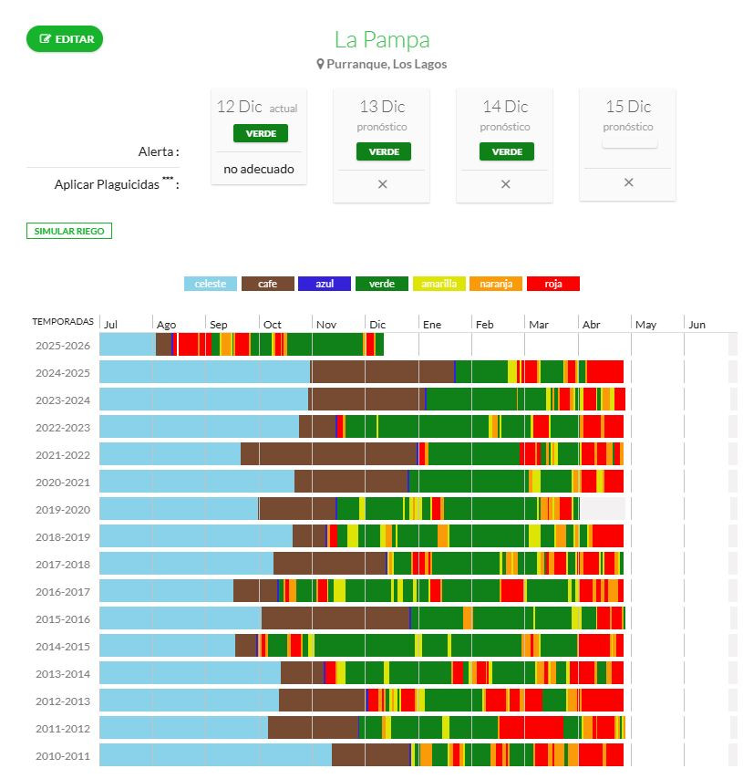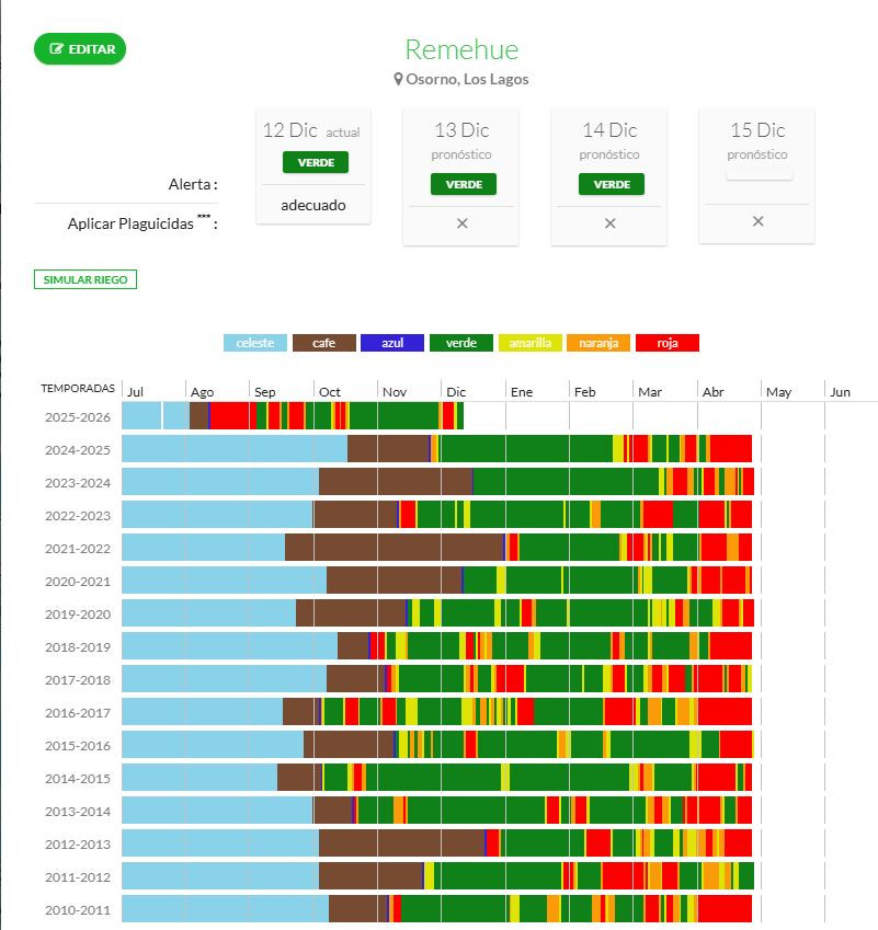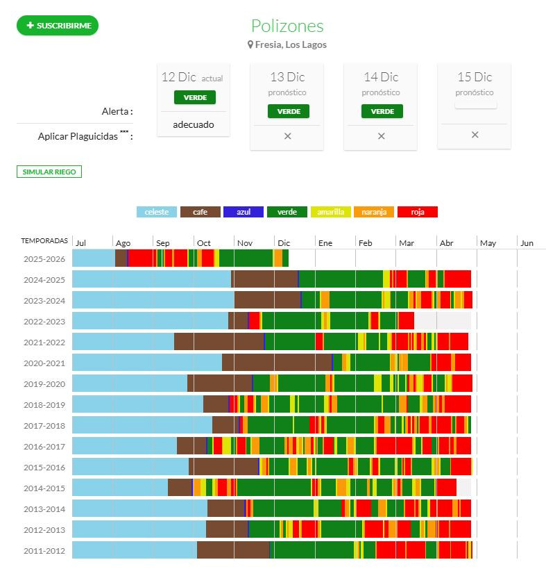 Es importante destacar que el uso de las alertas tempranas es una herramienta de apoyo para realizar control químico preventivo de la enfermedad, es decir, previo a la infección y presencia de síntomas en las plantas, por lo que la aplicación de fungicidas se debe realizar dentro de 24 a 48 horas desde el día de la alerta de condiciones favorables. Si esta aplicación no se realiza dentro de este período, y la condición favorable persiste durante estos 2 días, se asume que se ha producido una infección y se debe realizar un control químico con productos de acción curativa, para evitar la presencia de síntomas. Es necesario considerar que una vez que se produce la infección y el desarrollo de la enfermedad en el cultivo, es muy difícil su erradicación.