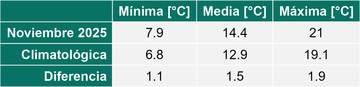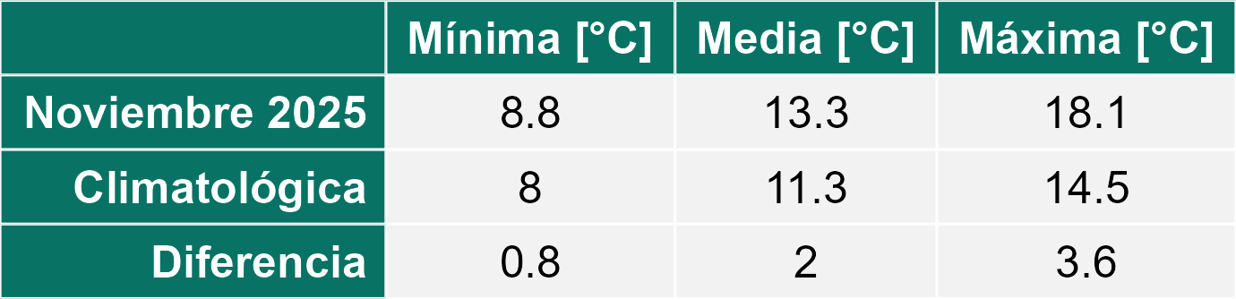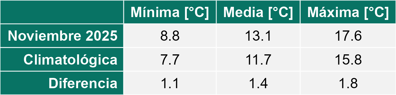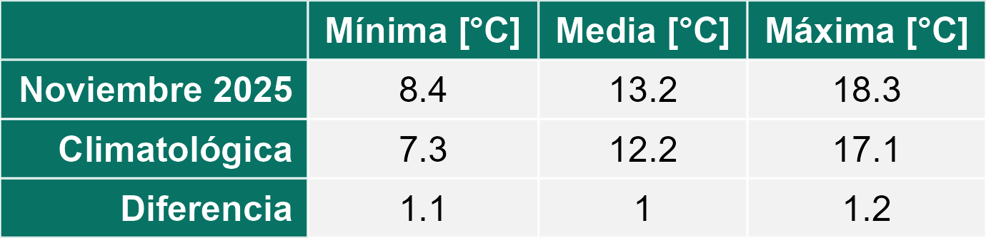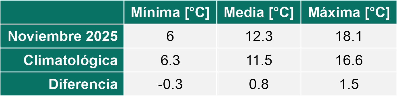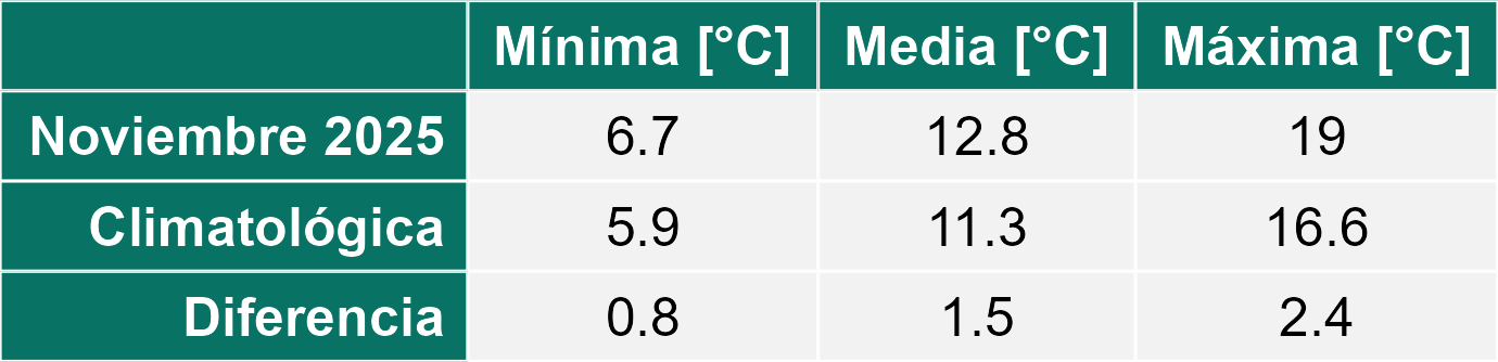 La estación Remehue corresponde al distrito agroclimático 14-10-2. Para este distrito climático la temperatura mínima, media y máxima climatológicas alcanzan los 6.8°C, 12.9°C y 19.1°C respectivamente. Por su parte, respecto a las temperaturas medidas durante el mes de noviembre en la estación: la temperatura mínima alcanzo los 7.9°C (1.1°C sobre la climatológica), la temperatura media 14.4°C (1.5°C sobre la climatológica) y la temperatura máxima llegó a los 21°C (1.9°C sobre la climatológica). En el mes de noviembre se registró una pluviometría de 23.1 mm, lo cual representa un 37.9% con respecto al mismo mes de un año normal. De enero a noviembre se ha registrado un total acumulado de 968.3 mm, en circunstancias que un año normal registraría a la fecha 1224 mm, lo que representa un déficit de 20.9%. A la misma fecha, durante el año 2024 la precipitación alcanzaba los 107.6 mm.