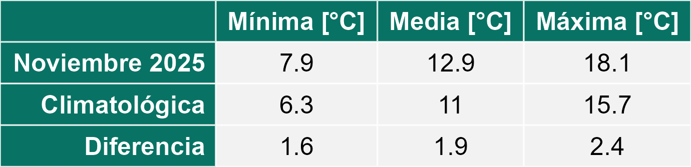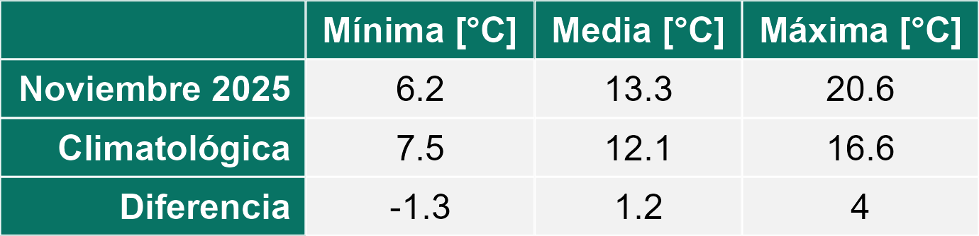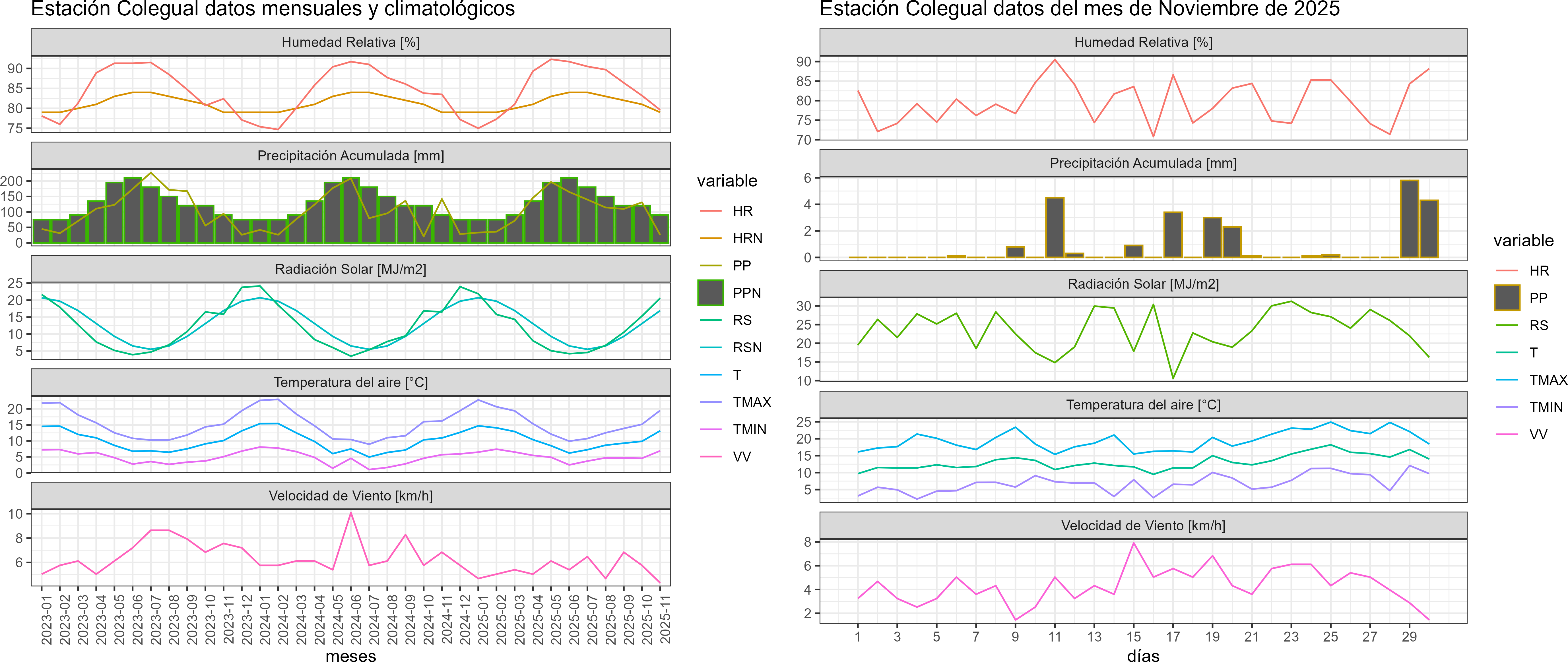 La estación Colegual corresponde al distrito agroclimático 14-10-1. Para este distrito climático la temperatura mínima, media y máxima climatológicas alcanzan los 6.3°C, 11.8°C y 17.3°C respectivamente. Por su parte, respecto a las temperaturas medidas durante el mes de noviembre en la estación: la temperatura mínima alcanzo los 6.9°C (0.6°C sobre la climatológica), la temperatura media 13.2°C (1.4°C sobre la climatológica) y la temperatura máxima llegó a los 19.5°C (2.2°C sobre la climatológica). En el mes de noviembre se registró una pluviometría de 25.8 mm, lo cual representa un 28.7% con respecto al mismo mes de un año normal. De enero a noviembre se ha registrado un total acumulado de 1168.4 mm, en circunstancias que un año normal registraría a la fecha 1495 mm, lo que representa un déficit de 21.8%. A la misma fecha, durante el año 2024 la precipitación alcanzaba los 141.9 mm.