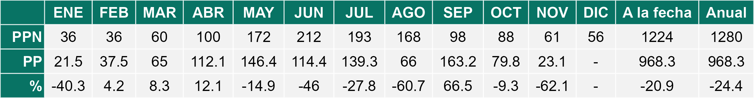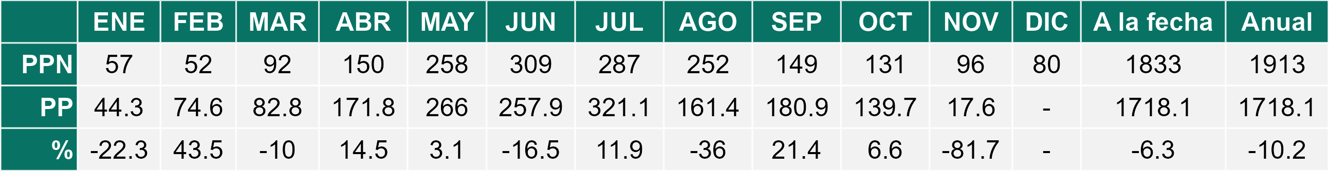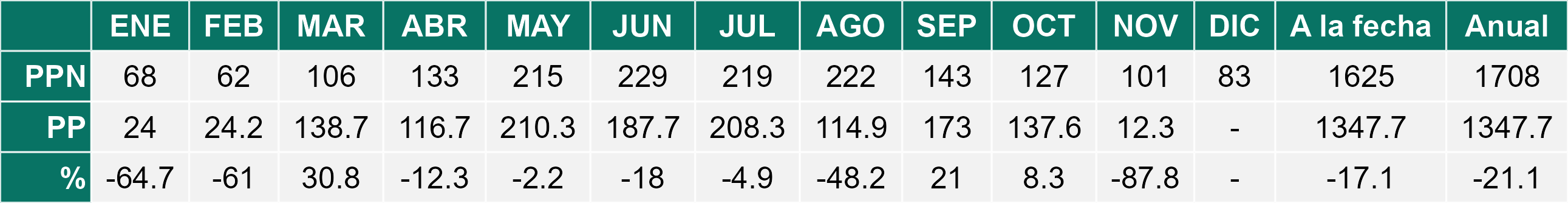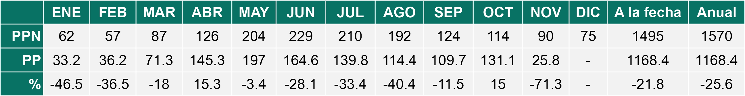 La estación Pid-Pid corresponde al distrito agroclimático 10-4. Para este distrito climático la temperatura mínima, media y máxima climatológicas alcanzan los 5.9°C, 11.3°C y 16.6°C respectivamente. Por su parte, respecto a las temperaturas medidas durante el mes de noviembre en la estación: la temperatura mínima alcanzo los 6.7°C (0.8°C sobre la climatológica), la temperatura media 12.8°C (1.5°C sobre la climatológica) y la temperatura máxima llegó a los 19°C (2.4°C sobre la climatológica). En el mes de noviembre se registró una pluviometría de 23.2 mm, lo cual representa un 19.3% con respecto al mismo mes de un año normal. De enero a noviembre se ha registrado un total acumulado de 1583.6 mm, en circunstancias que un año normal registraría a la fecha 1898 mm, lo que representa un déficit de 16.6%. A la misma fecha, durante el año 2024 la precipitación alcanzaba los 0 mm.