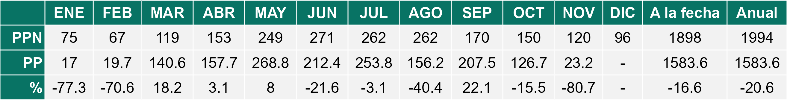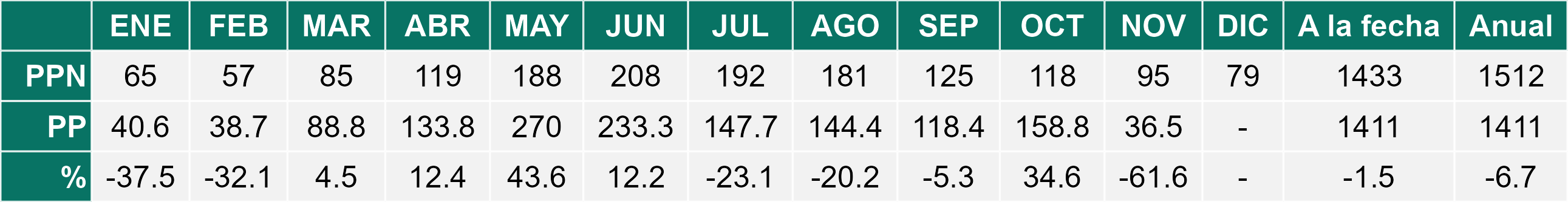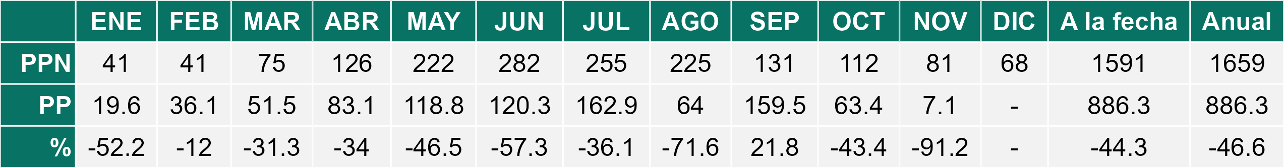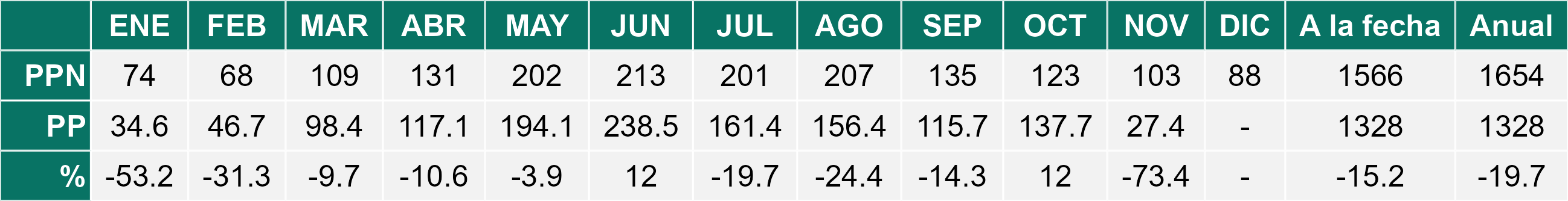 La estación Pid-Pid corresponde al distrito agroclimático 10-4. Para este distrito climático la temperatura mínima, media y máxima climatológicas alcanzan los 5.9°C, 11.3°C y 16.6°C respectivamente. Por su parte, respecto a las temperaturas medidas durante el mes de noviembre en la estación: la temperatura mínima alcanzo los 6.7°C (0.8°C sobre la climatológica), la temperatura media 12.8°C (1.5°C sobre la climatológica) y la temperatura máxima llegó a los 19°C (2.4°C sobre la climatológica). En el mes de noviembre se registró una pluviometría de 23.2 mm, lo cual representa un 19.3% con respecto al mismo mes de un año normal. De enero a noviembre se ha registrado un total acumulado de 1583.6 mm, en circunstancias que un año normal registraría a la fecha 1898 mm, lo que representa un déficit de 16.6%. A la misma fecha, durante el año 2024 la precipitación alcanzaba los 0 mm.