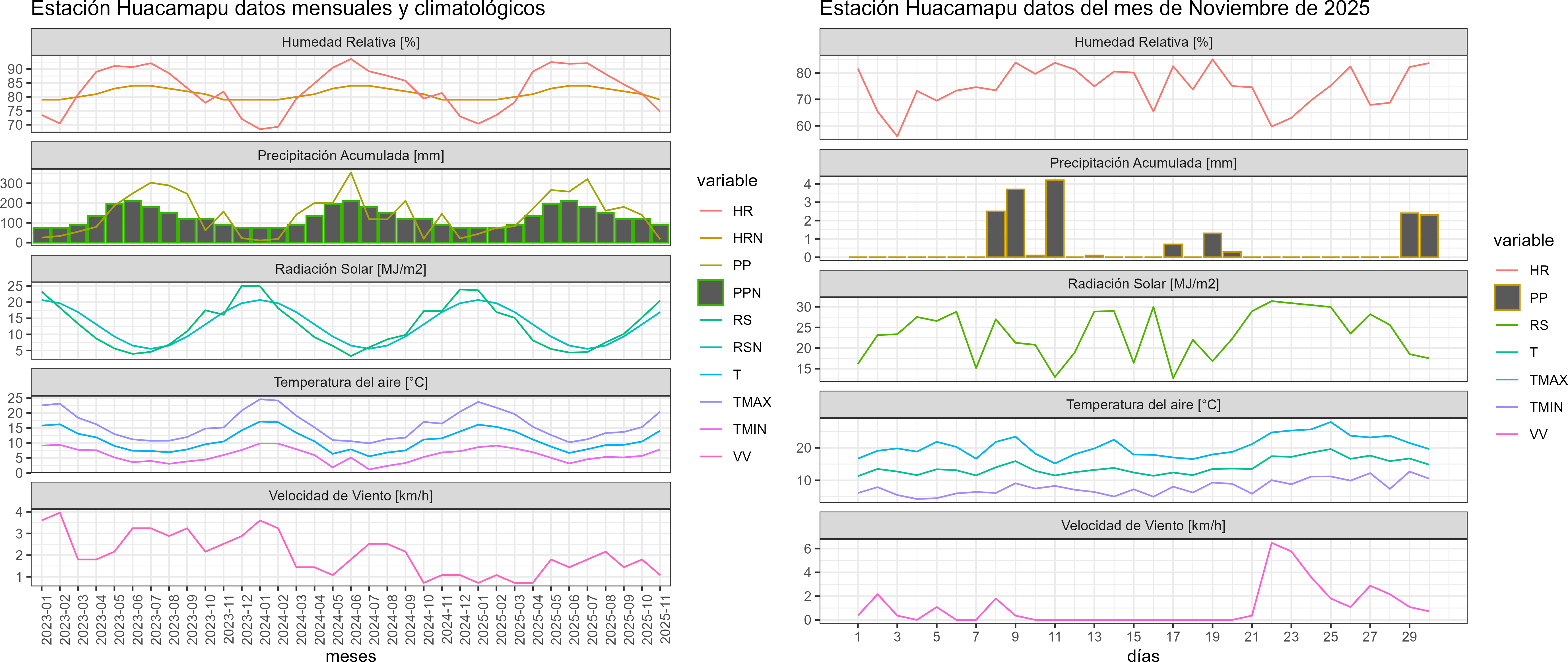 La estación Huacamapu corresponde al distrito agroclimático 14-10-1. Para este distrito climático la temperatura mínima, media y máxima climatológicas alcanzan los 6.3°C, 11.6°C y 16.9°C respectivamente. Por su parte, respecto a las temperaturas medidas durante el mes de noviembre en la estación: la temperatura mínima alcanzo los 7.8°C (1.5°C sobre la climatológica), la temperatura media 14.1°C (2.5°C sobre la climatológica) y la temperatura máxima llegó a los 20.5°C (3.6°C sobre la climatológica). En el mes de noviembre se registró una pluviometría de 17.6 mm, lo cual representa un 18.3% con respecto al mismo mes de un año normal. De enero a noviembre se ha registrado un total acumulado de 1718.1 mm, en circunstancias que un año normal registraría a la fecha 1833 mm, lo que representa un déficit de 6.3%. A la misma fecha, durante el año 2024 la precipitación alcanzaba los 145.2 mm.