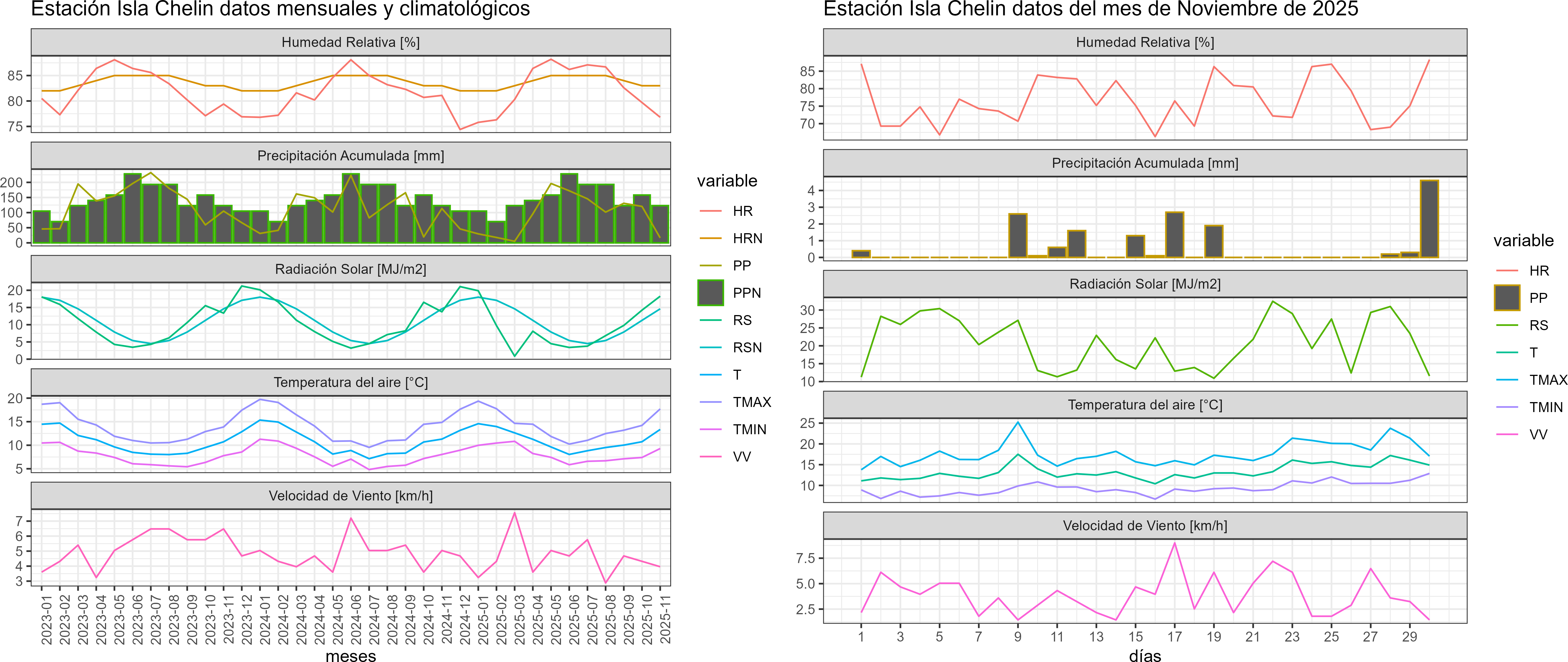 La estación Isla Chelin corresponde al distrito agroclimático 10-4. Para este distrito climático la temperatura mínima, media y máxima climatológicas alcanzan los 7.8°C, 11.5°C y 15.2°C respectivamente. Por su parte, respecto a las temperaturas medidas durante el mes de noviembre en la estación: la temperatura mínima alcanzo los 9.3°C (1.5°C sobre la climatológica), la temperatura media 13.4°C (1.9°C sobre la climatológica) y la temperatura máxima llegó a los 17.7°C (2.5°C sobre la climatológica). En el mes de noviembre se registró una pluviometría de 16.4 mm, lo cual representa un 17.3% con respecto al mismo mes de un año normal. De enero a noviembre se ha registrado un total acumulado de 1032 mm, en circunstancias que un año normal registraría a la fecha 1509 mm, lo que representa un déficit de 31.6%. A la misma fecha, durante el año 2024 la precipitación alcanzaba los 113.5 mm.