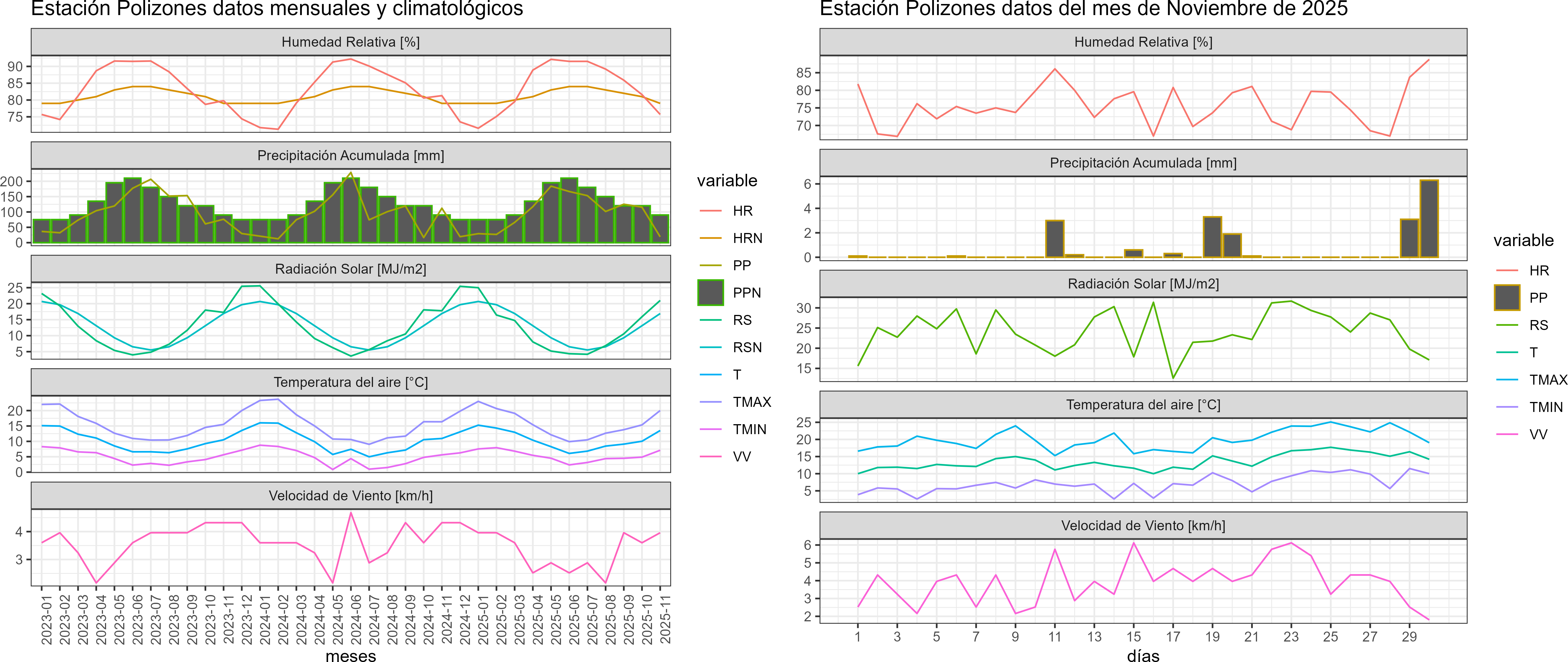 La estación Polizones corresponde al distrito agroclimático 14-10-1. Para este distrito climático la temperatura mínima, media y máxima climatológicas alcanzan los 6.2°C, 11.8°C y 17.3°C respectivamente. Por su parte, respecto a las temperaturas medidas durante el mes de noviembre en la estación: la temperatura mínima alcanzo los 7.1°C (0.9°C sobre la climatológica), la temperatura media 13.5°C (1.7°C sobre la climatológica) y la temperatura máxima llegó a los 20°C (2.7°C sobre la climatológica). En el mes de noviembre se registró una pluviometría de 19 mm, lo cual representa un 21.3% con respecto al mismo mes de un año normal. De enero a noviembre se ha registrado un total acumulado de 1104.2 mm, en circunstancias que un año normal registraría a la fecha 1515 mm, lo que representa un déficit de 27.1%. A la misma fecha, durante el año 2024 la precipitación alcanzaba los 112.2 mm.