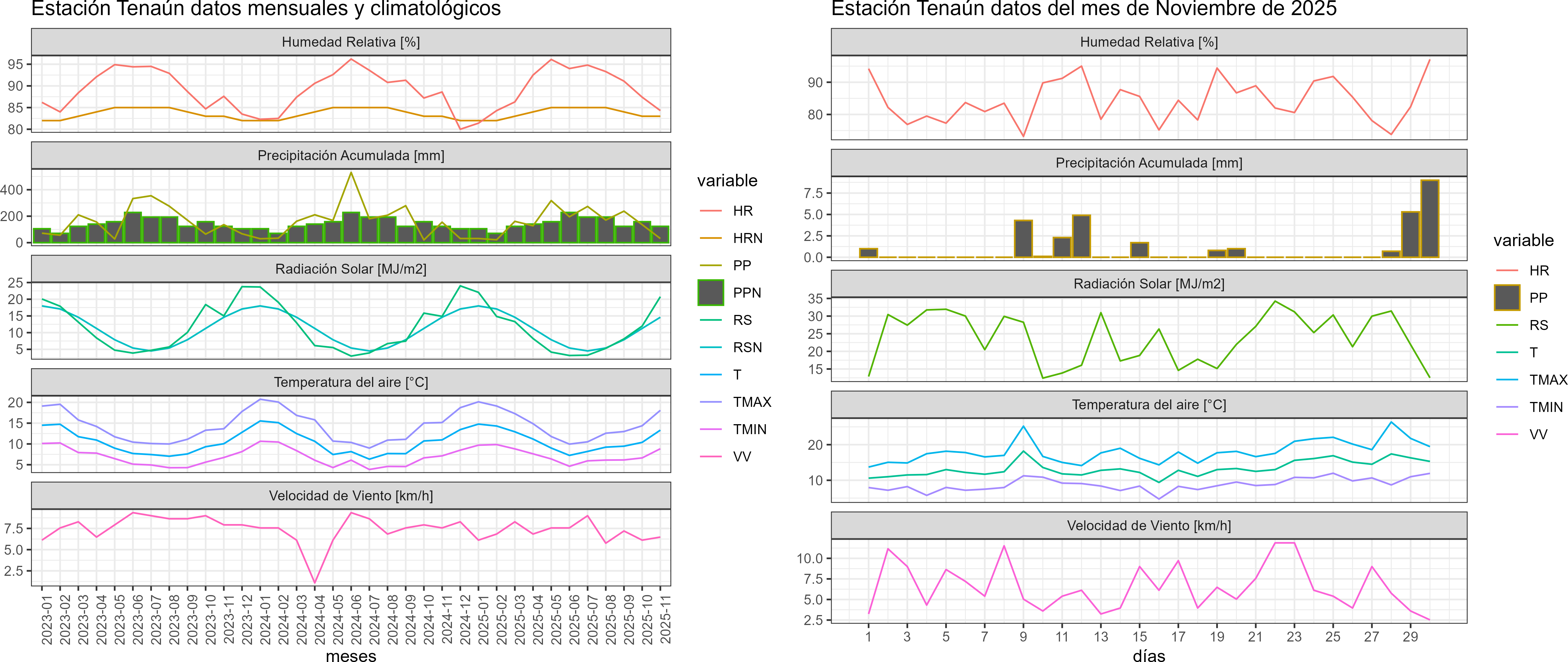 La estación Tenaún corresponde al distrito agroclimático 10-4. Para este distrito climático la temperatura mínima, media y máxima climatológicas alcanzan los 8°C, 11.3°C y 14.5°C respectivamente. Por su parte, respecto a las temperaturas medidas durante el mes de noviembre en la estación: la temperatura mínima alcanzo los 8.8°C (0.8°C sobre la climatológica), la temperatura media 13.3°C (2°C sobre la climatológica) y la temperatura máxima llegó a los 18.1°C (3.6°C sobre la climatológica). En el mes de noviembre se registró una pluviometría de 31.1 mm, lo cual representa un 27.5% con respecto al mismo mes de un año normal. De enero a noviembre se ha registrado un total acumulado de 1703.9 mm, en circunstancias que un año normal registraría a la fecha 1790 mm, lo que representa un déficit de 4.8%. A la misma fecha, durante el año 2024 la precipitación alcanzaba los 154.7 mm.