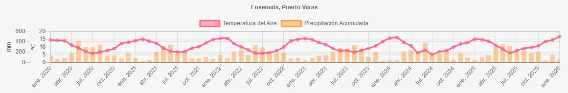 Temperaturas y precipitaciones desde 2020 a 2026 en Ensenada Puerto Varas