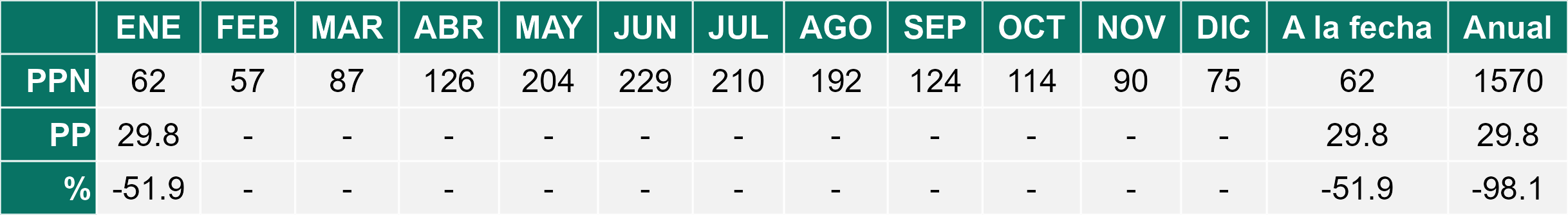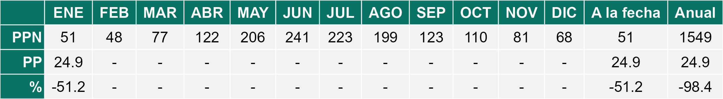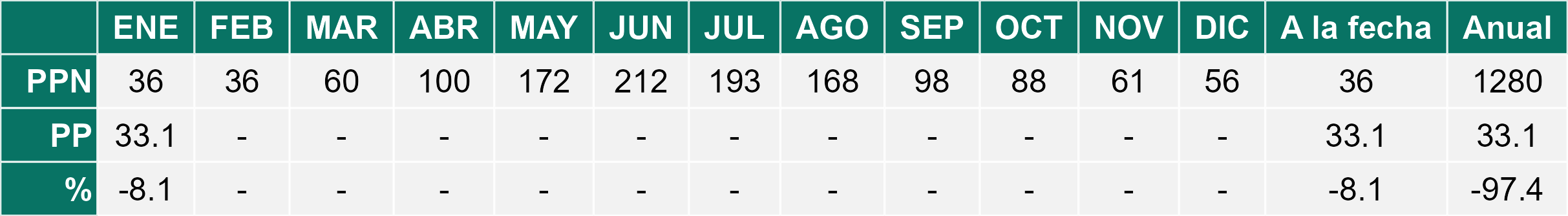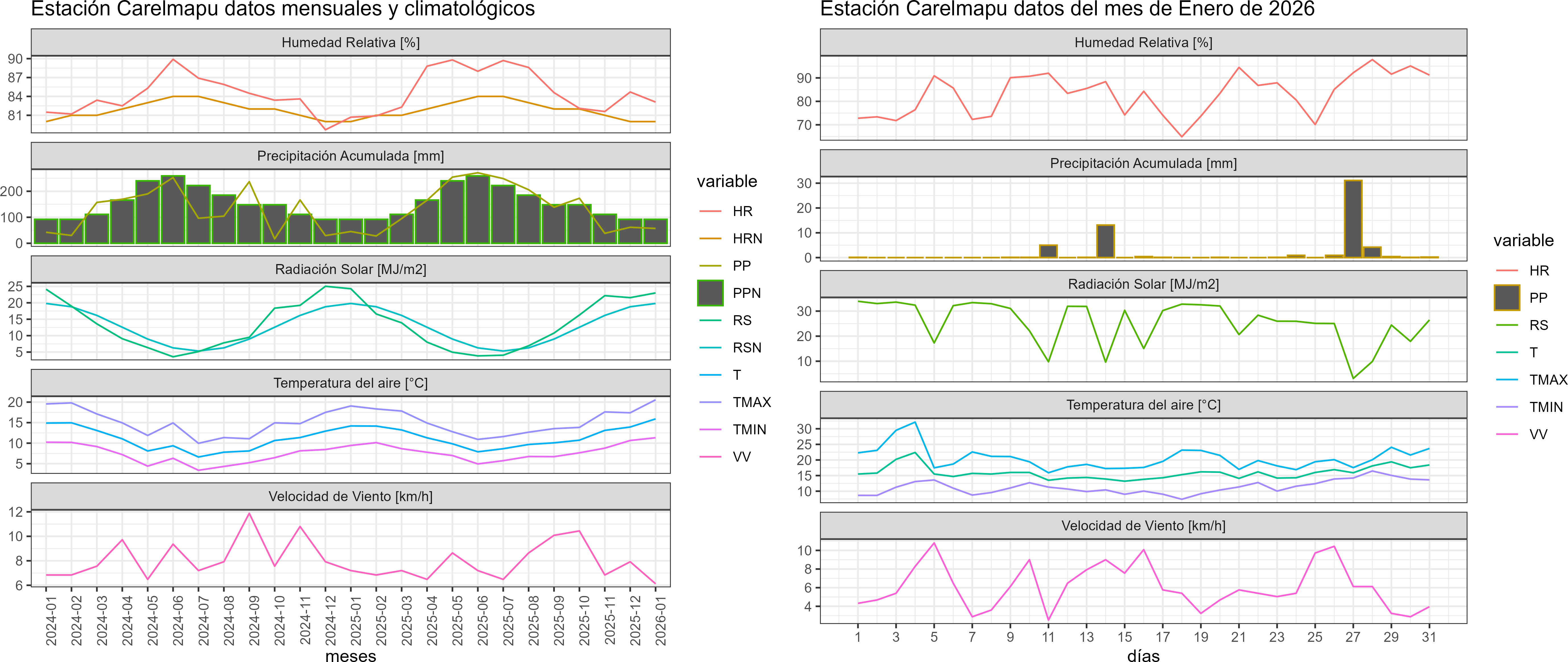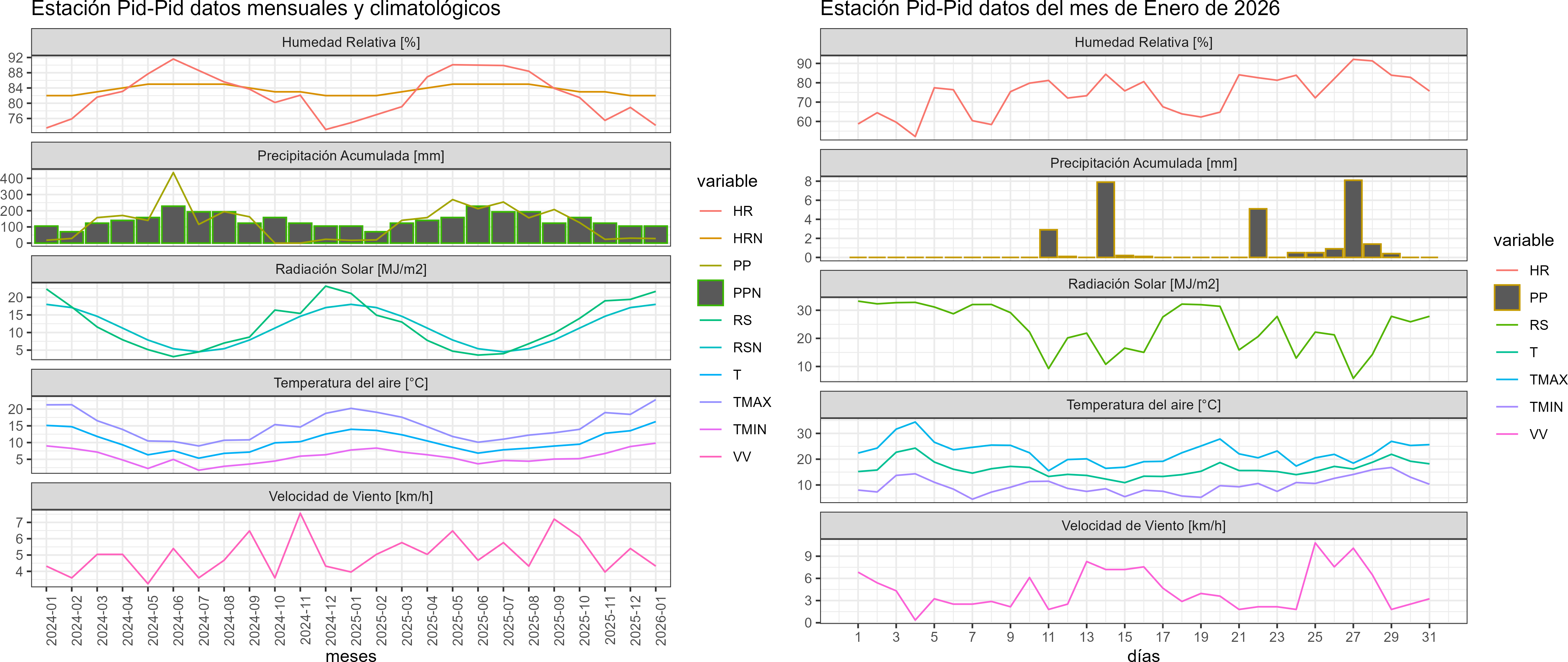 La estación Pid-Pid corresponde al distrito agroclimático 10-4. Para este distrito climático la temperatura mínima, media y máxima climatológicas alcanzan los 7.8°C, 14.2°C y 20.7°C respectivamente. Por su parte, respecto a las temperaturas medidas durante el mes de enero en la estación: la temperatura mínima alcanzo los 9.8°C (2°C sobre la climatológica), la temperatura media 16.3°C (2.1°C sobre la climatológica) y la temperatura máxima llegó a los 22.8°C (2.1°C sobre la climatológica). En el mes de enero se registró una pluviometría de 28.1 mm, lo cual representa un 37.5% con respecto al mismo mes de un año normal. De enero a enero se ha registrado un total acumulado de 28.1 mm, en circunstancias que un año normal registraría a la fecha 75 mm, lo que representa un déficit de 62.5%. A la misma fecha, durante el año 2024 la precipitación alcanzaba los 17 mm.