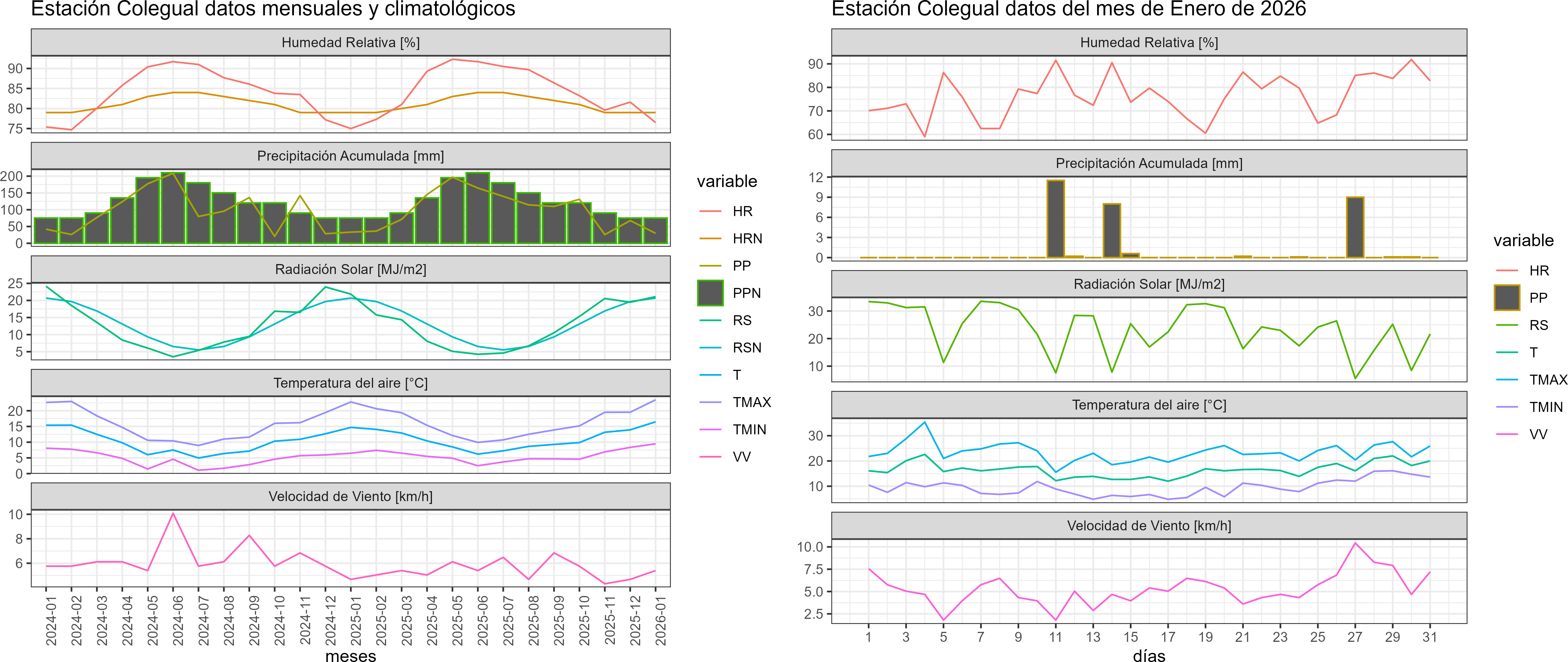 La estación Colegual corresponde al distrito agroclimático 14-10-1. Para este distrito climático la temperatura mínima, media y máxima climatológicas alcanzan los 8.5°C, 15°C y 21.5°C respectivamente. Por su parte, respecto a las temperaturas medidas durante el mes de enero en la estación: la temperatura mínima alcanzo los 9.5°C (1°C sobre la climatológica), la temperatura media 16.5°C (1.5°C sobre la climatológica) y la temperatura máxima llegó a los 23.5°C (2°C sobre la climatológica). En el mes de enero se registró una pluviometría de 29.8 mm, lo cual representa un 48.1% con respecto al mismo mes de un año normal. De enero a enero se ha registrado un total acumulado de 29.8 mm, en circunstancias que un año normal registraría a la fecha 62 mm, lo que representa un déficit de 51.9%. A la misma fecha, durante el año 2024 la precipitación alcanzaba los 33.2 mm.