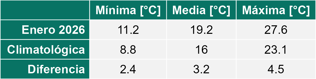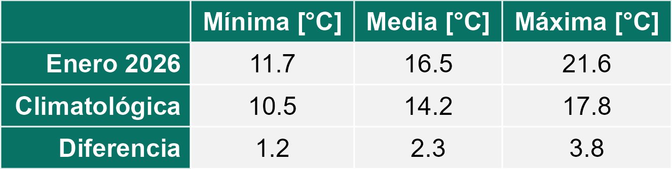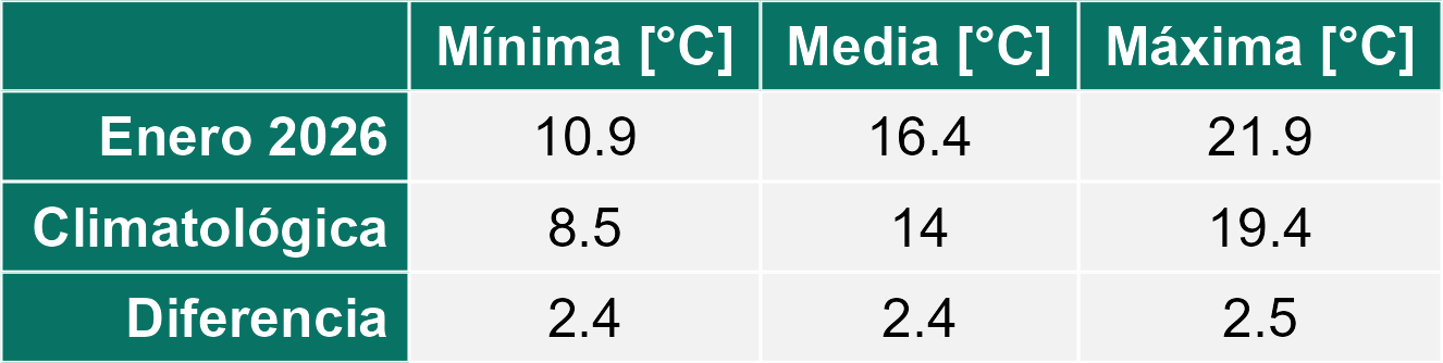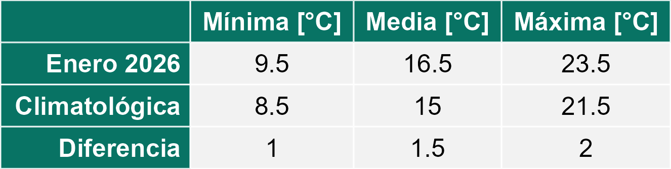 El mes de enero del 2026 también se ha caracterizado por ser más caluroso que el promedio con valores más altos tanto en la temperatura mínima como en la temperatura máxima. En el caso de la mínima, se ha ubicado casi 2 grados por sobre el promedio mensual y en la máxima ha superado los 2 °C de incremento sobre el promedio histórico.