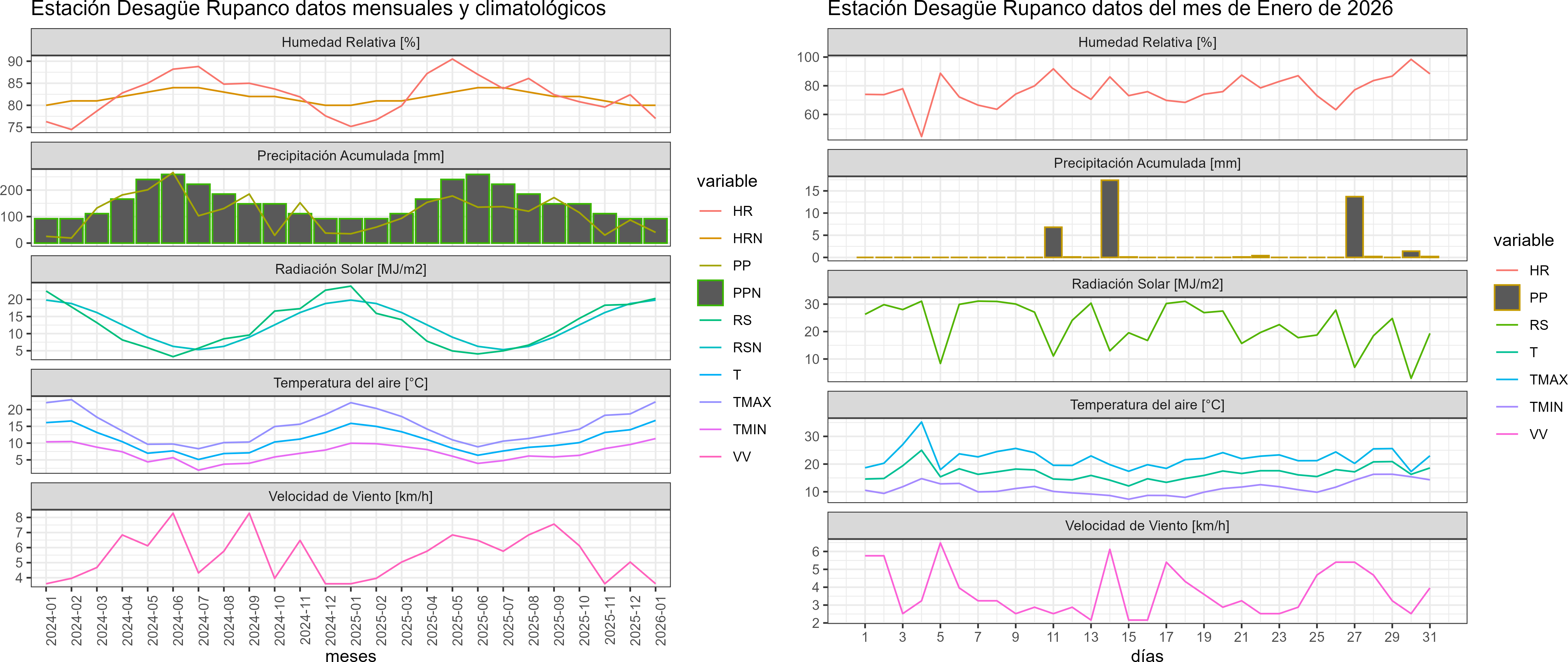 La estación Desagüe Rupanco corresponde al distrito agroclimático 14-10-3. Para este distrito climático la temperatura mínima, media y máxima climatológicas alcanzan los 9.8°C, 15.5°C y 21.2°C respectivamente. Por su parte, respecto a las temperaturas medidas durante el mes de enero en la estación: la temperatura mínima alcanzo los 11.3°C (1.5°C sobre la climatológica), la temperatura media 16.8°C (1.3°C sobre la climatológica) y la temperatura máxima llegó a los 22.3°C (1.1°C sobre la climatológica). En el mes de enero se registró una pluviometría de 40.4 mm, lo cual representa un 52.5% con respecto al mismo mes de un año normal. De enero a enero se ha registrado un total acumulado de 40.4 mm, en circunstancias que un año normal registraría a la fecha 77 mm, lo que representa un déficit de 47.5%. A la misma fecha, durante el año 2024 la precipitación alcanzaba los 35.1 mm.