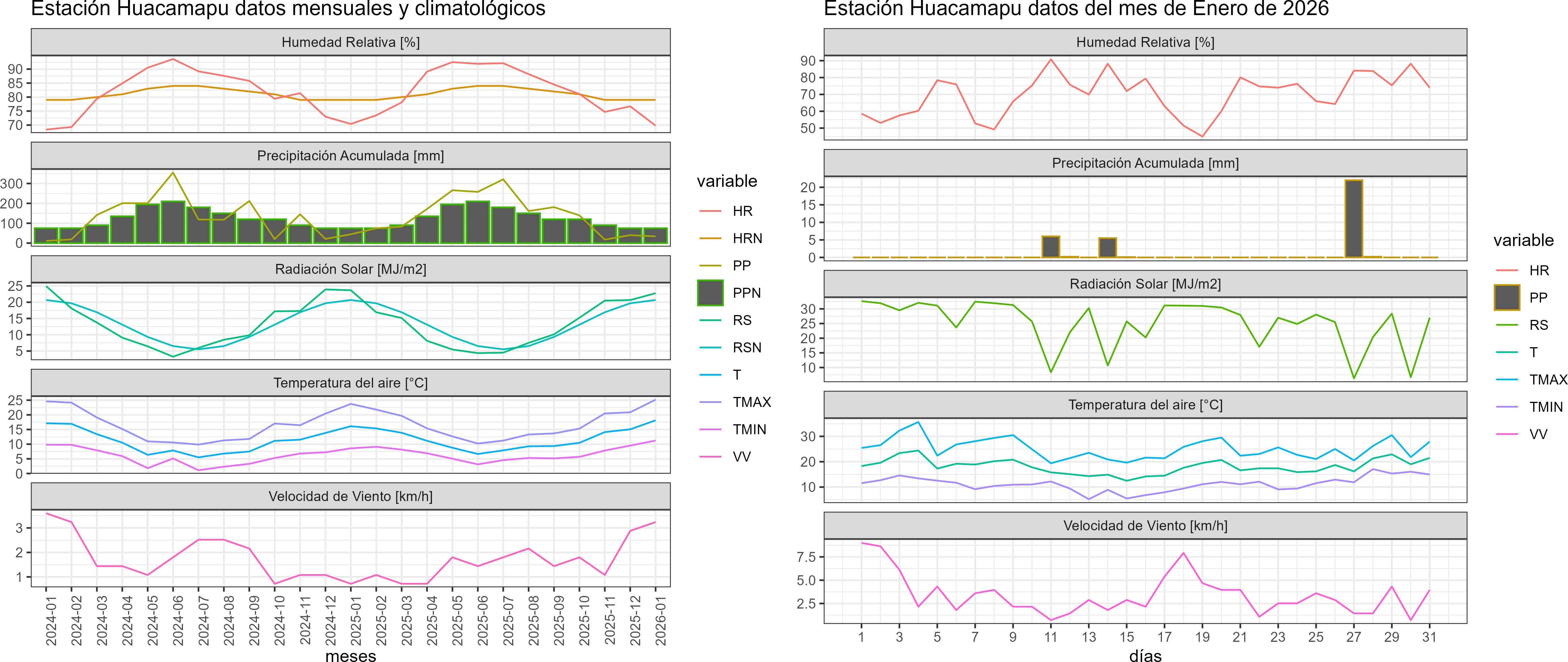 La estación Huacamapu corresponde al distrito agroclimático 14-10-1. Para este distrito climático la temperatura mínima, media y máxima climatológicas alcanzan los 8.6°C, 15°C y 21.5°C respectivamente. Por su parte, respecto a las temperaturas medidas durante el mes de enero en la estación: la temperatura mínima alcanzo los 11.2°C (2.6°C sobre la climatológica), la temperatura media 18.1°C (3.1°C sobre la climatológica) y la temperatura máxima llegó a los 25.2°C (3.7°C sobre la climatológica). En el mes de enero se registró una pluviometría de 34 mm, lo cual representa un 59.6% con respecto al mismo mes de un año normal. De enero a enero se ha registrado un total acumulado de 34 mm, en circunstancias que un año normal registraría a la fecha 57 mm, lo que representa un déficit de 40.4%. A la misma fecha, durante el año 2024 la precipitación alcanzaba los 44.3 mm.