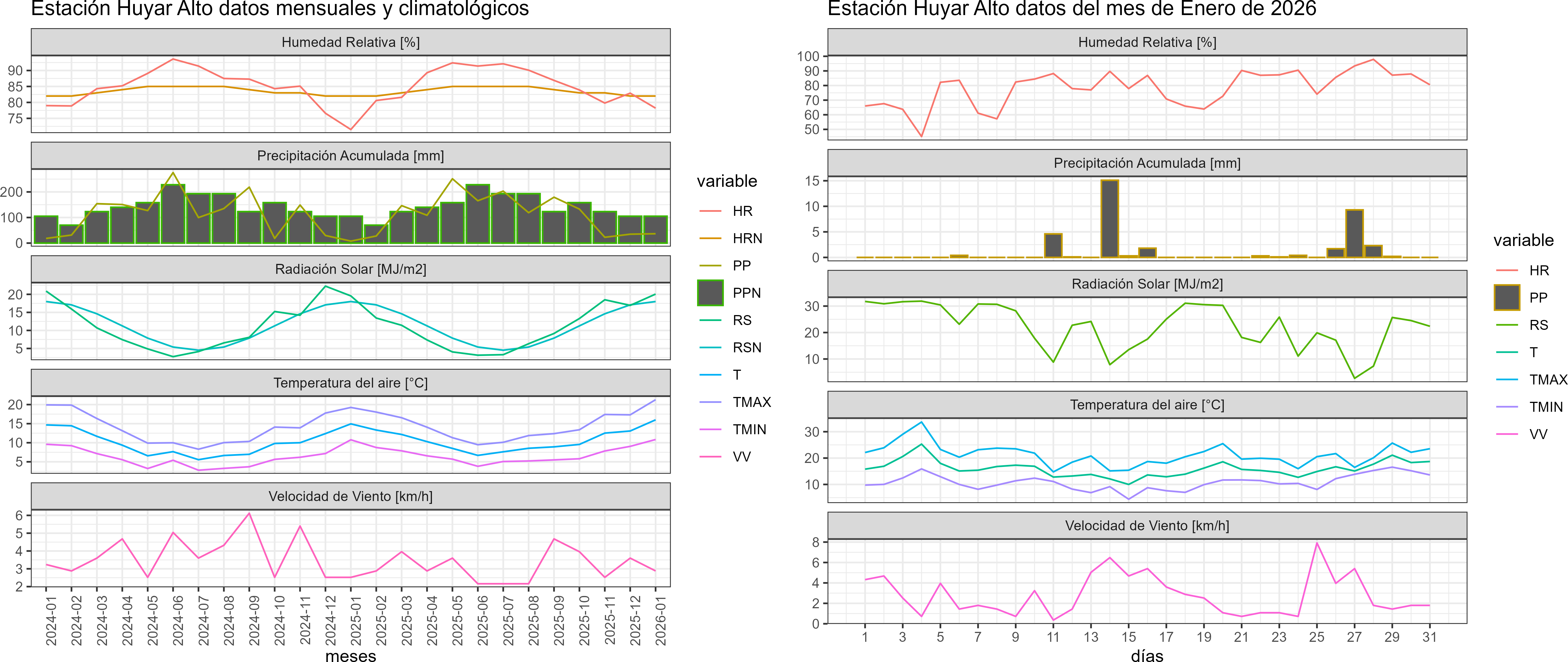 La estación Huyar Alto corresponde al distrito agroclimático 10-4. Para este distrito climático la temperatura mínima, media y máxima climatológicas alcanzan los 9.5°C, 14.4°C y 19.3°C respectivamente. Por su parte, respecto a las temperaturas medidas durante el mes de enero en la estación: la temperatura mínima alcanzo los 10.8°C (1.3°C sobre la climatológica), la temperatura media 16°C (1.6°C sobre la climatológica) y la temperatura máxima llegó a los 21.3°C (2°C sobre la climatológica). En el mes de enero se registró una pluviometría de 36.6 mm, lo cual representa un 53.8% con respecto al mismo mes de un año normal. De enero a enero se ha registrado un total acumulado de 36.6 mm, en circunstancias que un año normal registraría a la fecha 68 mm, lo que representa un déficit de 46.2%. A la misma fecha, durante el año 2024 la precipitación alcanzaba los 7.7 mm.