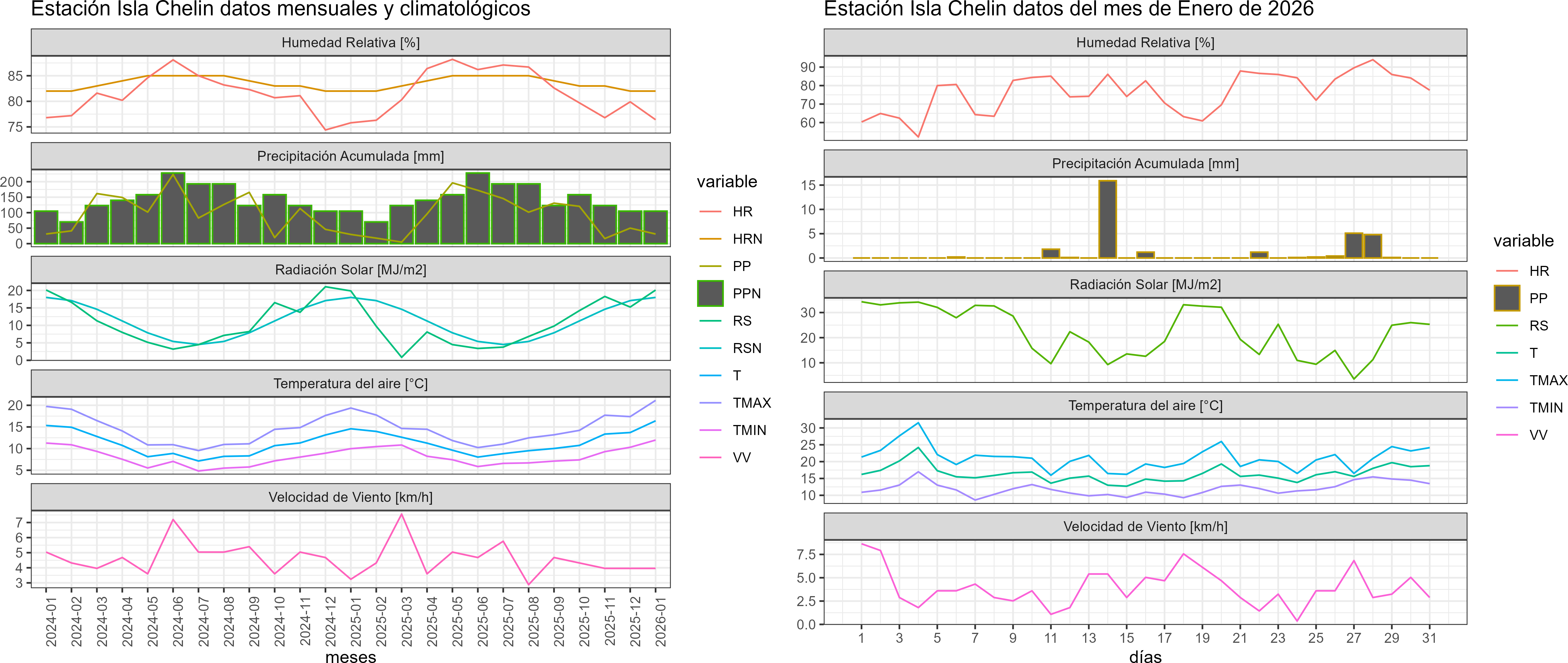 La estación Isla Chelin corresponde al distrito agroclimático 10-4. Para este distrito climático la temperatura mínima, media y máxima climatológicas alcanzan los 10.1°C, 14.3°C y 18.6°C respectivamente. Por su parte, respecto a las temperaturas medidas durante el mes de enero en la estación: la temperatura mínima alcanzo los 12°C (1.9°C sobre la climatológica), la temperatura media 16.4°C (2.1°C sobre la climatológica) y la temperatura máxima llegó a los 21.1°C (2.5°C sobre la climatológica). En el mes de enero se registró una pluviometría de 31.1 mm, lo cual representa un 45.1% con respecto al mismo mes de un año normal. De enero a enero se ha registrado un total acumulado de 31.1 mm, en circunstancias que un año normal registraría a la fecha 69 mm, lo que representa un déficit de 54.9%. A la misma fecha, durante el año 2024 la precipitación alcanzaba los 29.7 mm.
