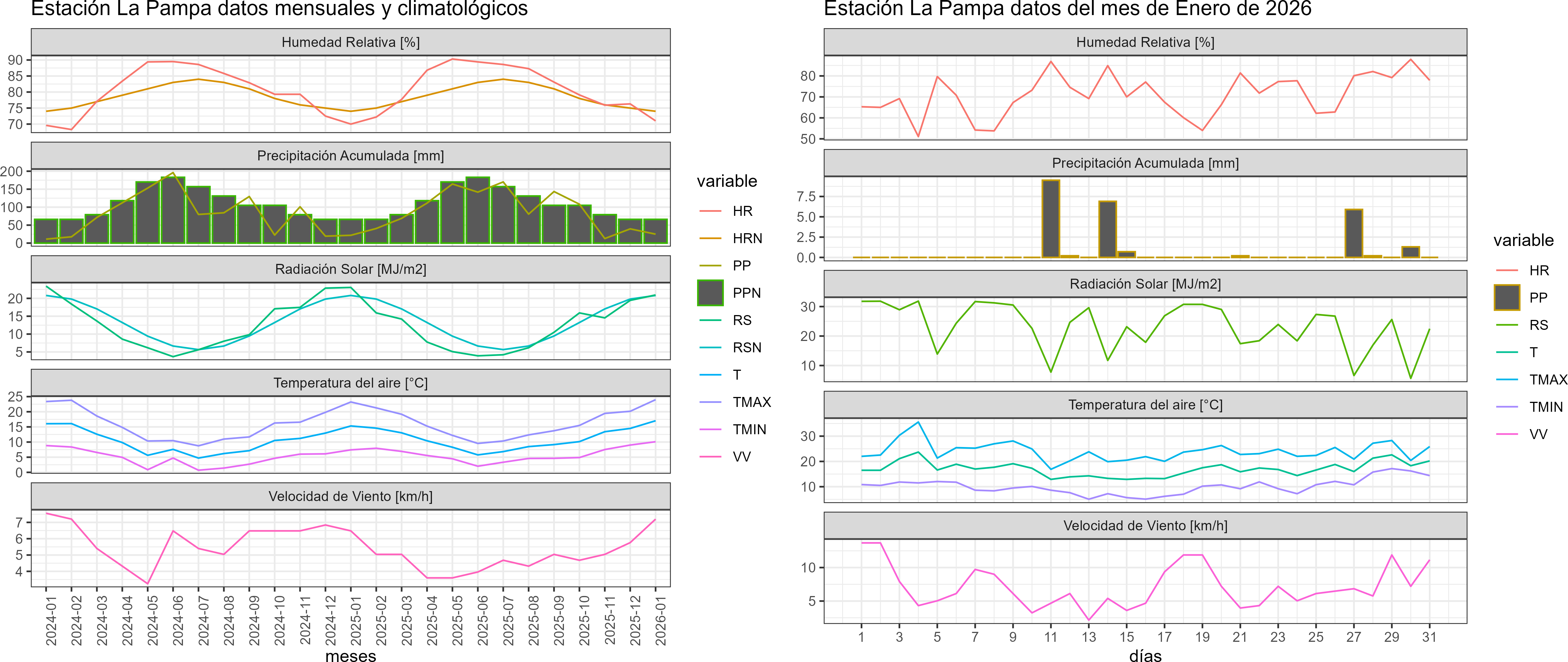 La estación La Pampa corresponde al distrito agroclimático 14-10-2. Para este distrito climático la temperatura mínima, media y máxima climatológicas alcanzan los 8.8°C, 15.6°C y 22.5°C respectivamente. Por su parte, respecto a las temperaturas medidas durante el mes de enero en la estación: la temperatura mínima alcanzo los 10.1°C (1.3°C sobre la climatológica), la temperatura media 17°C (1.4°C sobre la climatológica) y la temperatura máxima llegó a los 24°C (1.5°C sobre la climatológica). En el mes de enero se registró una pluviometría de 24.9 mm, lo cual representa un 48.8% con respecto al mismo mes de un año normal. De enero a enero se ha registrado un total acumulado de 24.9 mm, en circunstancias que un año normal registraría a la fecha 51 mm, lo que representa un déficit de 51.2%. A la misma fecha, durante el año 2024 la precipitación alcanzaba los 21.7 mm.