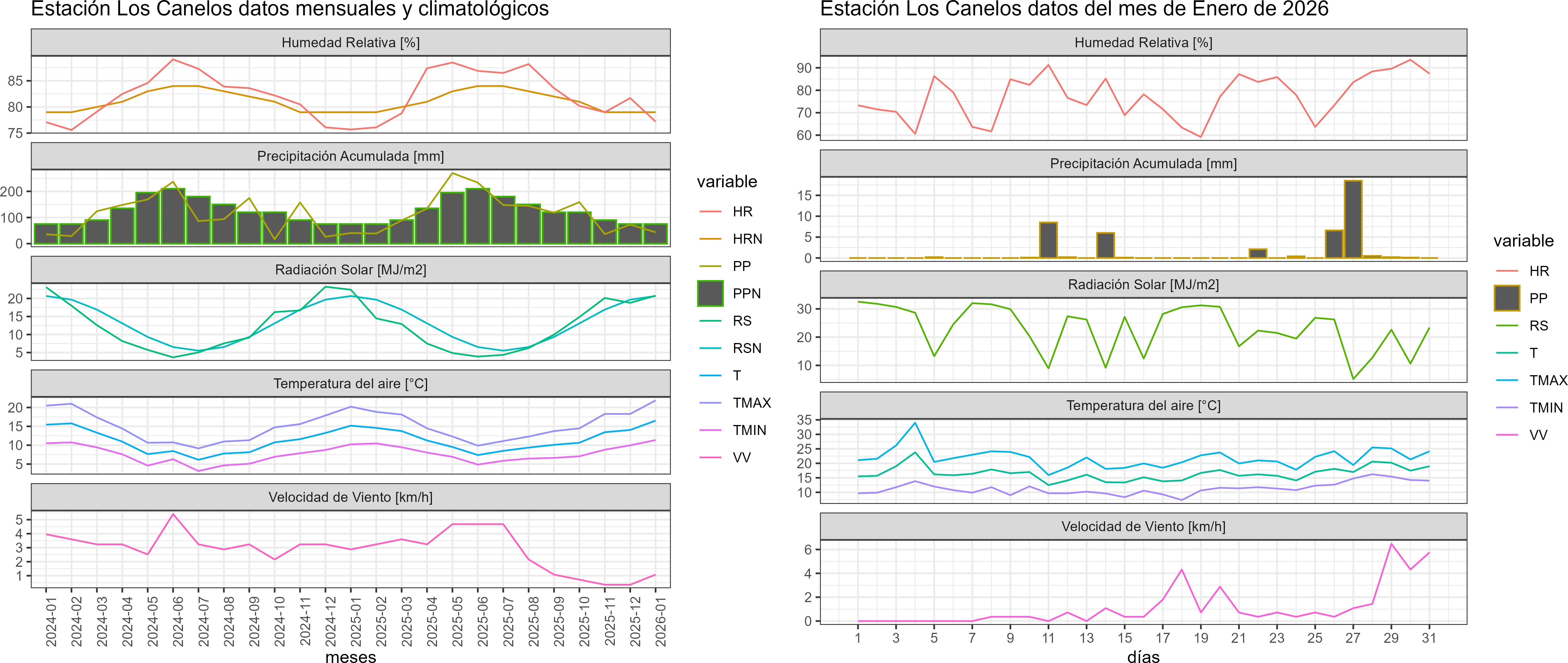 La estación Los Canelos corresponde al distrito agroclimático 14-10-1. Para este distrito climático la temperatura mínima, media y máxima climatológicas alcanzan los 8.7°C, 15.1°C y 21.4°C respectivamente. Por su parte, respecto a las temperaturas medidas durante el mes de enero en la estación: la temperatura mínima alcanzo los 11.4°C (2.7°C sobre la climatológica), la temperatura media 16.5°C (1.4°C sobre la climatológica) y la temperatura máxima llegó a los 21.9°C (0.5°C sobre la climatológica). En el mes de enero se registró una pluviometría de 43.5 mm, lo cual representa un 66.9% con respecto al mismo mes de un año normal. De enero a enero se ha registrado un total acumulado de 43.5 mm, en circunstancias que un año normal registraría a la fecha 65 mm, lo que representa un déficit de 33.1%. A la misma fecha, durante el año 2024 la precipitación alcanzaba los 40.6 mm.
