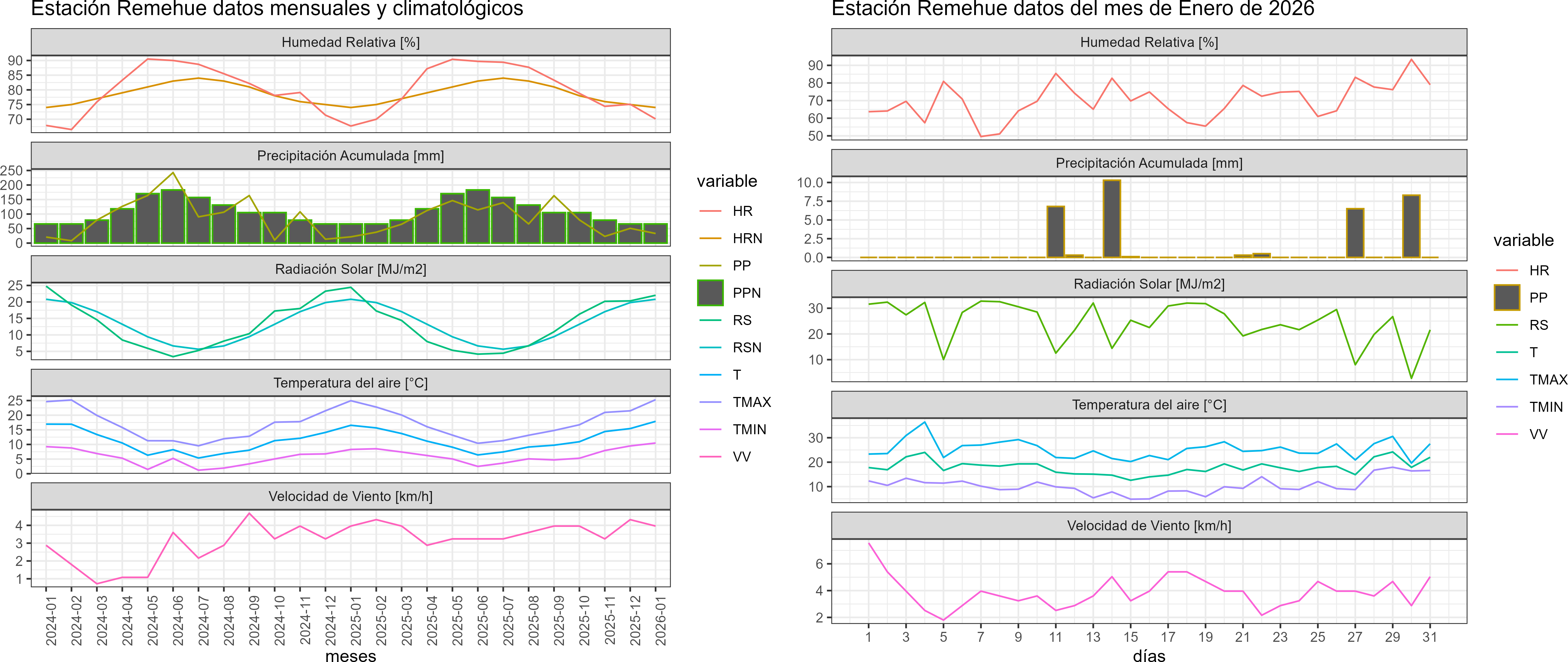La estación Remehue corresponde al distrito agroclimático 14-10-2. Para este distrito climático la temperatura mínima, media y máxima climatológicas alcanzan los 8.9°C, 16.3°C y 23.8°C respectivamente. Por su parte, respecto a las temperaturas medidas durante el mes de enero en la estación: la temperatura mínima alcanzo los 10.5°C (1.6°C sobre la climatológica), la temperatura media 17.9°C (1.6°C sobre la climatológica) y la temperatura máxima llegó a los 25.3°C (1.5°C sobre la climatológica). En el mes de enero se registró una pluviometría de 33.1 mm, lo cual representa un 91.9% con respecto al mismo mes de un año normal. De enero a enero se ha registrado un total acumulado de 33.1 mm, en circunstancias que un año normal registraría a la fecha 36 mm, lo que representa un déficit de 8.1%. A la misma fecha, durante el año 2024 la precipitación alcanzaba los 21.5 mm.