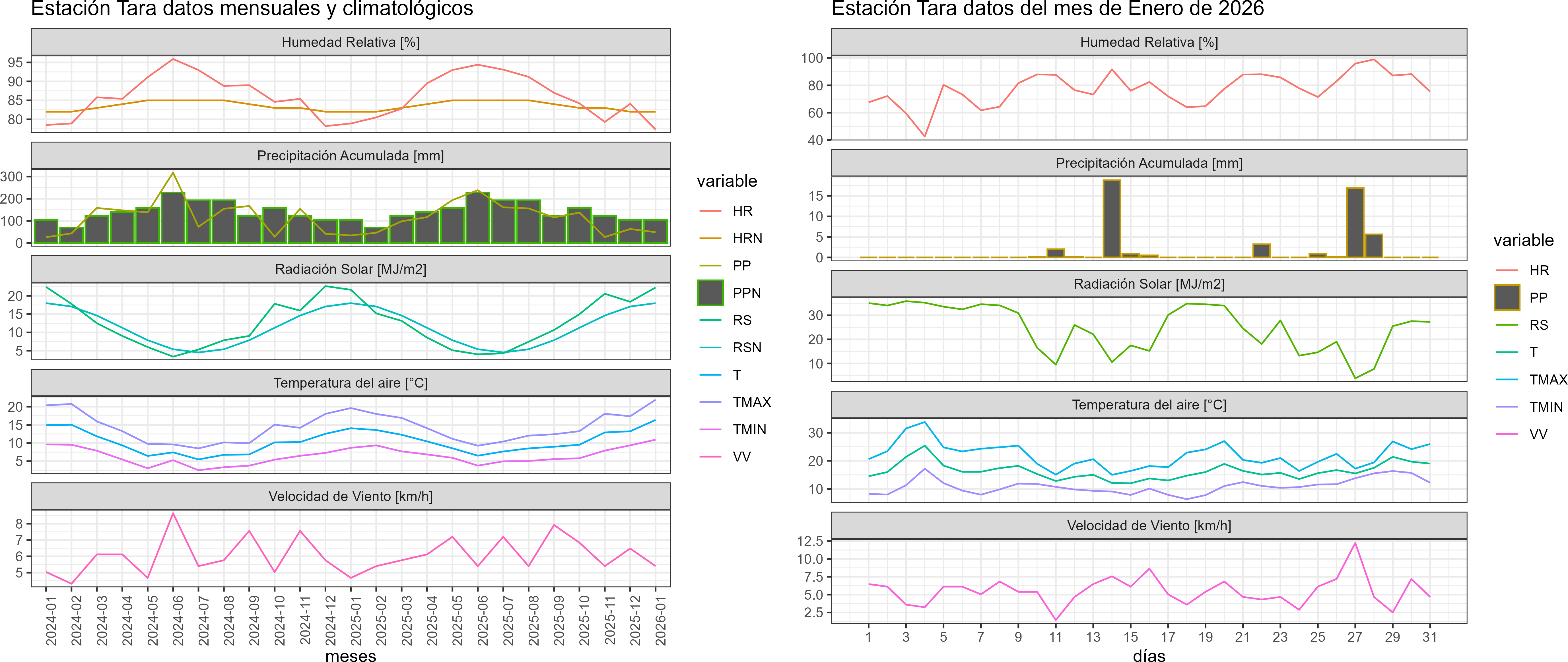La estación Tara corresponde al distrito agroclimático 10-4. Para este distrito climático la temperatura mínima, media y máxima climatológicas alcanzan los 8.5°C, 14°C y 19.4°C respectivamente. Por su parte, respecto a las temperaturas medidas durante el mes de enero en la estación: la temperatura mínima alcanzo los 10.9°C (2.4°C sobre la climatológica), la temperatura media 16.4°C (2.4°C sobre la climatológica) y la temperatura máxima llegó a los 21.9°C (2.5°C sobre la climatológica). En el mes de enero se registró una pluviometría de 49.2 mm, lo cual representa un 66.5% con respecto al mismo mes de un año normal. De enero a enero se ha registrado un total acumulado de 49.2 mm, en circunstancias que un año normal registraría a la fecha 74 mm, lo que representa un déficit de 33.5%. A la misma fecha, durante el año 2024 la precipitación alcanzaba los 34.6 mm.