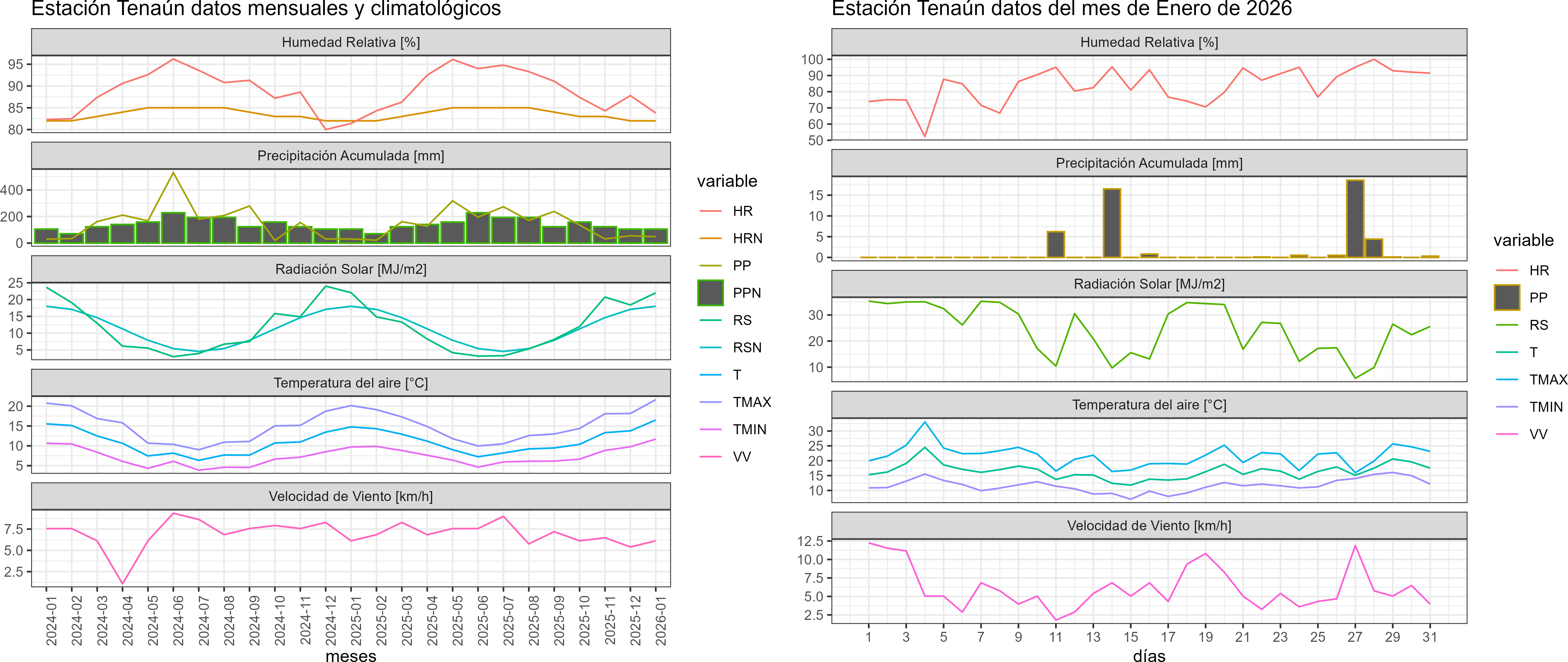 La estación Tenaún corresponde al distrito agroclimático 10-4. Para este distrito climático la temperatura mínima, media y máxima climatológicas alcanzan los 10.5°C, 14.2°C y 17.8°C respectivamente. Por su parte, respecto a las temperaturas medidas durante el mes de enero en la estación: la temperatura mínima alcanzo los 11.7°C (1.2°C sobre la climatológica), la temperatura media 16.5°C (2.3°C sobre la climatológica) y la temperatura máxima llegó a los 21.6°C (3.8°C sobre la climatológica). En el mes de enero se registró una pluviometría de 48 mm, lo cual representa un 60.8% con respecto al mismo mes de un año normal. De enero a enero se ha registrado un total acumulado de 48 mm, en circunstancias que un año normal registraría a la fecha 79 mm, lo que representa un déficit de 39.2%. A la misma fecha, durante el año 2024 la precipitación alcanzaba los 31.3 mm.