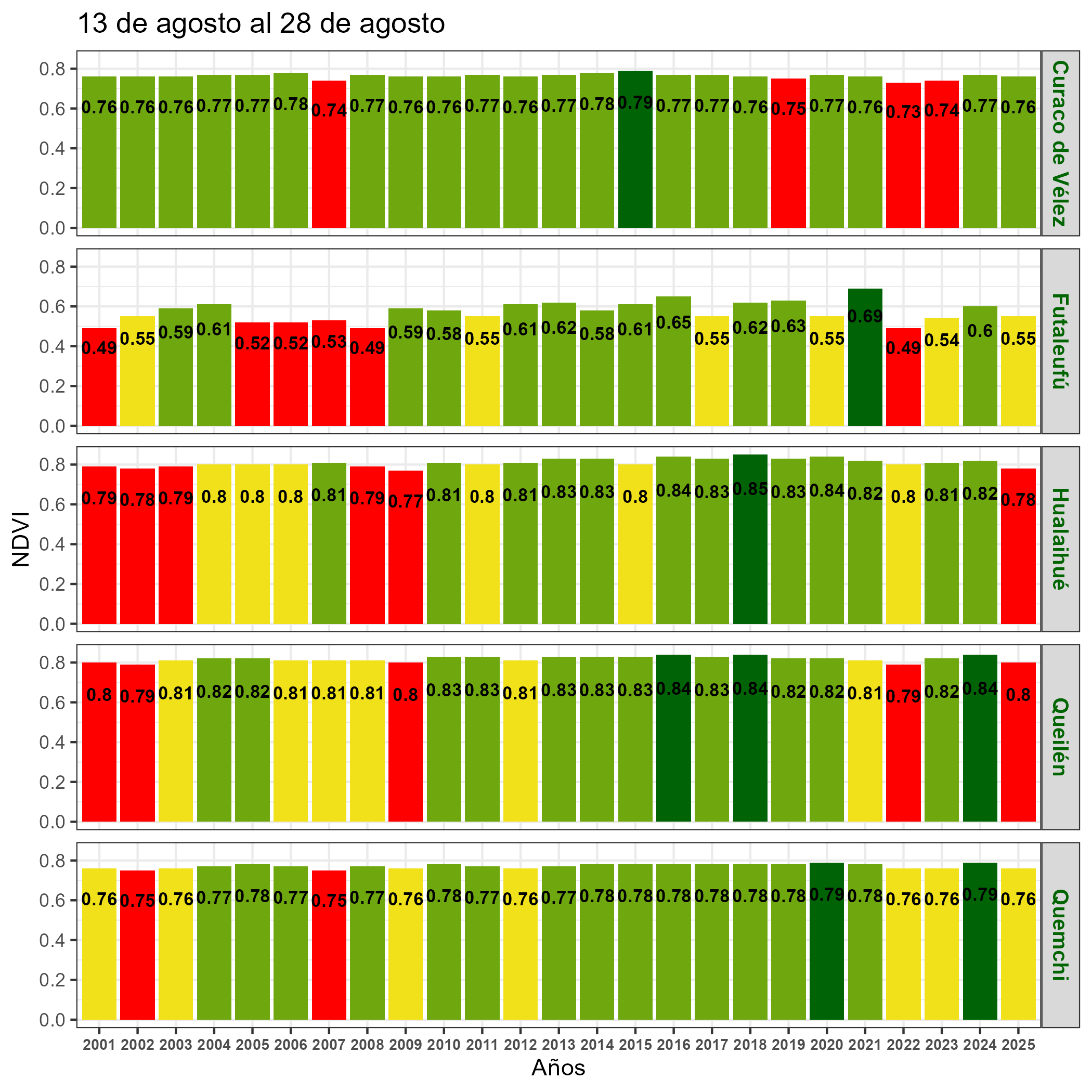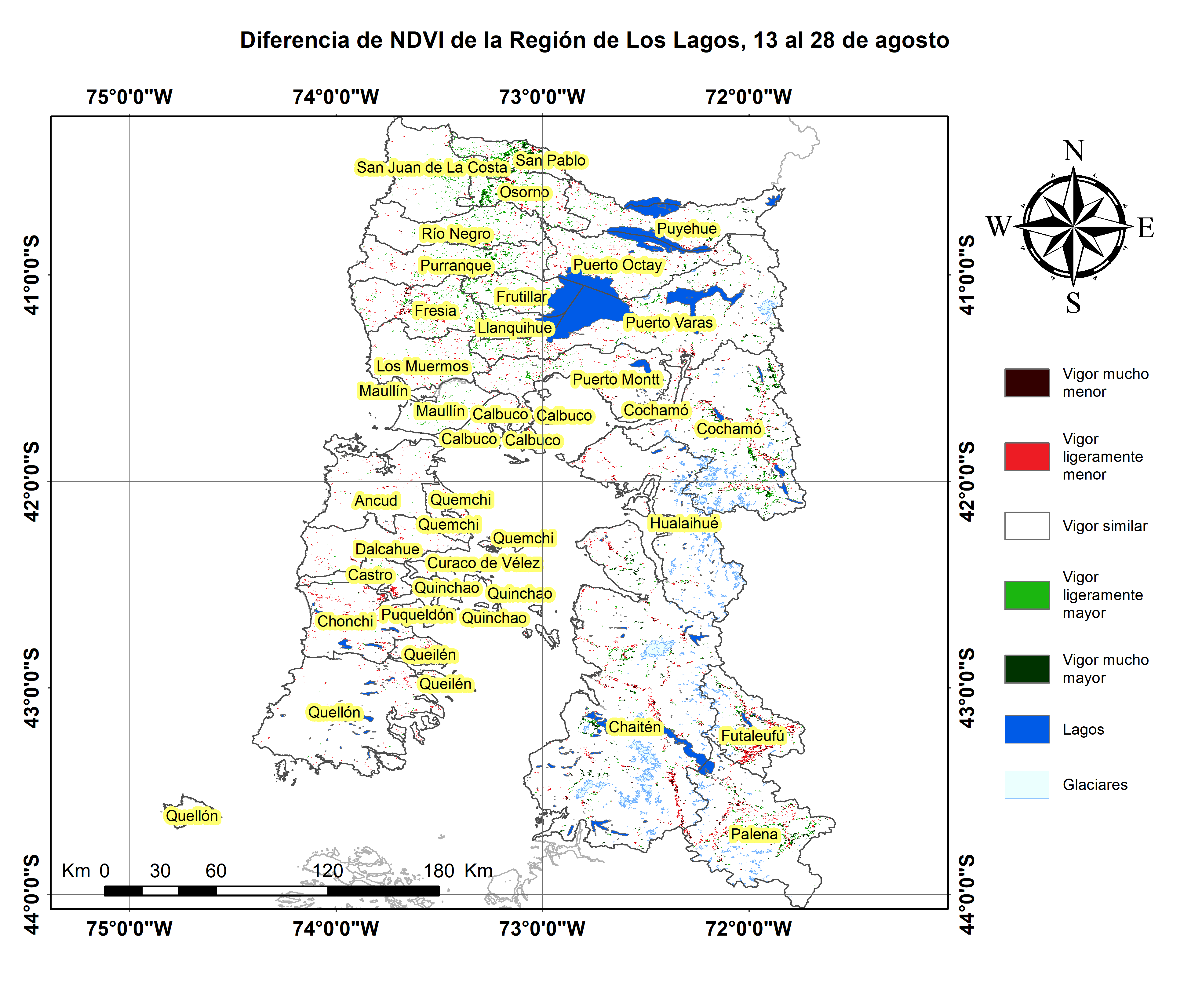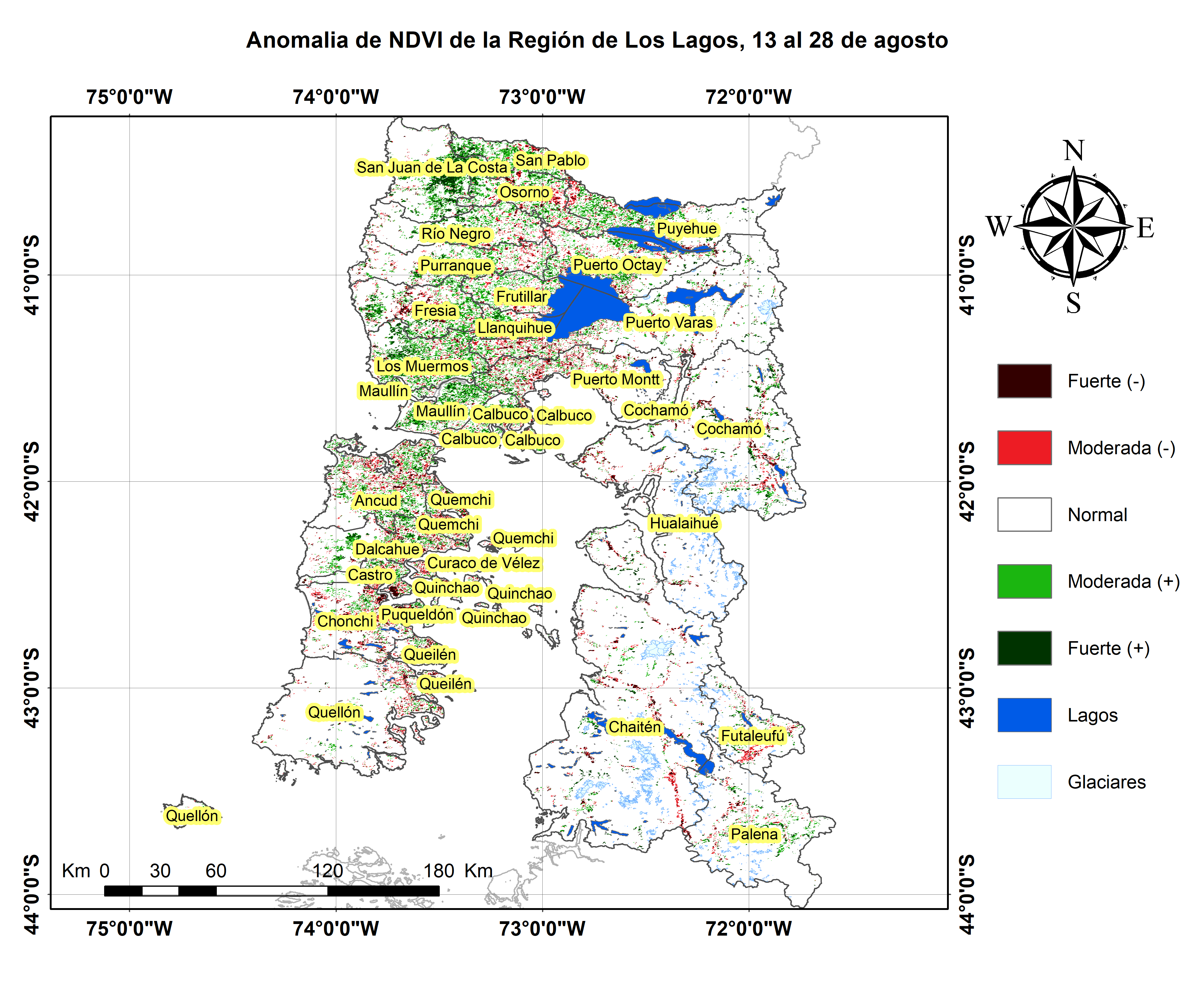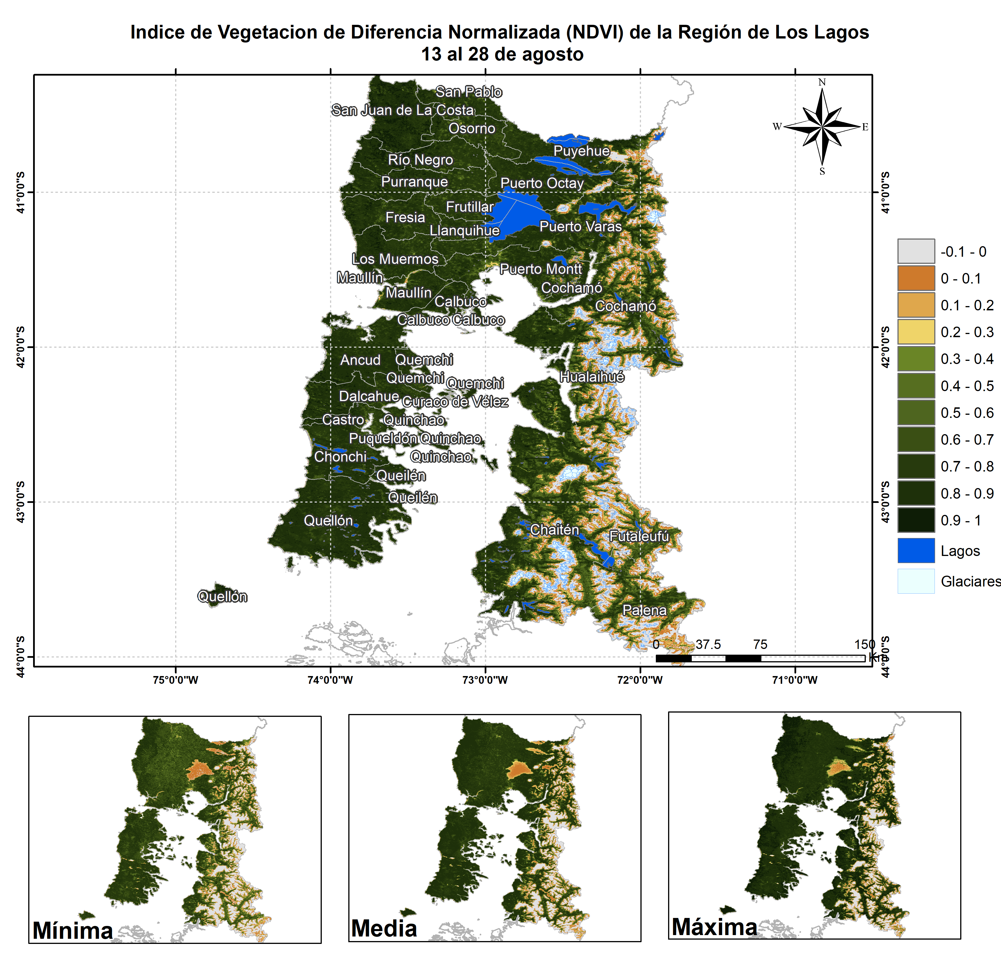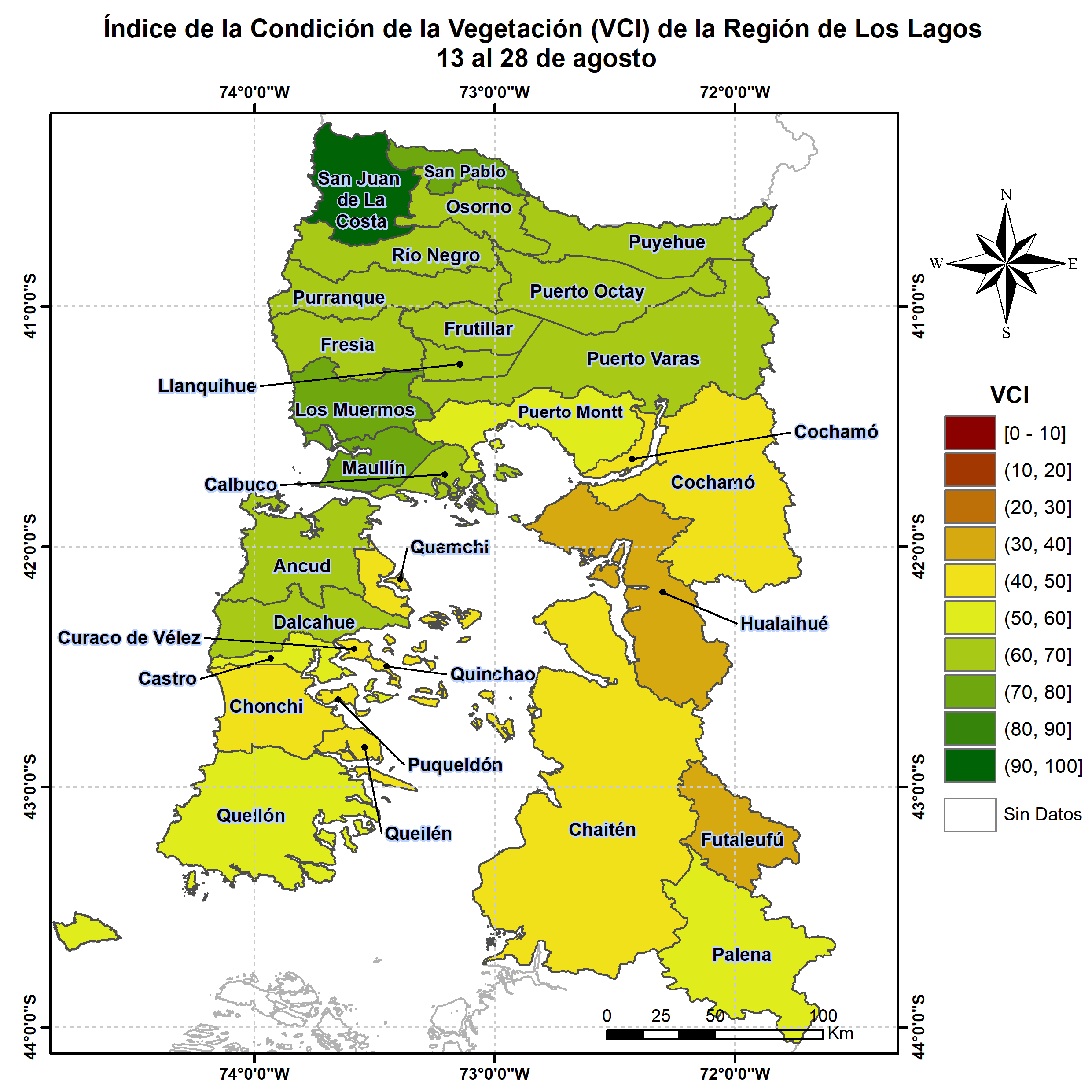 El NDVI obtenido de las imágenes satelitales indica un valor levemente sobre el promedio para la cubierta vegetal de la región, siendo más bajos en algunas comunas del sector oriental de Chiloé y en la Provincia de Palena, no obstante la región en conjunto presenta una situación normal a moderadamente positiva.