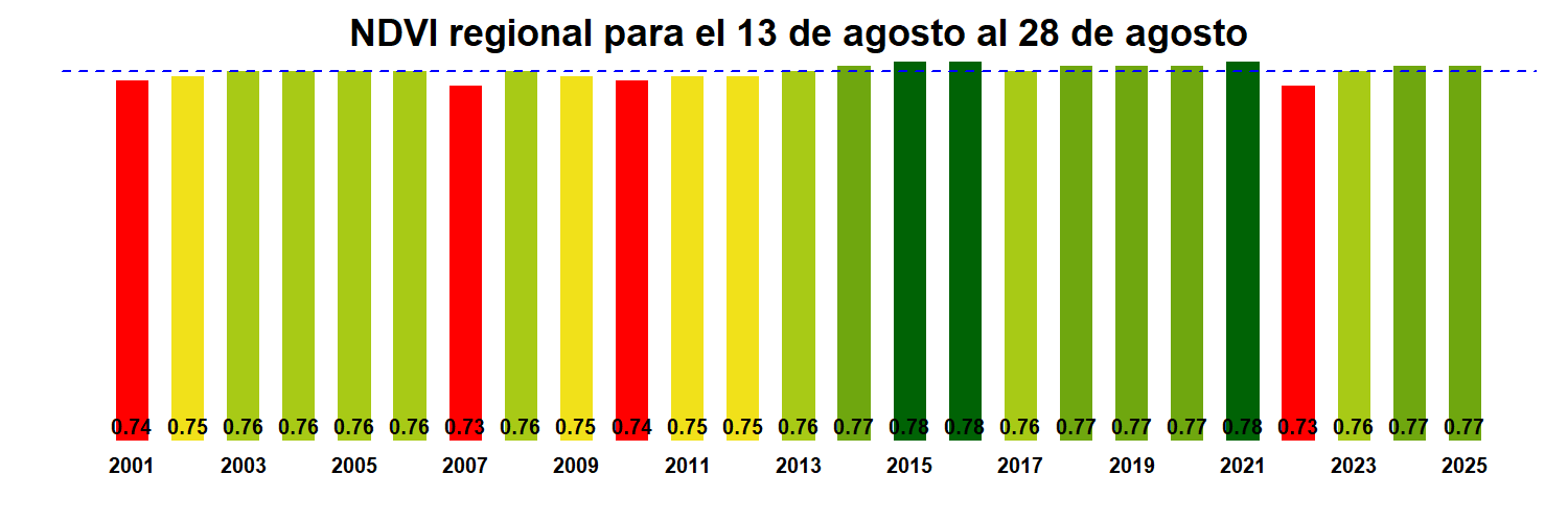 Para esta quincena se observa un NDVI promedio regional de 0.77 mientras el año pasado había sido de 0.77. El valor promedio histórico para esta región, en este período del año es de 0.76.