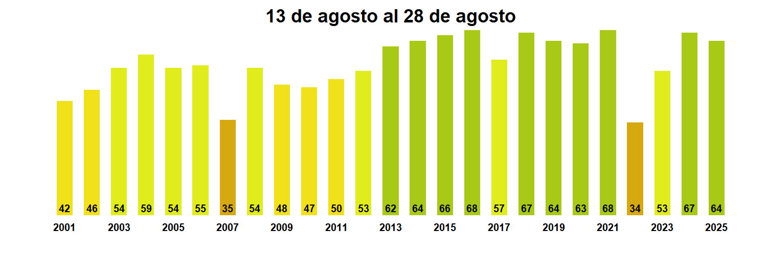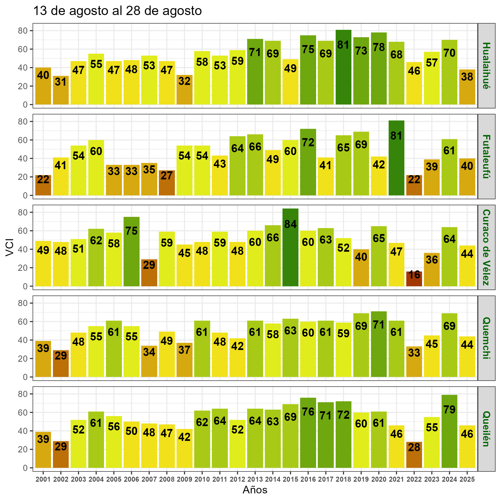 En términos globales la Región presentó un valor mediano de VCI de 64% para el período comprendido desde el 13 al 28 de agosto. A igual período del año pasado presentaba un VCI de 67% (Fig. 1). De acuerdo a la Tabla 1 la Región de Los Lagos, en términos globales presenta una condición Favorable.