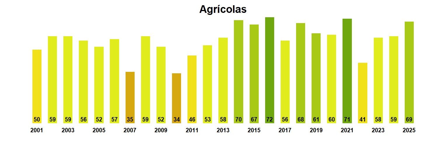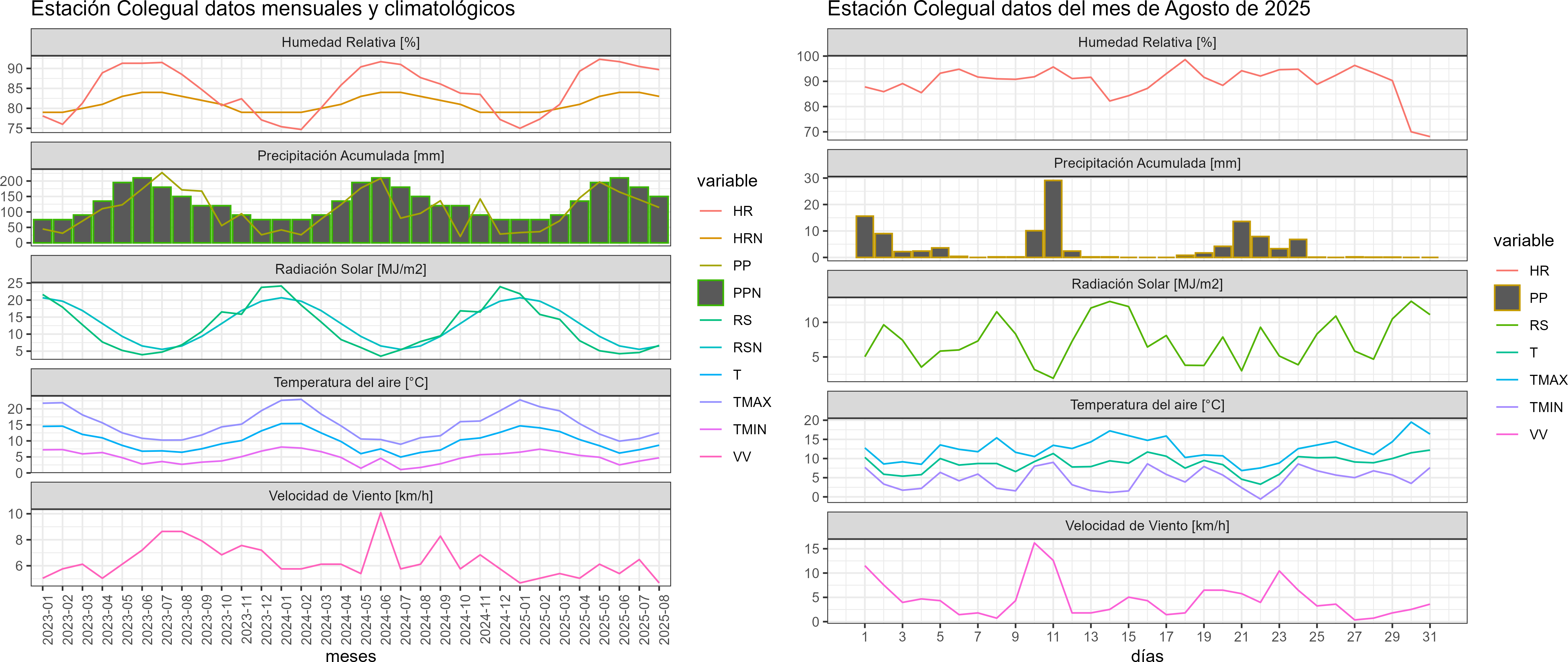 La estación Colegual corresponde al distrito agroclimático 14-10-1. Para este distrito climático la temperatura mínima, media y máxima climatológicas alcanzan los 3.3°C, 7.2°C y 11.2°C respectivamente. Por su parte, respecto a las temperaturas medidas durante el mes de agosto en la estación: la temperatura mínima alcanzo los 4.7°C (1.4°C sobre la climatológica), la temperatura media 8.7°C (1.5°C sobre la climatológica) y la temperatura máxima llegó a los 12.5°C (1.3°C sobre la climatológica). En el mes de agosto se registró una pluviometría de 114.4 mm, lo cual representa un 59.6% con respecto al mismo mes de un año normal. De enero a agosto se ha registrado un total acumulado de 901.8 mm, en circunstancias que un año normal registraría a la fecha 1167 mm, lo que representa un déficit de 22.7%. A la misma fecha, durante el año 2024 la precipitación alcanzaba los 95.5 mm.