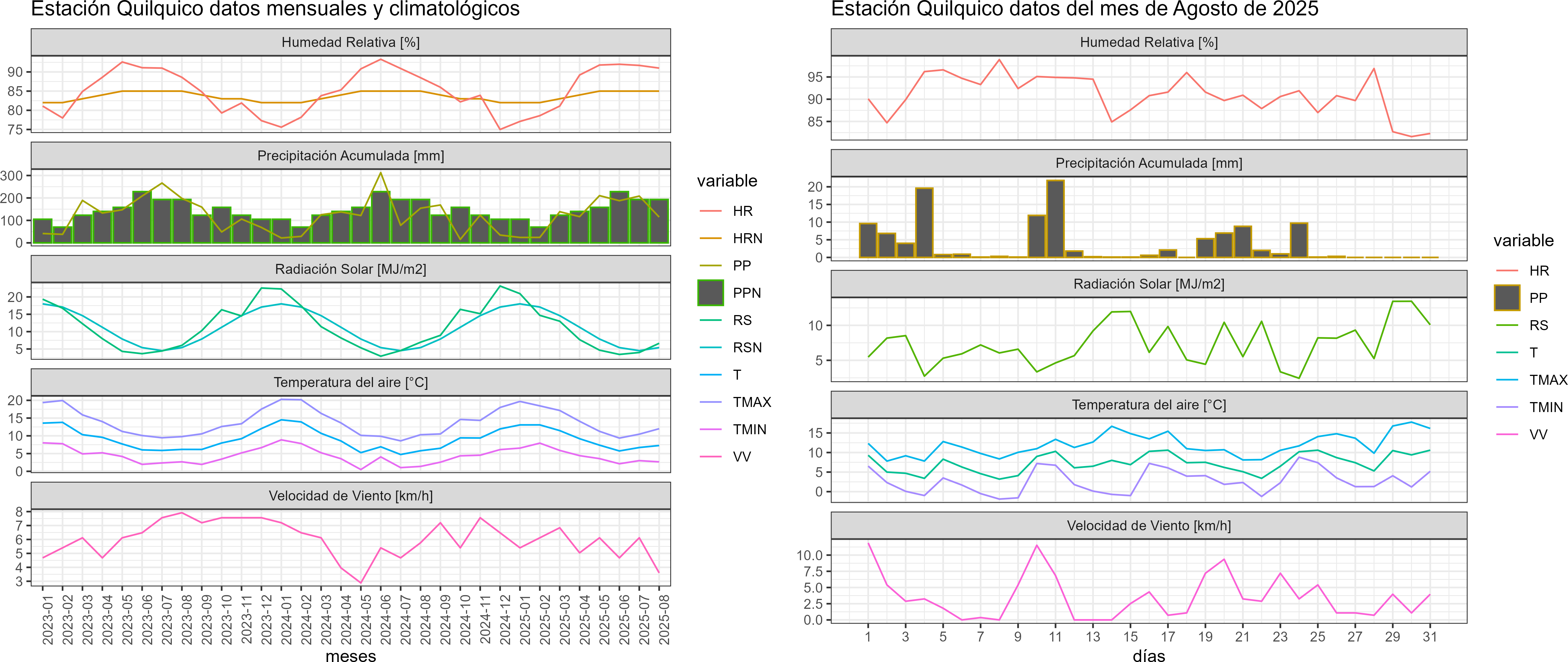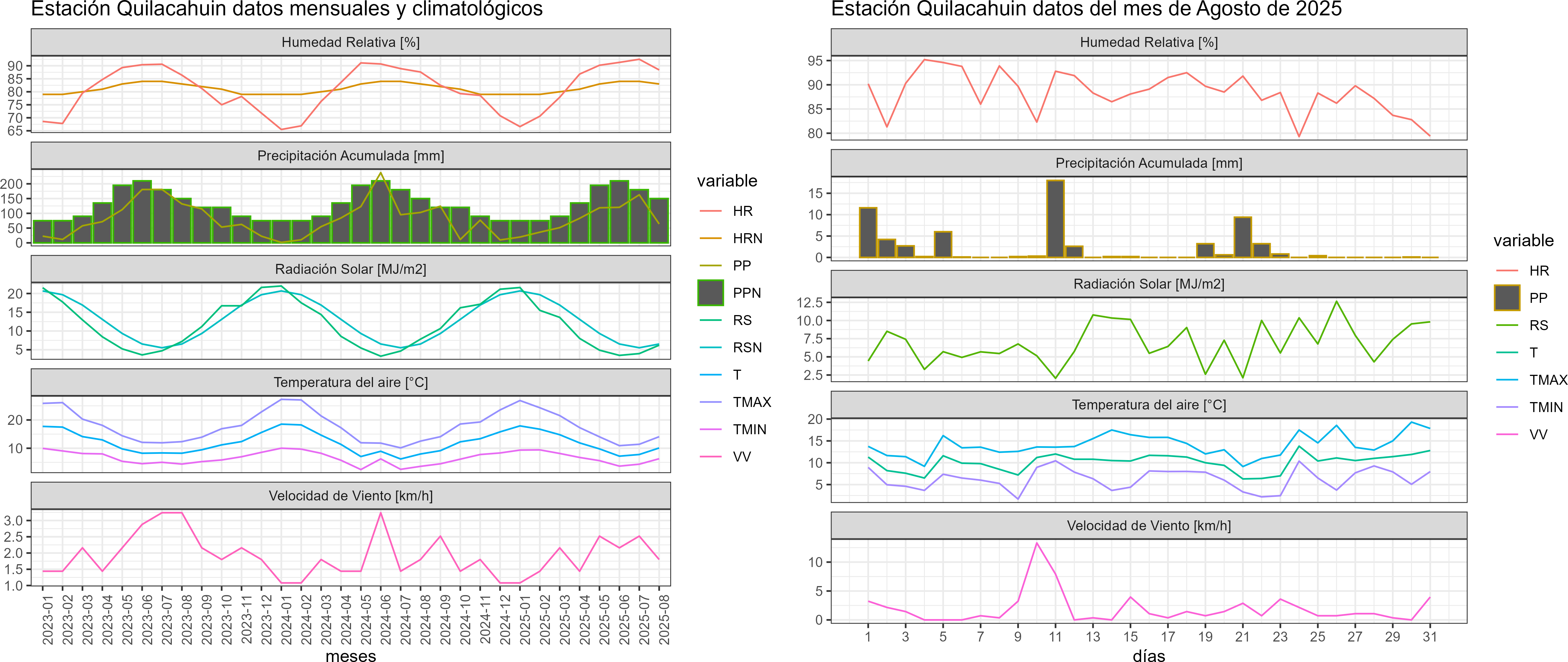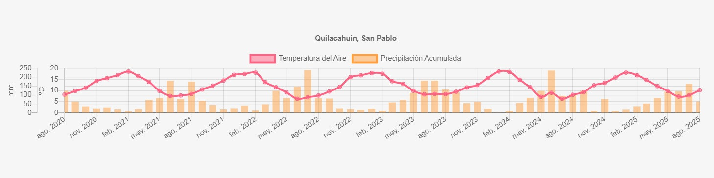 La estación Quilacahuin corresponde al distrito agroclimático 14-10-1. Para este distrito climático la temperatura mínima, media y máxima climatológicas alcanzan los 3.8°C, 7.9°C y 11.9°C respectivamente. Por su parte, respecto a las temperaturas medidas durante el mes de agosto en la estación: la temperatura mínima alcanzo los 6.3°C (2.5°C sobre la climatológica), la temperatura media 10.1°C (2.2°C sobre la climatológica) y la temperatura máxima llegó a los 14.1°C (2.2°C sobre la climatológica). En el mes de agosto se registró una pluviometría de 64 mm, lo cual representa un 28.4% con respecto al mismo mes de un año normal. De enero a agosto se ha registrado un total acumulado de 656.3 mm, en circunstancias que un año normal registraría a la fecha 1267 mm, lo que representa un déficit de 48.2%. A la misma fecha, durante el año 2024 la precipitación alcanzaba los 102.9 mm.