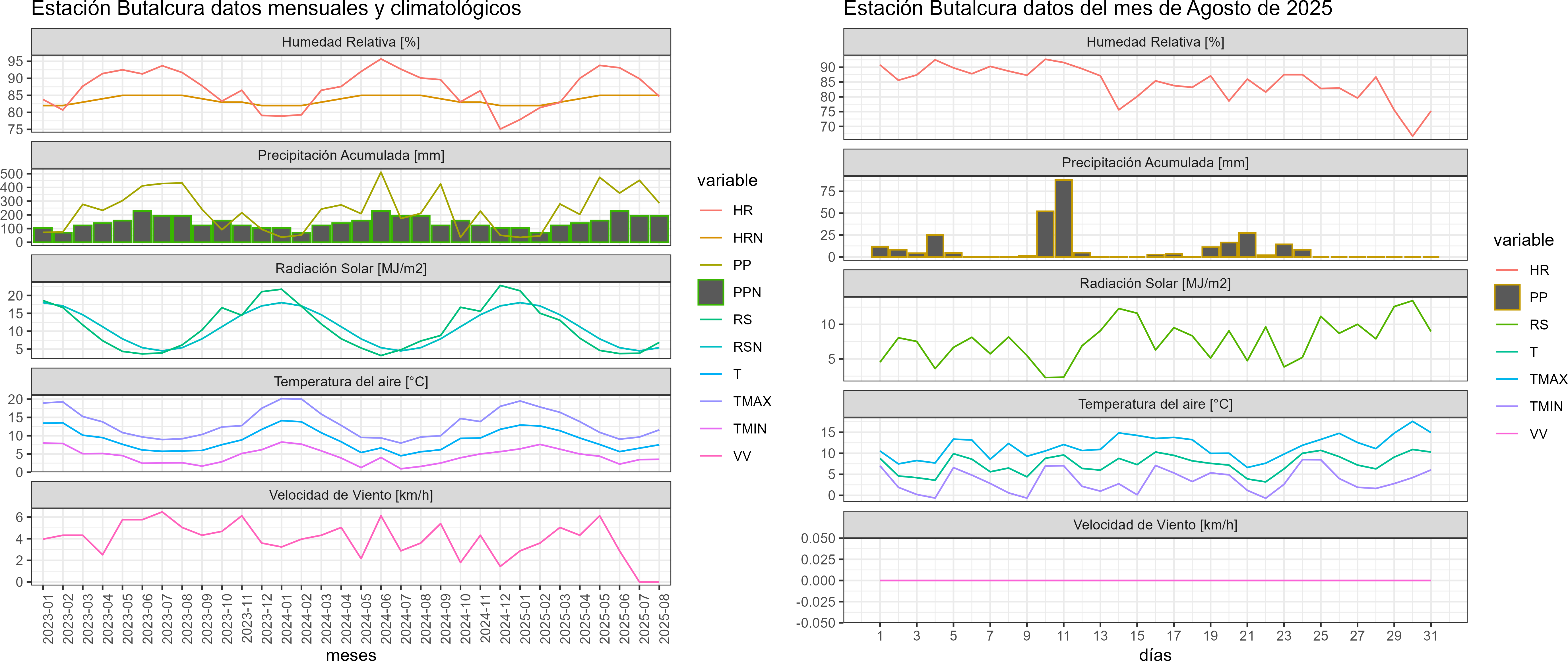 La estación Butalcura corresponde al distrito agroclimático 10-4. Para este distrito climático la temperatura mínima, media y máxima climatológicas alcanzan los 3.6°C, 7.1°C y 10.7°C respectivamente. Por su parte, respecto a las temperaturas medidas durante el mes de agosto en la estación: la temperatura mínima alcanzo los 3.5°C (-0.1°C bajo la climatológica), la temperatura media 7.5°C (0.4°C sobre la climatológica) y la temperatura máxima llegó a los 11.6°C (0.9°C sobre la climatológica). En el mes de agosto se registró una pluviometría de 285.9 mm, lo cual representa un 110.8% con respecto al mismo mes de un año normal. De enero a agosto se ha registrado un total acumulado de 2136.1 mm, en circunstancias que un año normal registraría a la fecha 1408 mm, lo que representa un superávit de 51.7%. A la misma fecha, durante el año 2024 la precipitación alcanzaba los 210.6 mm.