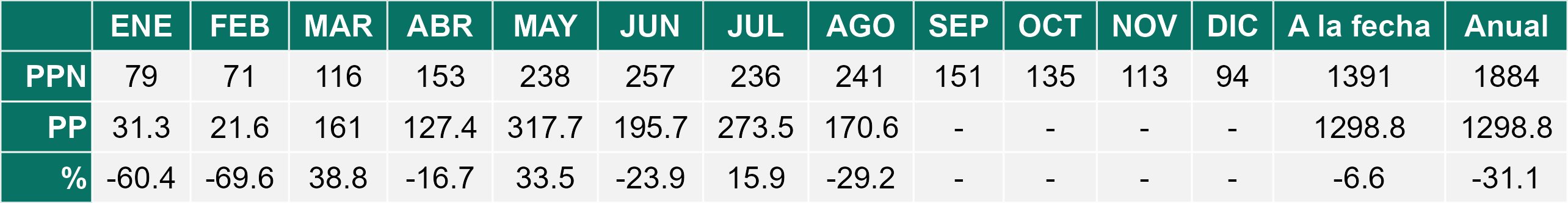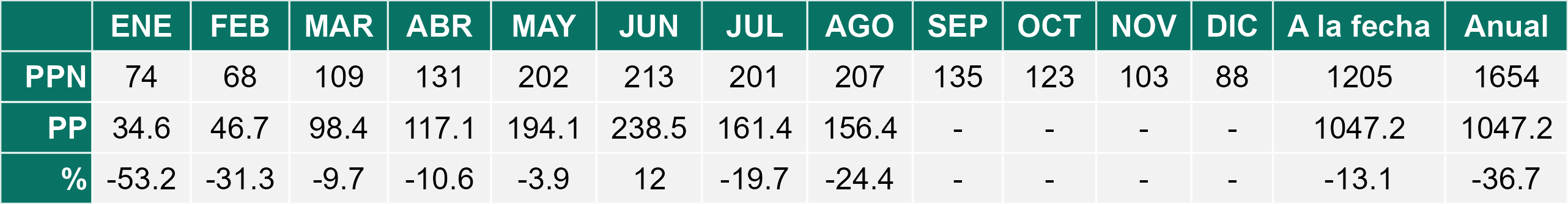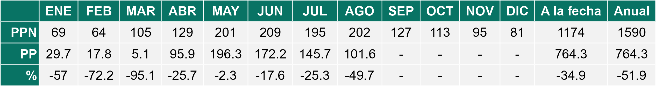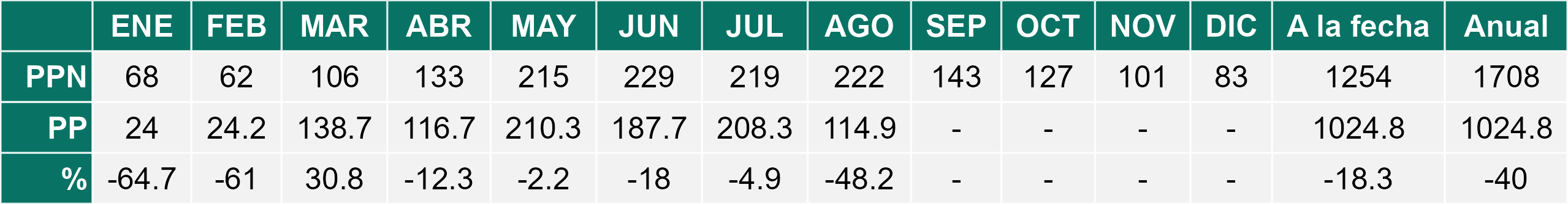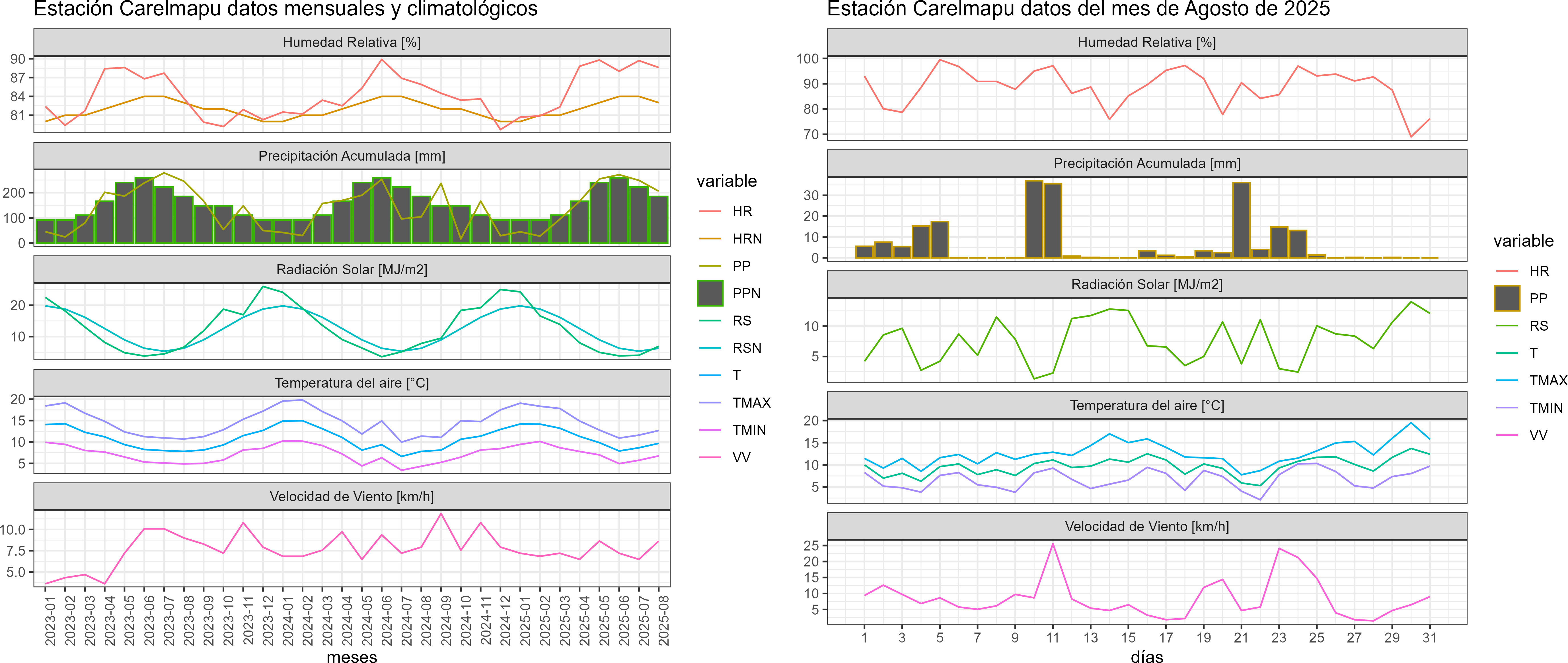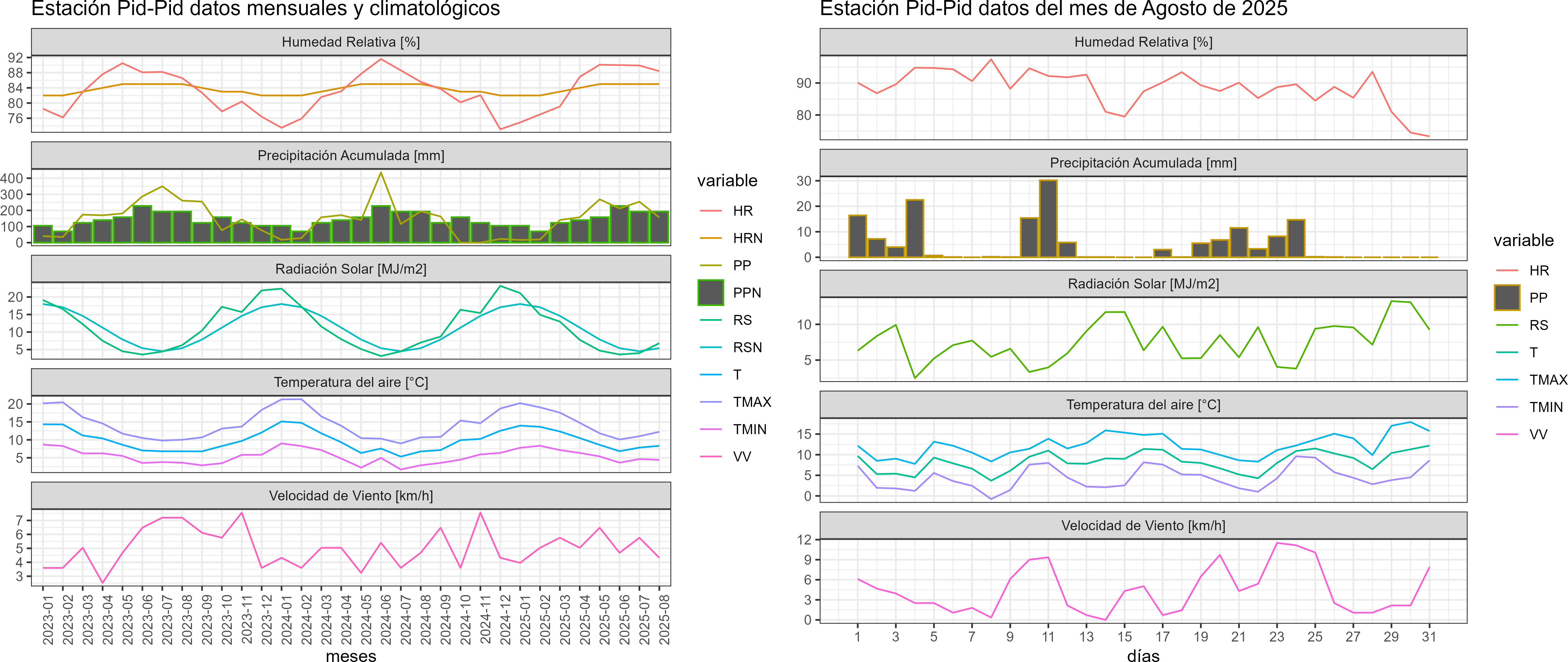 La estación Pid-Pid corresponde al distrito agroclimático 10-4. Para este distrito climático la temperatura mínima, media y máxima climatológicas alcanzan los 3.2°C, 7.2°C y 11.2°C respectivamente. Por su parte, respecto a las temperaturas medidas durante el mes de agosto en la estación: la temperatura mínima alcanzo los 4.4°C (1.2°C sobre la climatológica), la temperatura media 8.3°C (1.1°C sobre la climatológica) y la temperatura máxima llegó a los 12.2°C (1°C sobre la climatológica). En el mes de agosto se registró una pluviometría de 156.2 mm, lo cual representa un 59.6% con respecto al mismo mes de un año normal. De enero a agosto se ha registrado un total acumulado de 1226.2 mm, en circunstancias que un año normal registraría a la fecha 1458 mm, lo que representa un déficit de 15.9%. A la misma fecha, durante el año 2024 la precipitación alcanzaba los 194.7 mm.