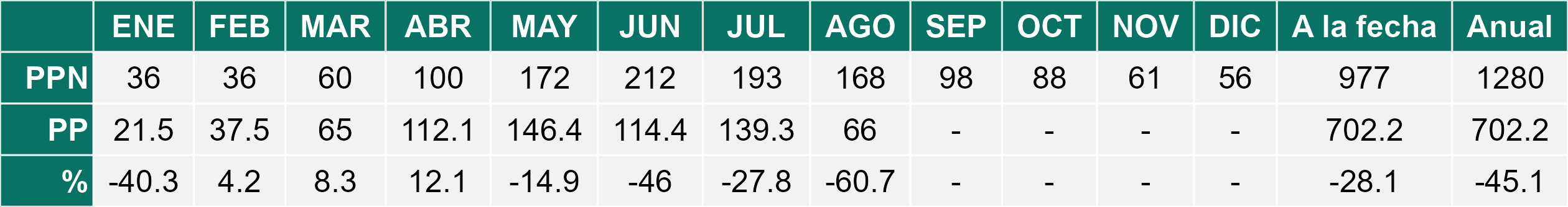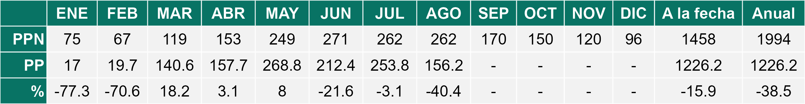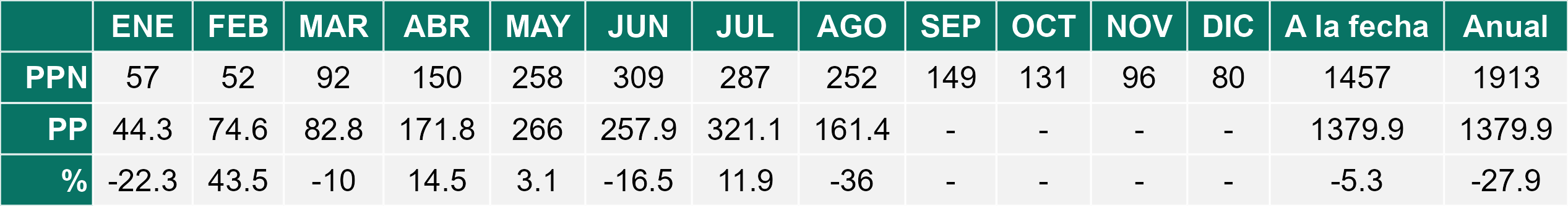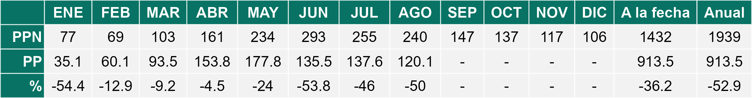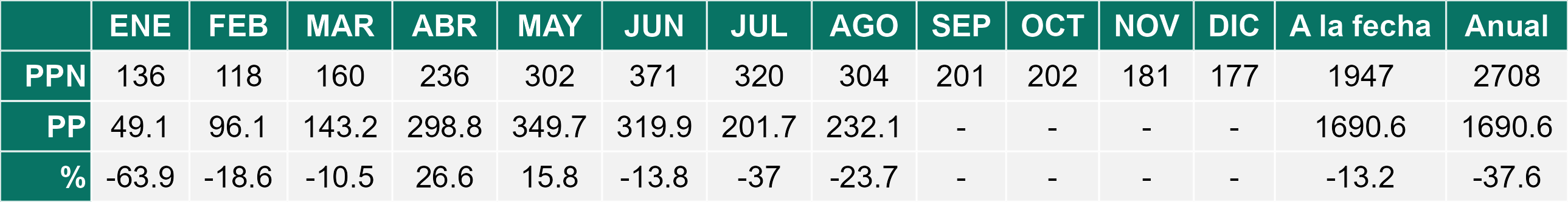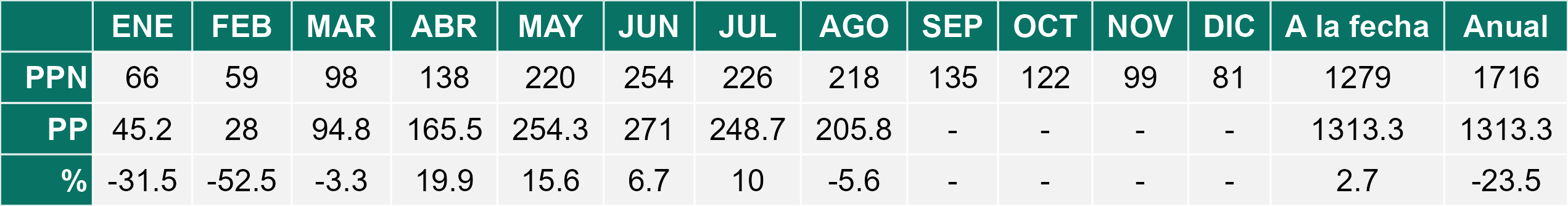La estación Pid-Pid corresponde al distrito agroclimático 10-4. Para este distrito climático la temperatura mínima, media y máxima climatológicas alcanzan los 3.2°C, 7.2°C y 11.2°C respectivamente. Por su parte, respecto a las temperaturas medidas durante el mes de agosto en la estación: la temperatura mínima alcanzo los 4.4°C (1.2°C sobre la climatológica), la temperatura media 8.3°C (1.1°C sobre la climatológica) y la temperatura máxima llegó a los 12.2°C (1°C sobre la climatológica). En el mes de agosto se registró una pluviometría de 156.2 mm, lo cual representa un 59.6% con respecto al mismo mes de un año normal. De enero a agosto se ha registrado un total acumulado de 1226.2 mm, en circunstancias que un año normal registraría a la fecha 1458 mm, lo que representa un déficit de 15.9%. A la misma fecha, durante el año 2024 la precipitación alcanzaba los 194.7 mm.