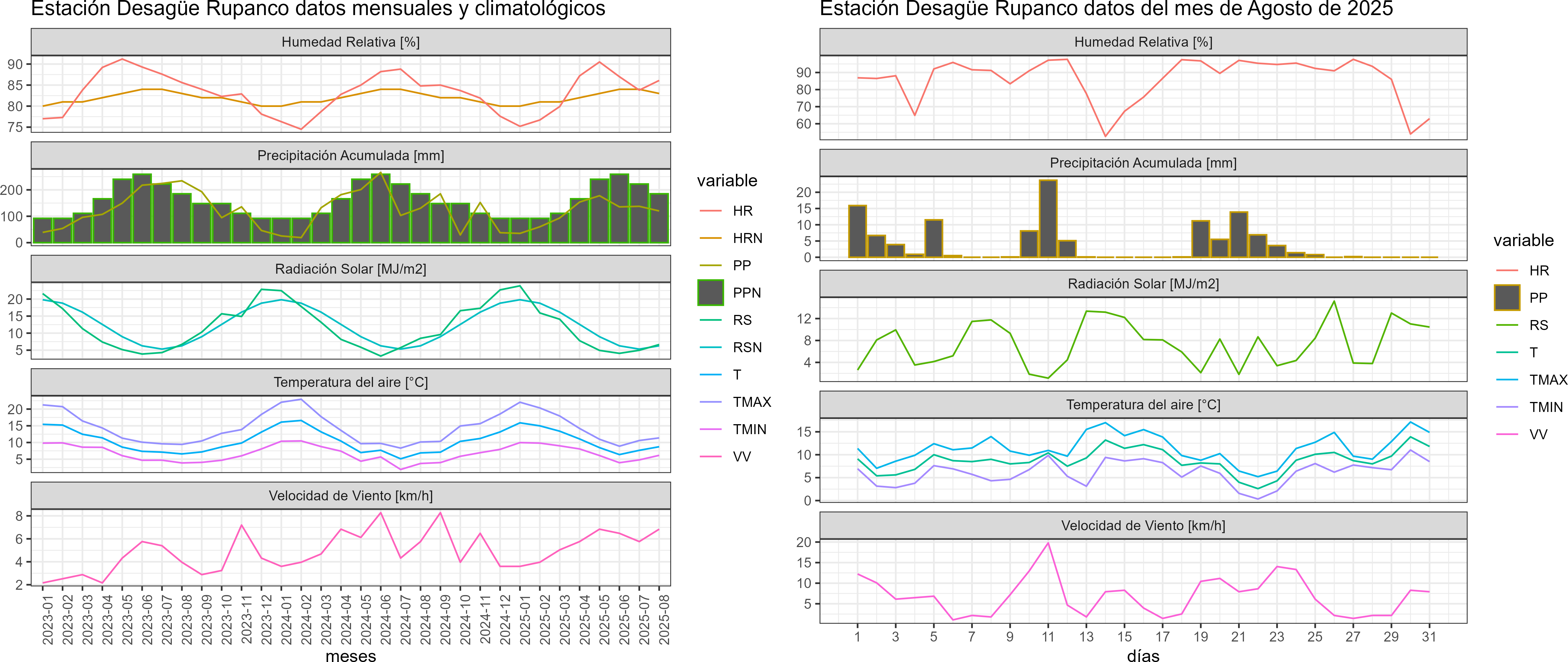 La estación Desagüe Rupanco corresponde al distrito agroclimático 14-10-3. Para este distrito climático la temperatura mínima, media y máxima climatológicas alcanzan los 3.9°C, 7.6°C y 11.2°C respectivamente. Por su parte, respecto a las temperaturas medidas durante el mes de agosto en la estación: la temperatura mínima alcanzo los 6.2°C (2.3°C sobre la climatológica), la temperatura media 8.7°C (1.1°C sobre la climatológica) y la temperatura máxima llegó a los 11.4°C (0.2°C sobre la climatológica). En el mes de agosto se registró una pluviometría de 120.1 mm, lo cual representa un 50% con respecto al mismo mes de un año normal. De enero a agosto se ha registrado un total acumulado de 913.5 mm, en circunstancias que un año normal registraría a la fecha 1432 mm, lo que representa un déficit de 36.2%. A la misma fecha, durante el año 2024 la precipitación alcanzaba los 130.5 mm.