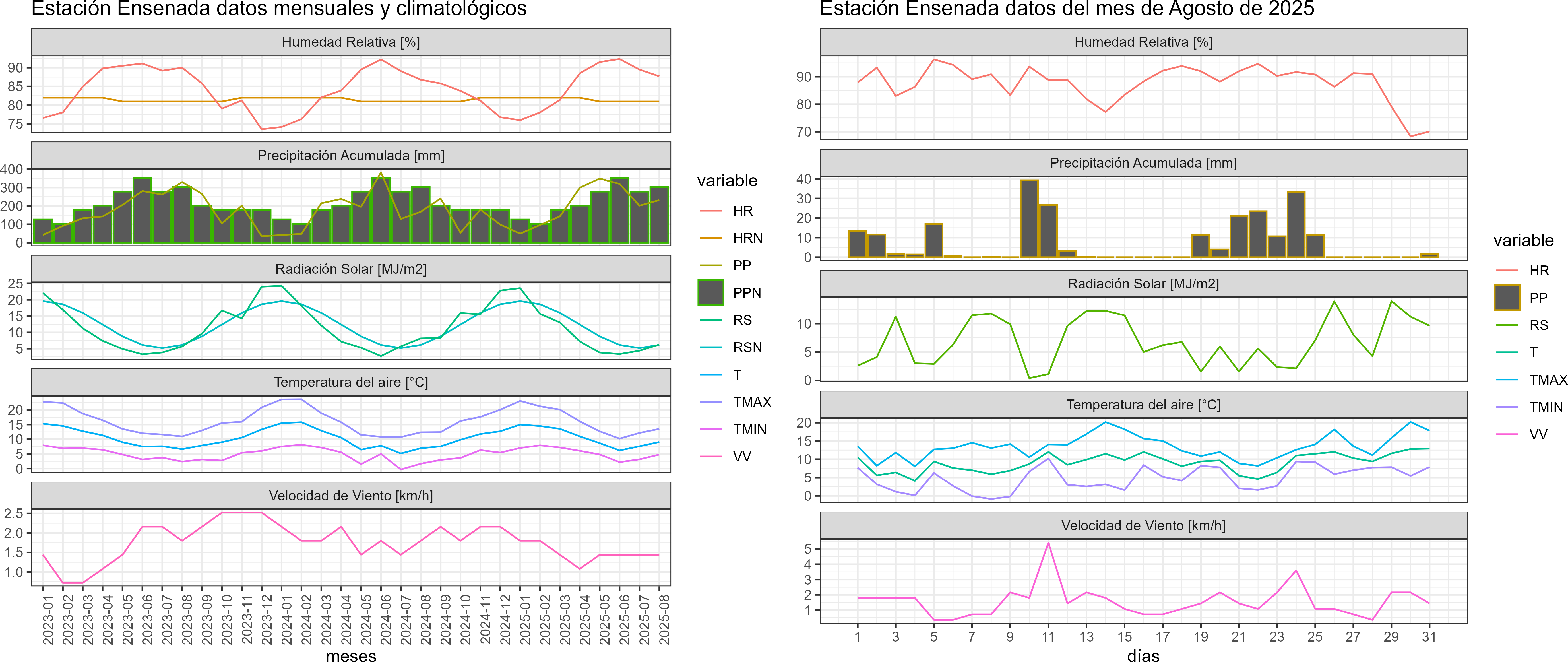 La estación Ensenada corresponde al distrito agroclimático 14-10-4. Para este distrito climático la temperatura mínima, media y máxima climatológicas alcanzan los 3.9°C, 7.4°C y 11°C respectivamente. Por su parte, respecto a las temperaturas medidas durante el mes de agosto en la estación: la temperatura mínima alcanzo los 4.8°C (0.9°C sobre la climatológica), la temperatura media 9.1°C (1.7°C sobre la climatológica) y la temperatura máxima llegó a los 13.5°C (2.5°C sobre la climatológica). En el mes de agosto se registró una pluviometría de 232.1 mm, lo cual representa un 76.3% con respecto al mismo mes de un año normal. De enero a agosto se ha registrado un total acumulado de 1690.6 mm, en circunstancias que un año normal registraría a la fecha 1947 mm, lo que representa un déficit de 13.2%. A la misma fecha, durante el año 2024 la precipitación alcanzaba los 168.5 mm.