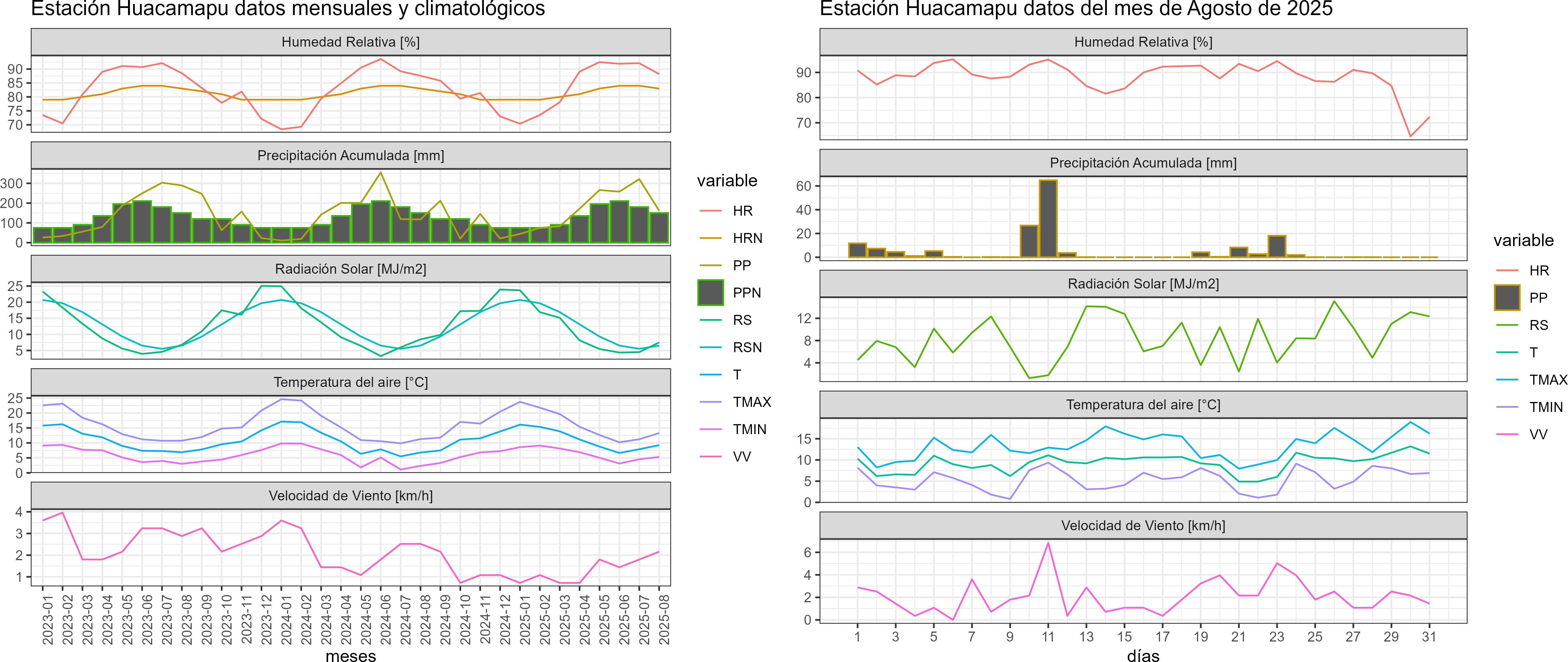La estación Huacamapu corresponde al distrito agroclimático 14-10-1. Para este distrito climático la temperatura mínima, media y máxima climatológicas alcanzan los 3.4°C, 7.2°C y 11.1°C respectivamente. Por su parte, respecto a las temperaturas medidas durante el mes de agosto en la estación: la temperatura mínima alcanzo los 5.3°C (1.9°C sobre la climatológica), la temperatura media 9.3°C (2.1°C sobre la climatológica) y la temperatura máxima llegó a los 13.3°C (2.2°C sobre la climatológica). En el mes de agosto se registró una pluviometría de 161.4 mm, lo cual representa un 64% con respecto al mismo mes de un año normal. De enero a agosto se ha registrado un total acumulado de 1379.9 mm, en circunstancias que un año normal registraría a la fecha 1457 mm, lo que representa un déficit de 5.3%. A la misma fecha, durante el año 2024 la precipitación alcanzaba los 117.6 mm.
