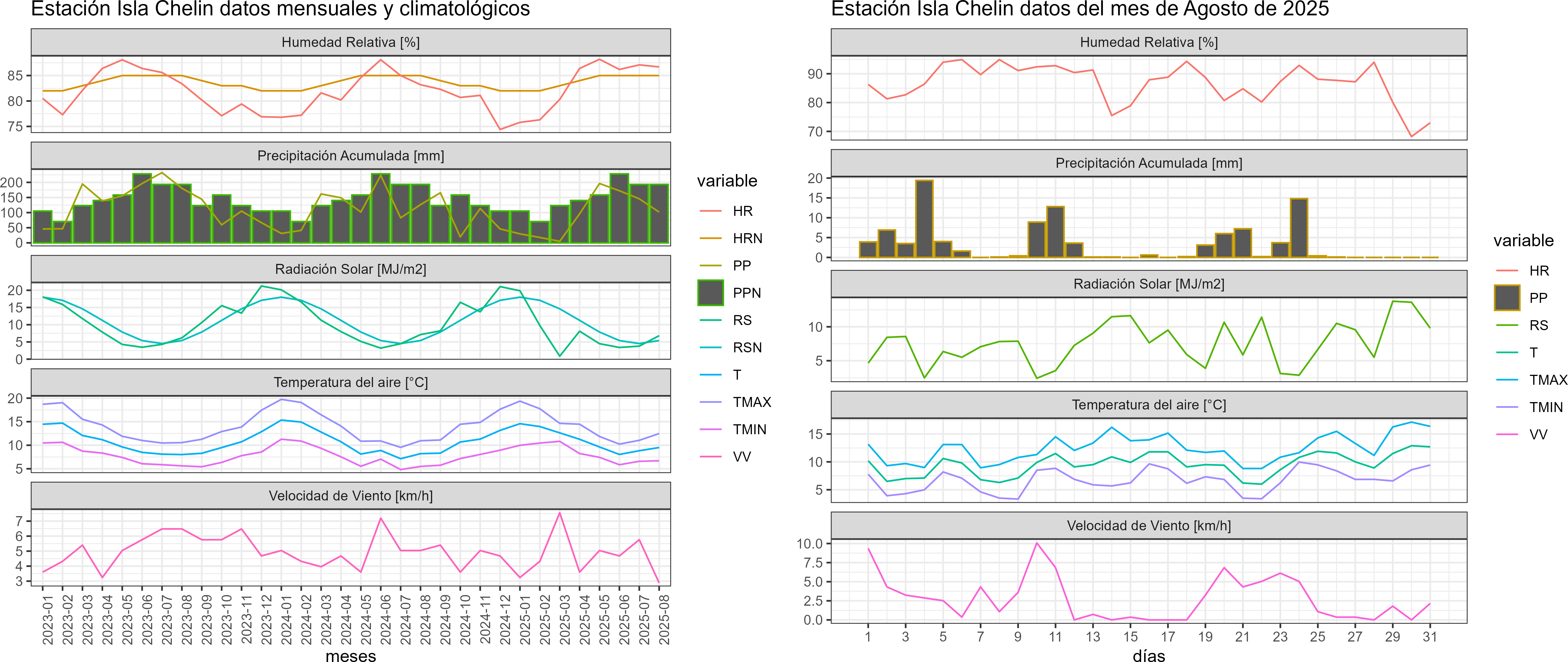 La estación Isla Chelin corresponde al distrito agroclimático 10-4. Para este distrito climático la temperatura mínima, media y máxima climatológicas alcanzan los 4.5°C, 7.7°C y 10.8°C respectivamente. Por su parte, respecto a las temperaturas medidas durante el mes de agosto en la estación: la temperatura mínima alcanzo los 6.7°C (2.2°C sobre la climatológica), la temperatura media 9.5°C (1.8°C sobre la climatológica) y la temperatura máxima llegó a los 12.5°C (1.7°C sobre la climatológica). En el mes de agosto se registró una pluviometría de 101.6 mm, lo cual representa un 50.3% con respecto al mismo mes de un año normal. De enero a agosto se ha registrado un total acumulado de 764.3 mm, en circunstancias que un año normal registraría a la fecha 1174 mm, lo que representa un déficit de 34.9%. A la misma fecha, durante el año 2024 la precipitación alcanzaba los 126.3 mm.