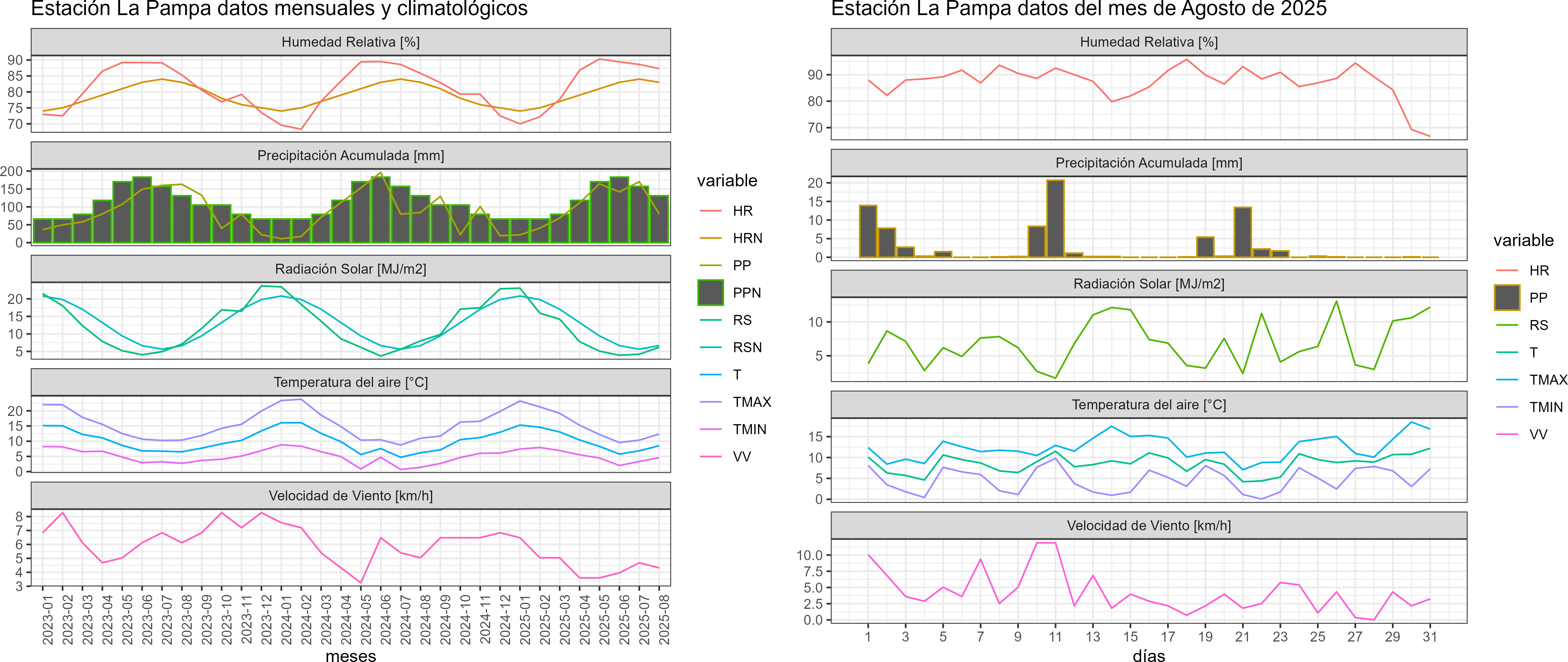 La estación La Pampa corresponde al distrito agroclimático 14-10-2. Para este distrito climático la temperatura mínima, media y máxima climatológicas alcanzan los 3.5°C, 7.5°C y 11.6°C respectivamente. Por su parte, respecto a las temperaturas medidas durante el mes de agosto en la estación: la temperatura mínima alcanzo los 4.6°C (1.1°C sobre la climatológica), la temperatura media 8.5°C (1°C sobre la climatológica) y la temperatura máxima llegó a los 12.4°C (0.8°C sobre la climatológica). En el mes de agosto se registró una pluviometría de 80.6 mm, lo cual representa un 40.5% con respecto al mismo mes de un año normal. De enero a agosto se ha registrado un total acumulado de 799.5 mm, en circunstancias que un año normal registraría a la fecha 1167 mm, lo que representa un déficit de 31.5%. A la misma fecha, durante el año 2024 la precipitación alcanzaba los 84.3 mm.