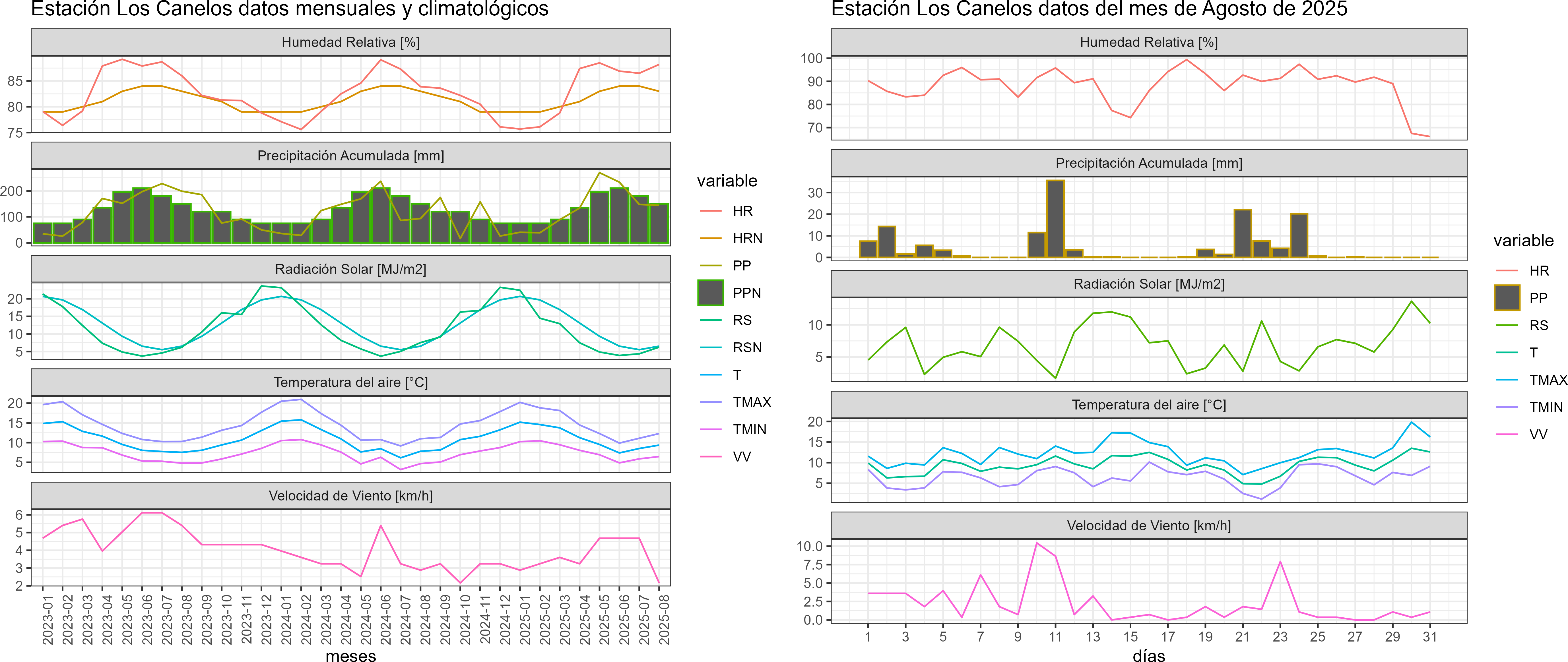 La estación Los Canelos corresponde al distrito agroclimático 14-10-1. Para este distrito climático la temperatura mínima, media y máxima climatológicas alcanzan los 3.5°C, 7.6°C y 11.6°C respectivamente. Por su parte, respecto a las temperaturas medidas durante el mes de agosto en la estación: la temperatura mínima alcanzo los 6.5°C (3°C sobre la climatológica), la temperatura media 9.4°C (1.8°C sobre la climatológica) y la temperatura máxima llegó a los 12.3°C (0.7°C sobre la climatológica). En el mes de agosto se registró una pluviometría de 144.4 mm, lo cual representa un 79.8% con respecto al mismo mes de un año normal. De enero a agosto se ha registrado un total acumulado de 1097.3 mm, en circunstancias que un año normal registraría a la fecha 1095 mm, lo que representa un superávit de 0.2%. A la misma fecha, durante el año 2024 la precipitación alcanzaba los 93.5 mm.